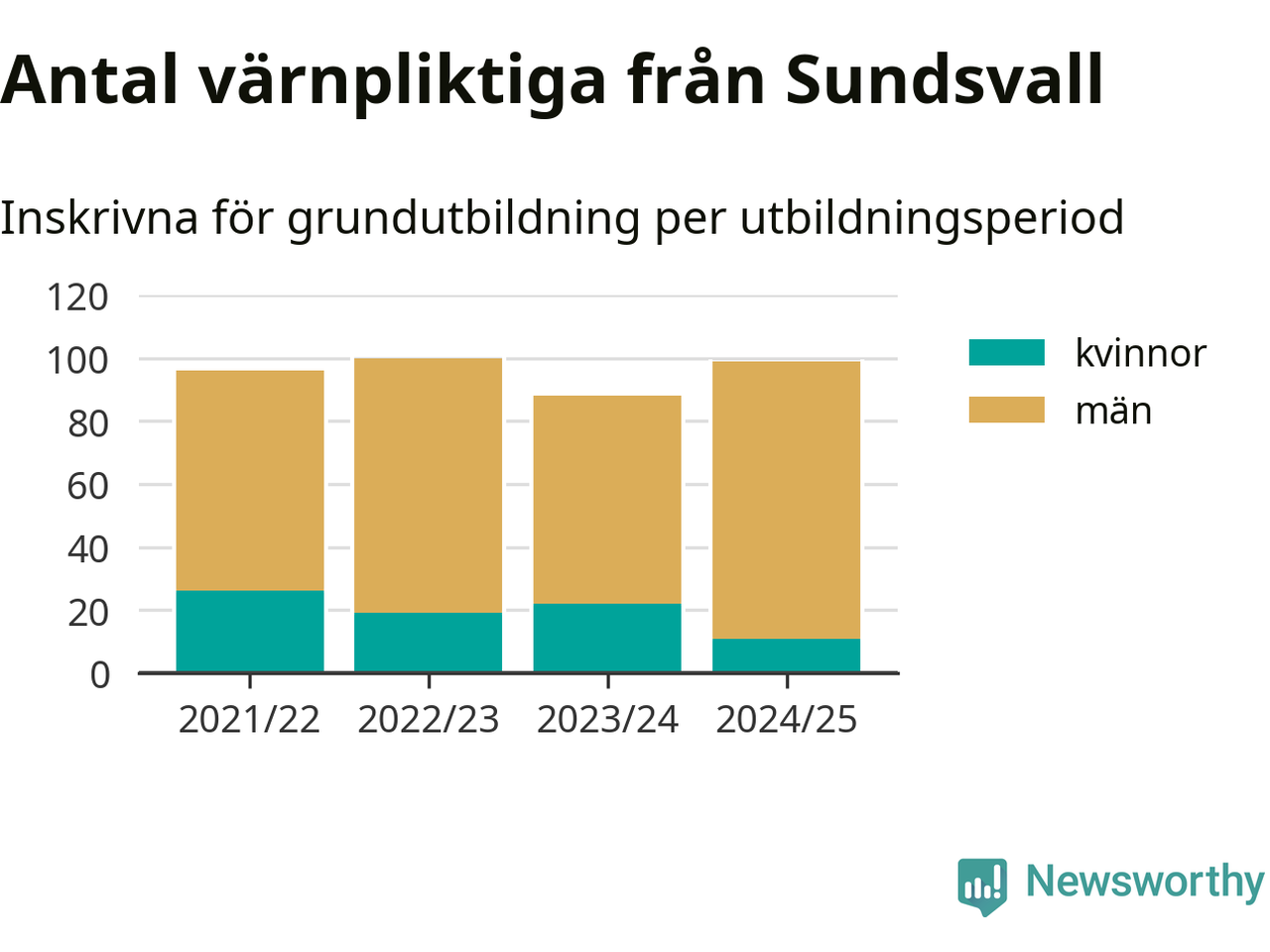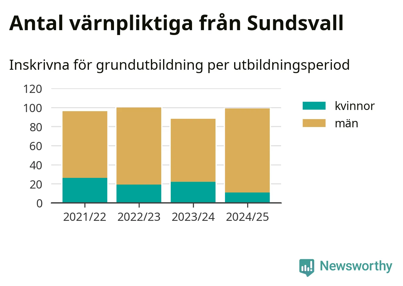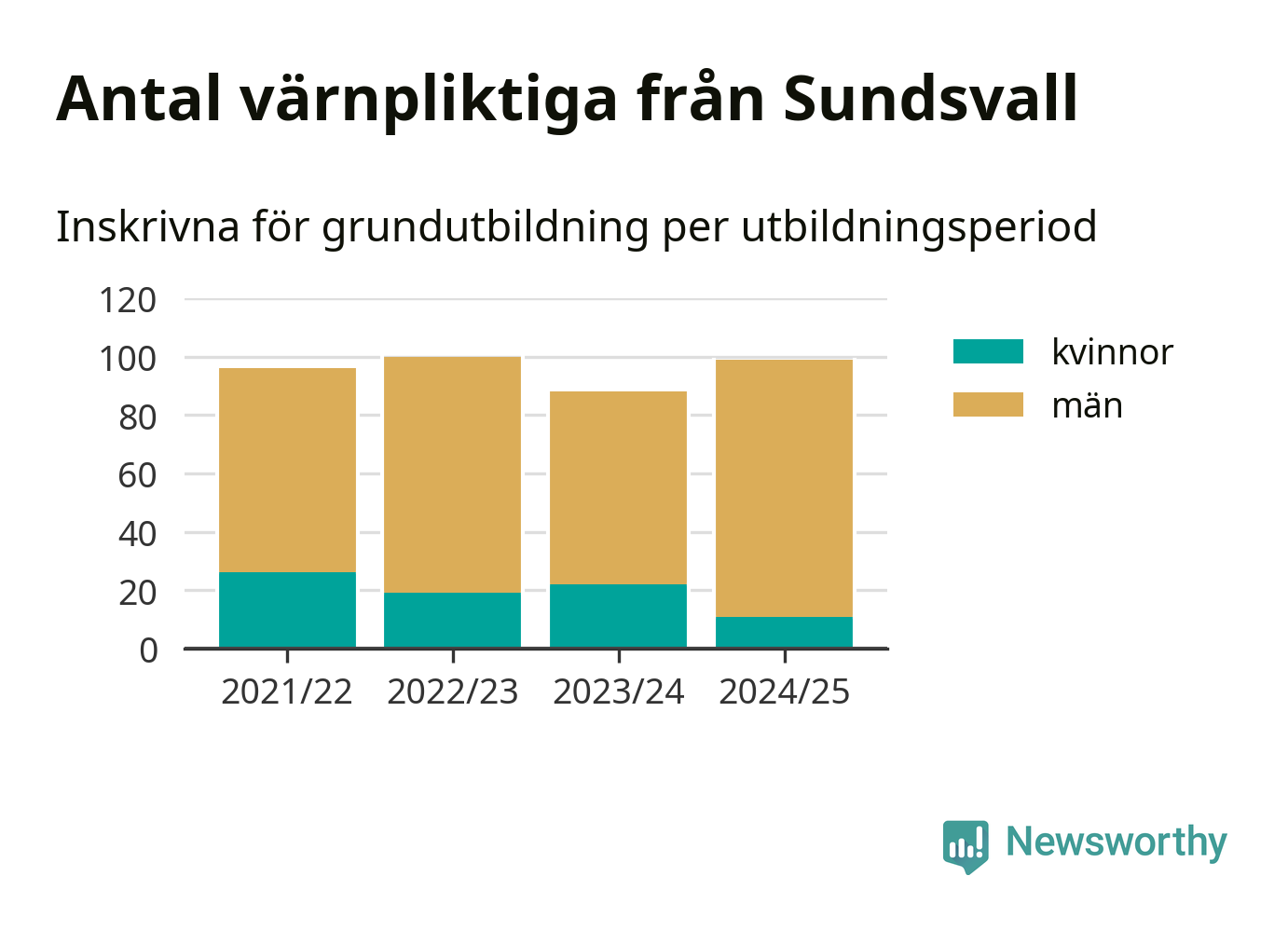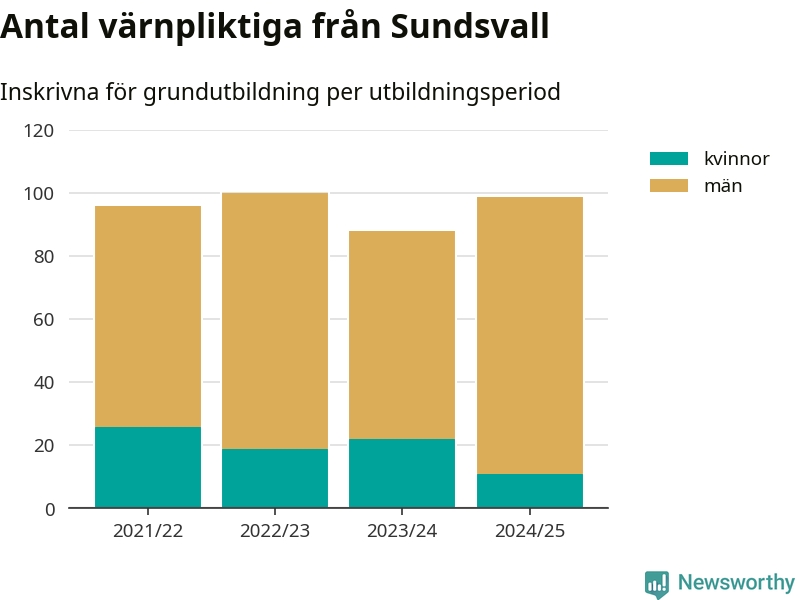 99 värnpliktiga från Sundsvall har skrivits in för att göra lumpen under innevarande utbildningsperiod, som sträcker sig från juni 2024 till och med första halvåret 2025. Det är elva färre än året innan. Den allmänna värnplikten återinfördes 2018 och vi har siffror nedbrutna på kommunnivå sedan 2021/22. Som mest har 100 personer från Sundsvall skrivits in, utbildningsperioden 2022/23.