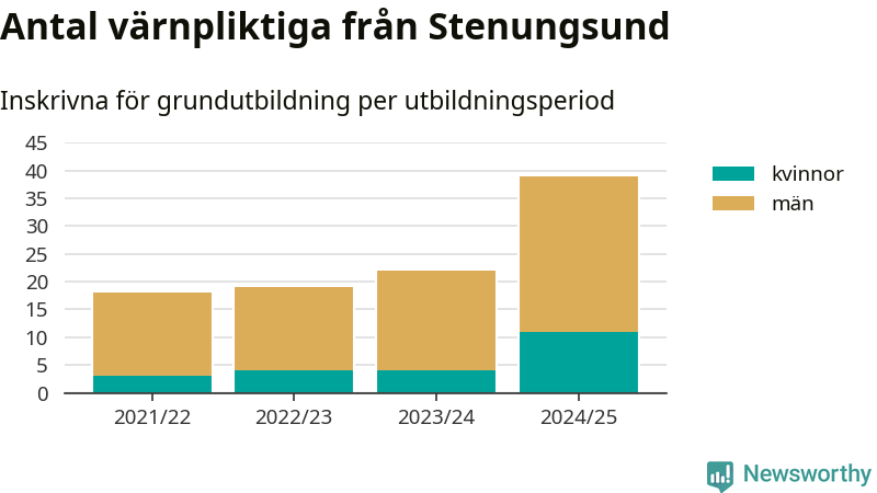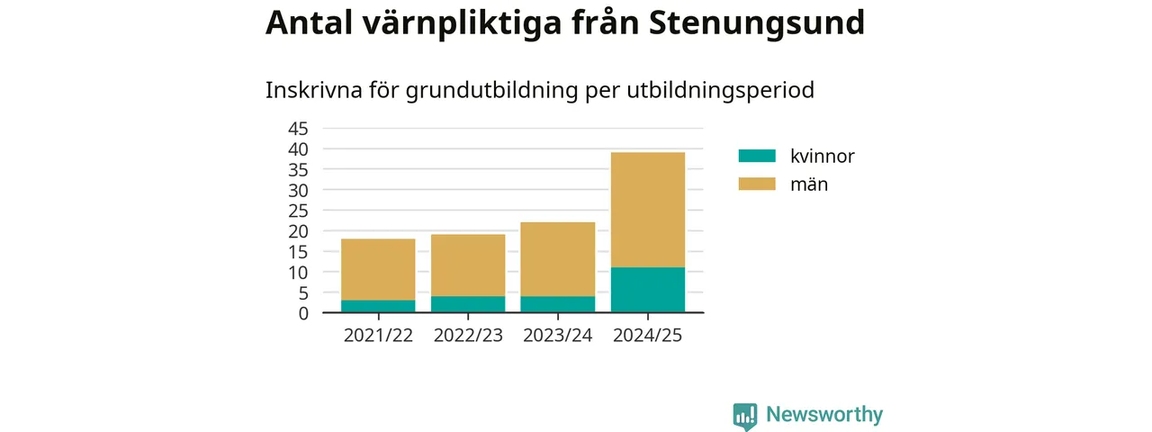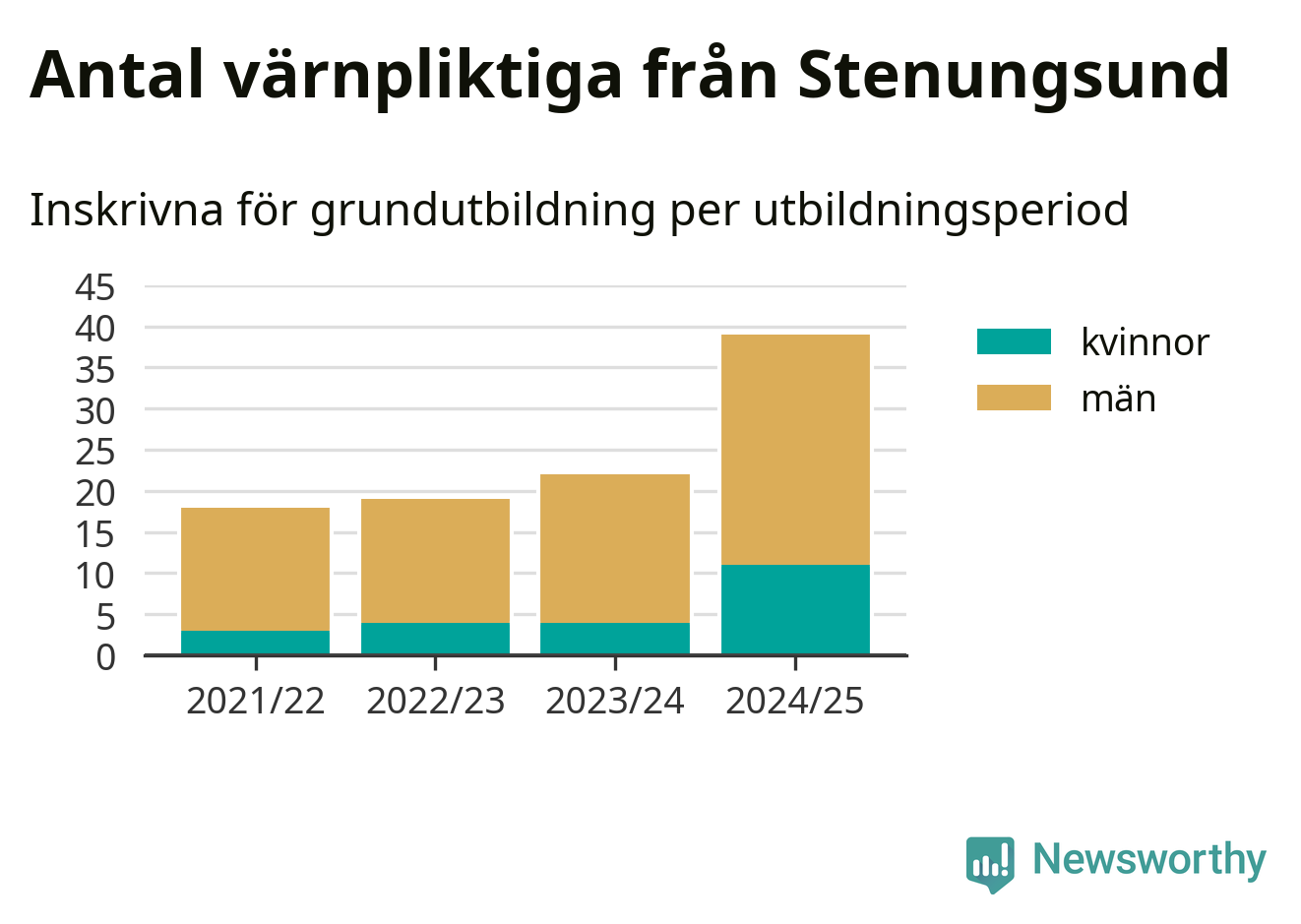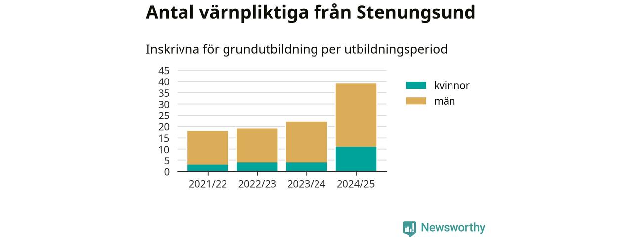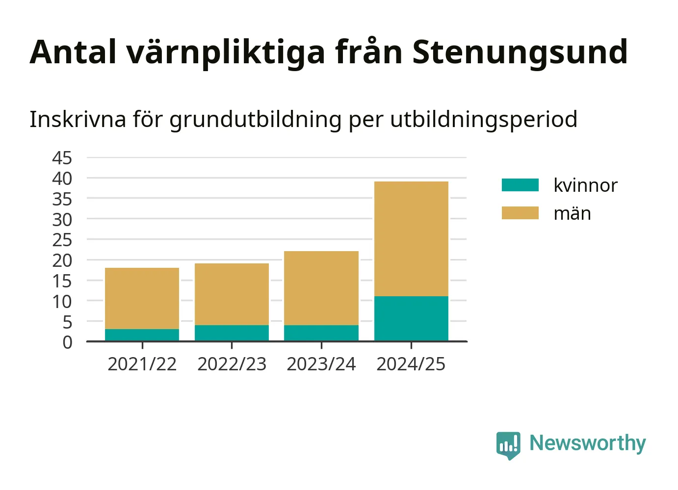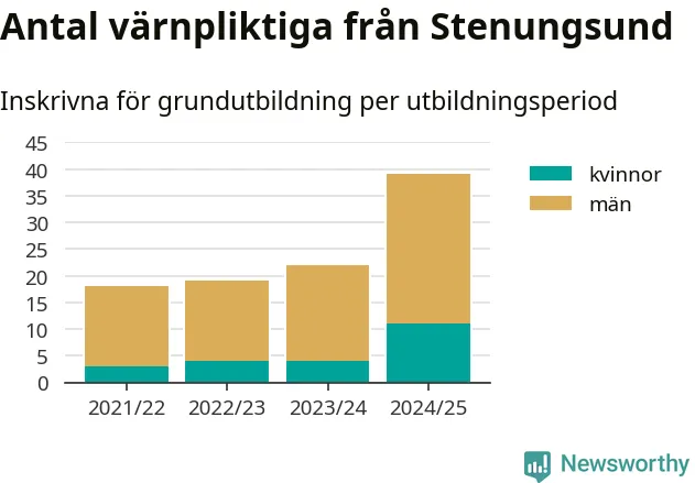 Antalet värnpliktiga från Stenungsund ökar stadigt, visar siffror från Plikt- och prövningsverket. Under det här värnpliktsåret, med utbildningsstart från juni 2024 till början av 2025, är 39 värnpliktiga inskrivna för att påbörja sin grundutbildning. Det är den högsta siffran åtminstone sedan 2021/22, vilket är så långt bakåt vi har siffror på kommunnivå. Den allmänna värnplikten återinfördes 2018.