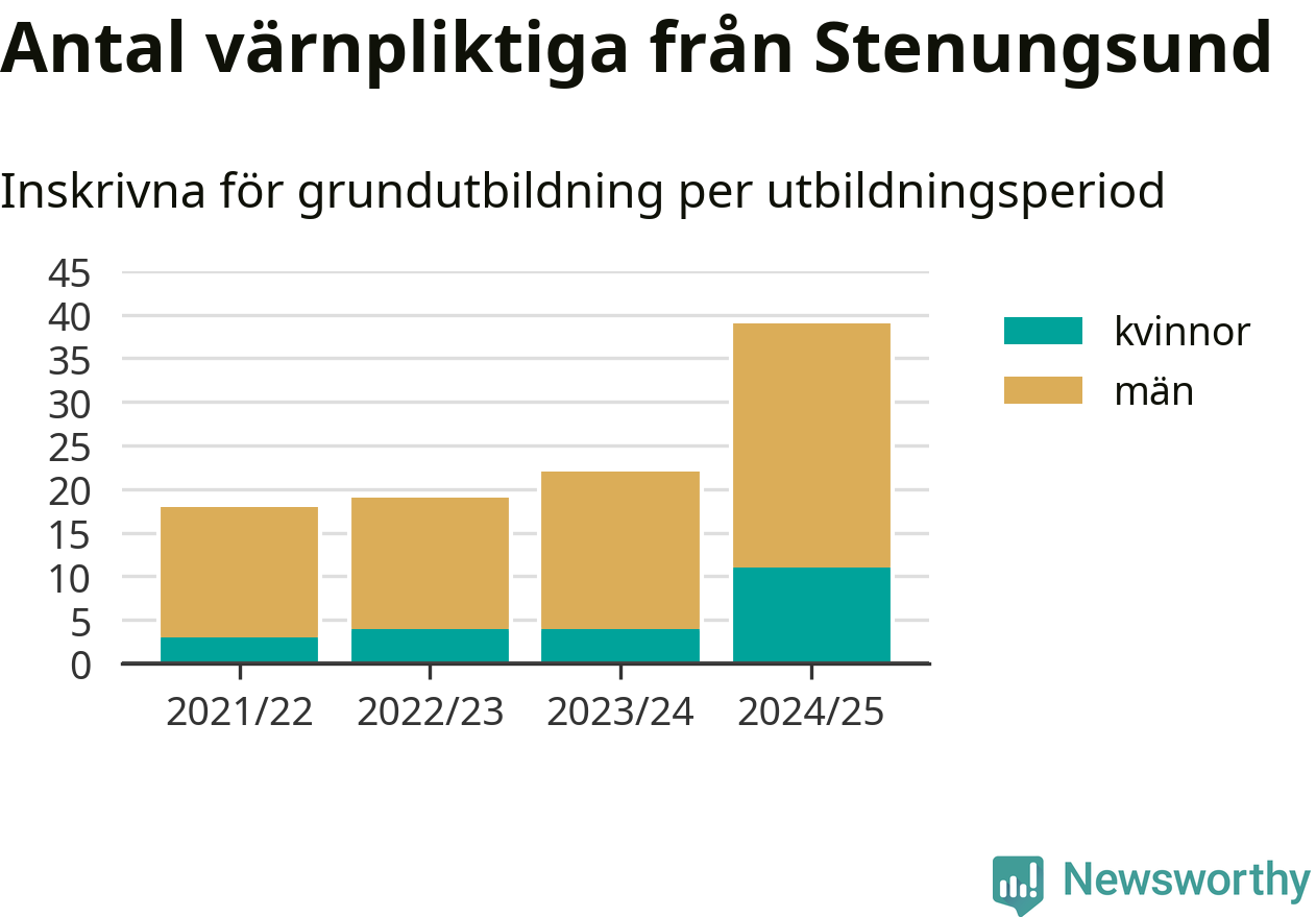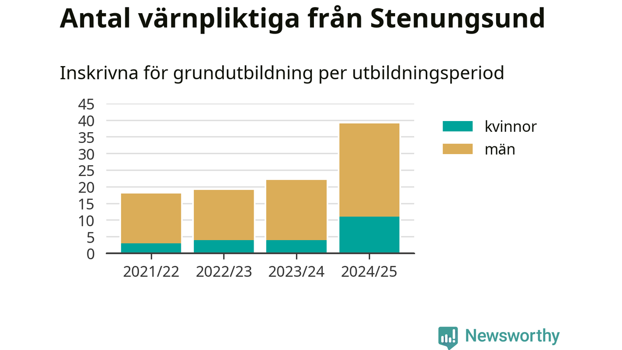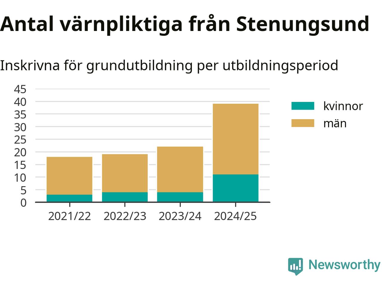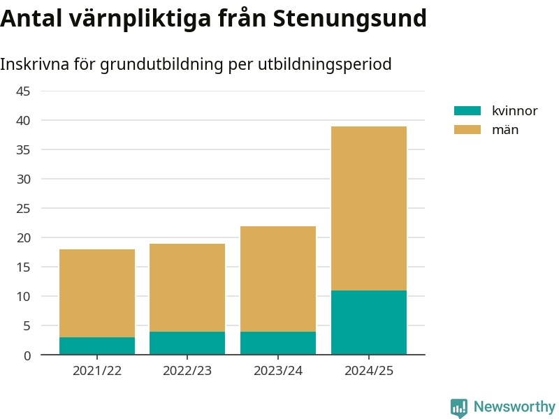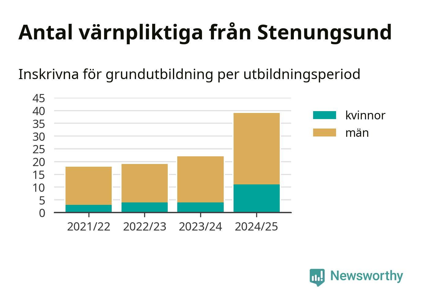Antalet värnpliktiga från Stenungsund ökar stadigt, visar siffror från Plikt- och prövningsverket. Under det här värnpliktsåret, med utbildningsstart från juni 2024 till början av 2025, är 39 värnpliktiga inskrivna för att påbörja sin grundutbildning. Det är den högsta siffran åtminstone sedan 2021/22, vilket är så långt bakåt vi har siffror på kommunnivå. Den allmänna värnplikten återinfördes 2018.