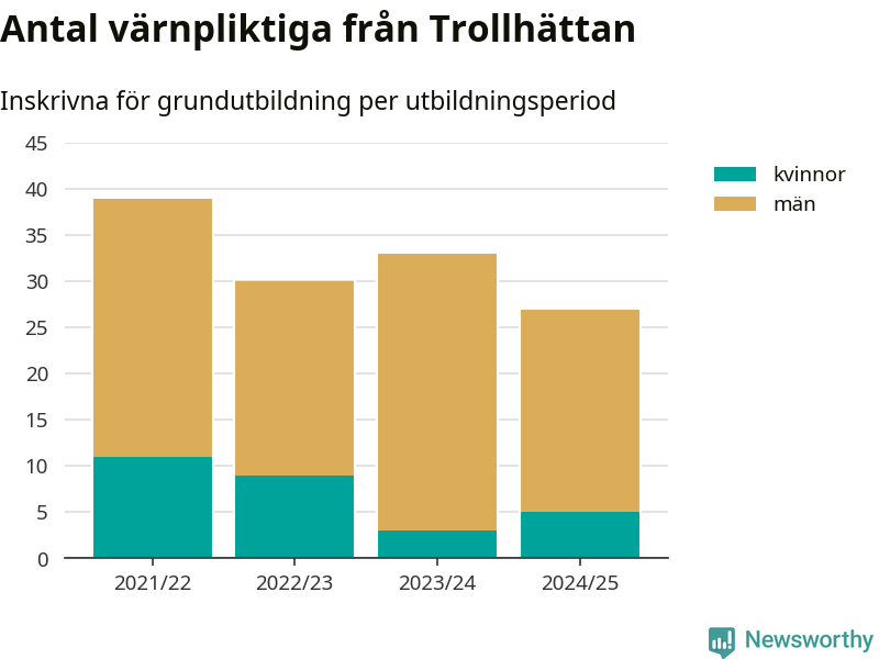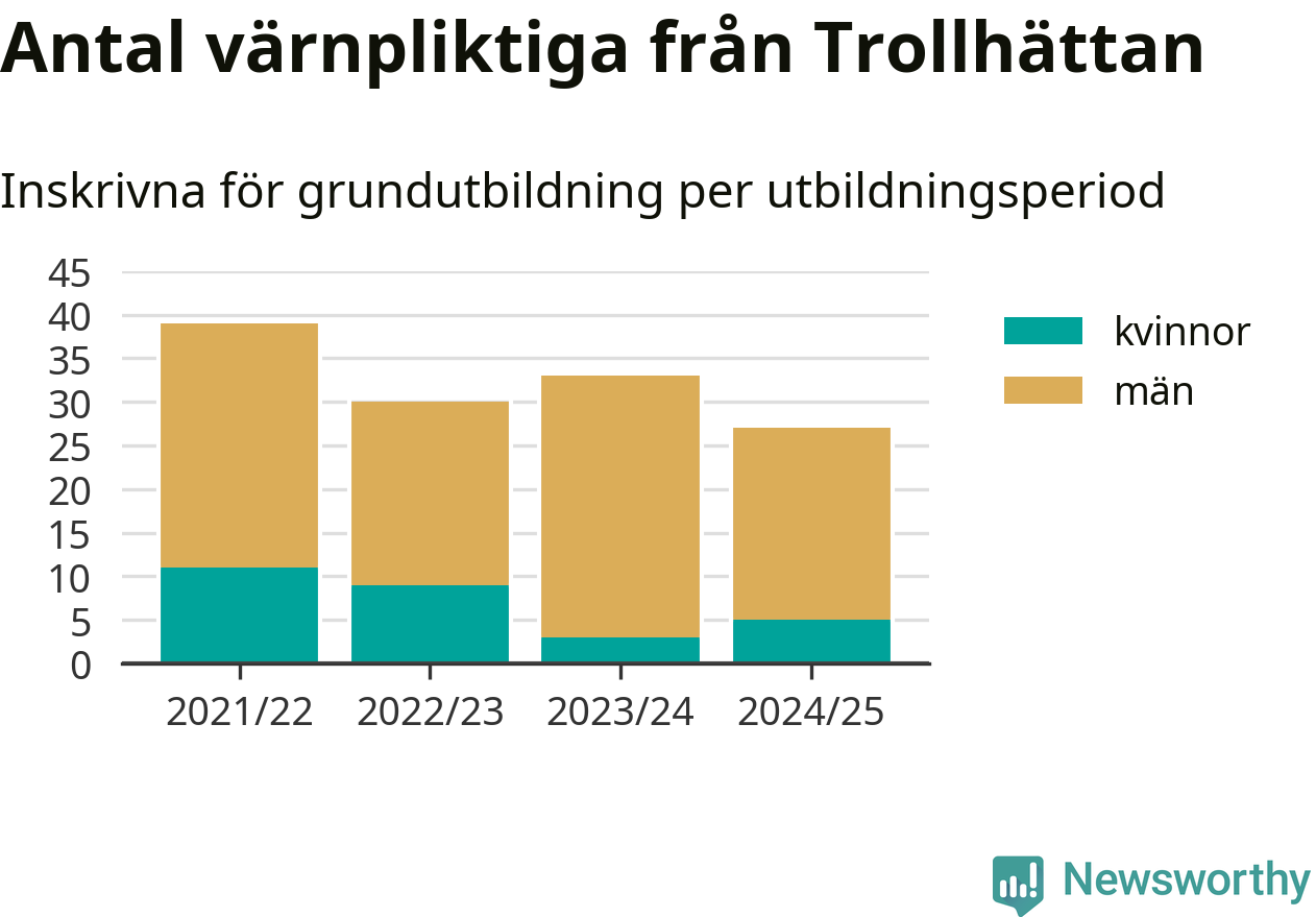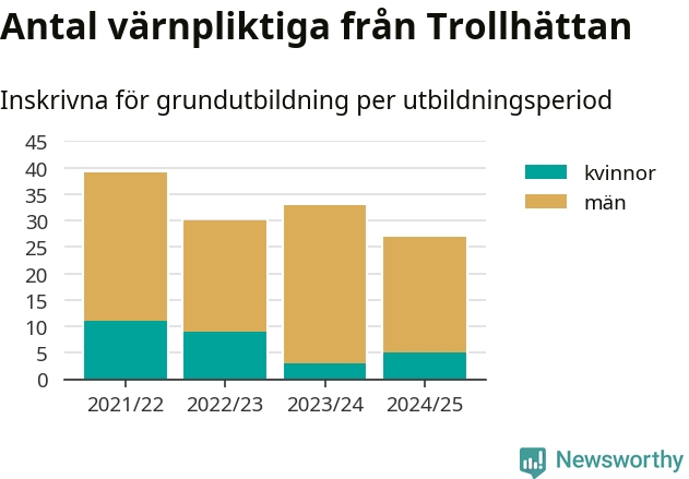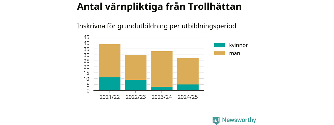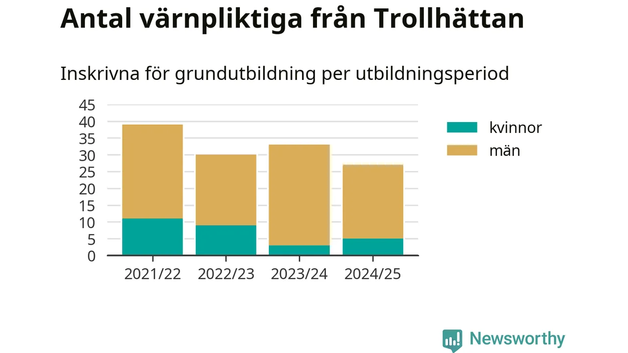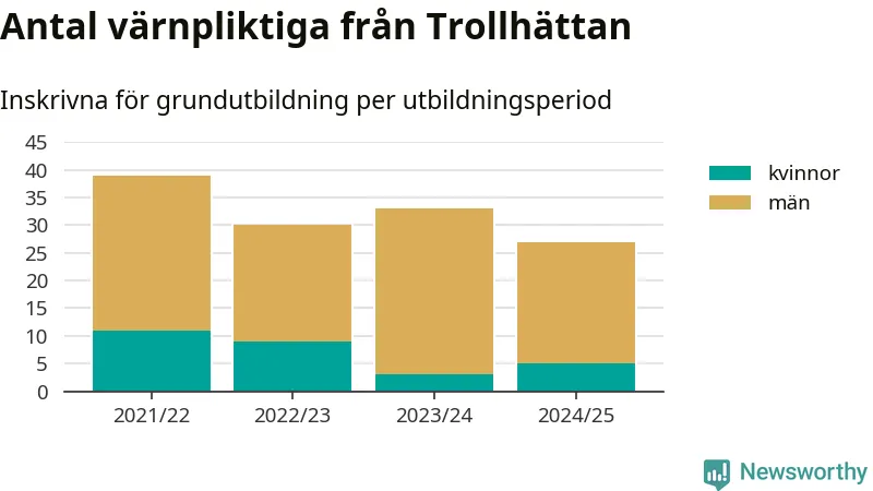 27 värnpliktiga från Trollhättan har skrivits in för att göra lumpen under innevarande utbildningsperiod, som sträcker sig från juni 2024 till och med första halvåret 2025. Det är två fler än året innan. Den allmänna värnplikten återinfördes 2018 och vi har siffror nedbrutna på kommunnivå sedan 2021/22. Som mest har 39 personer från Trollhättan skrivits in, utbildningsperioden 2021/22.