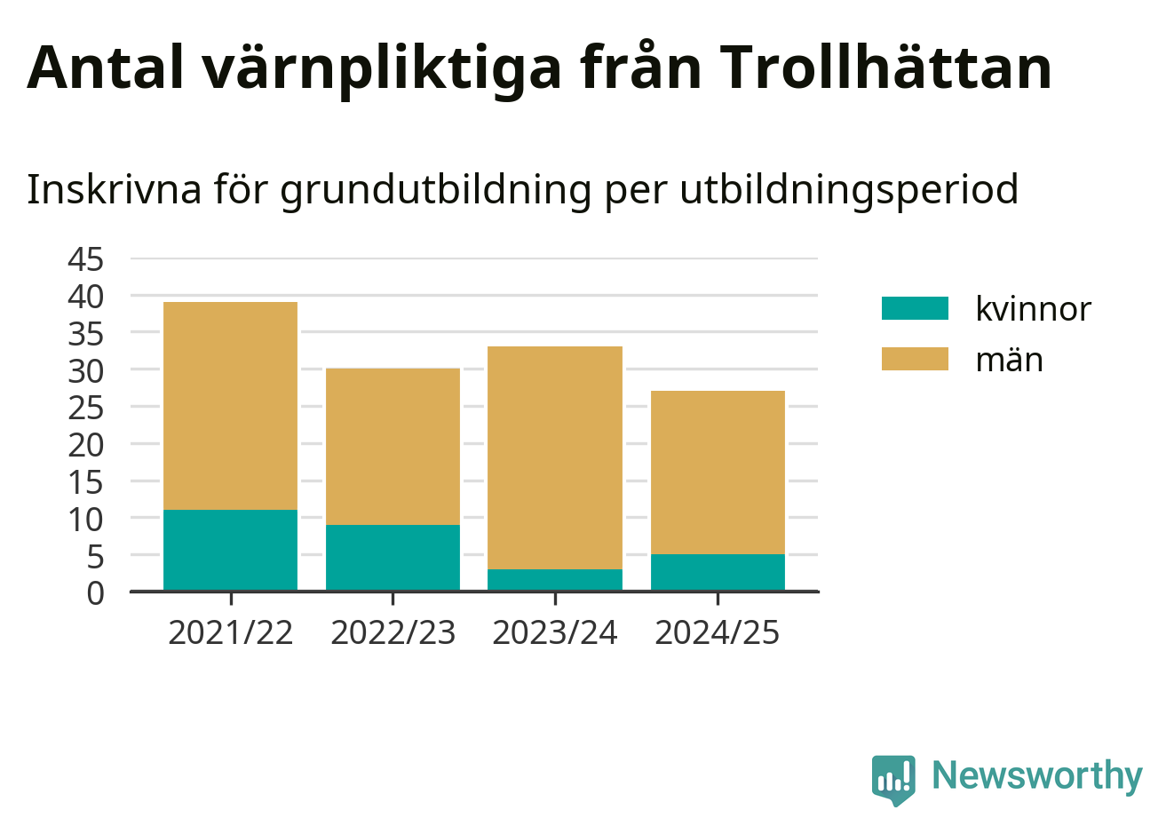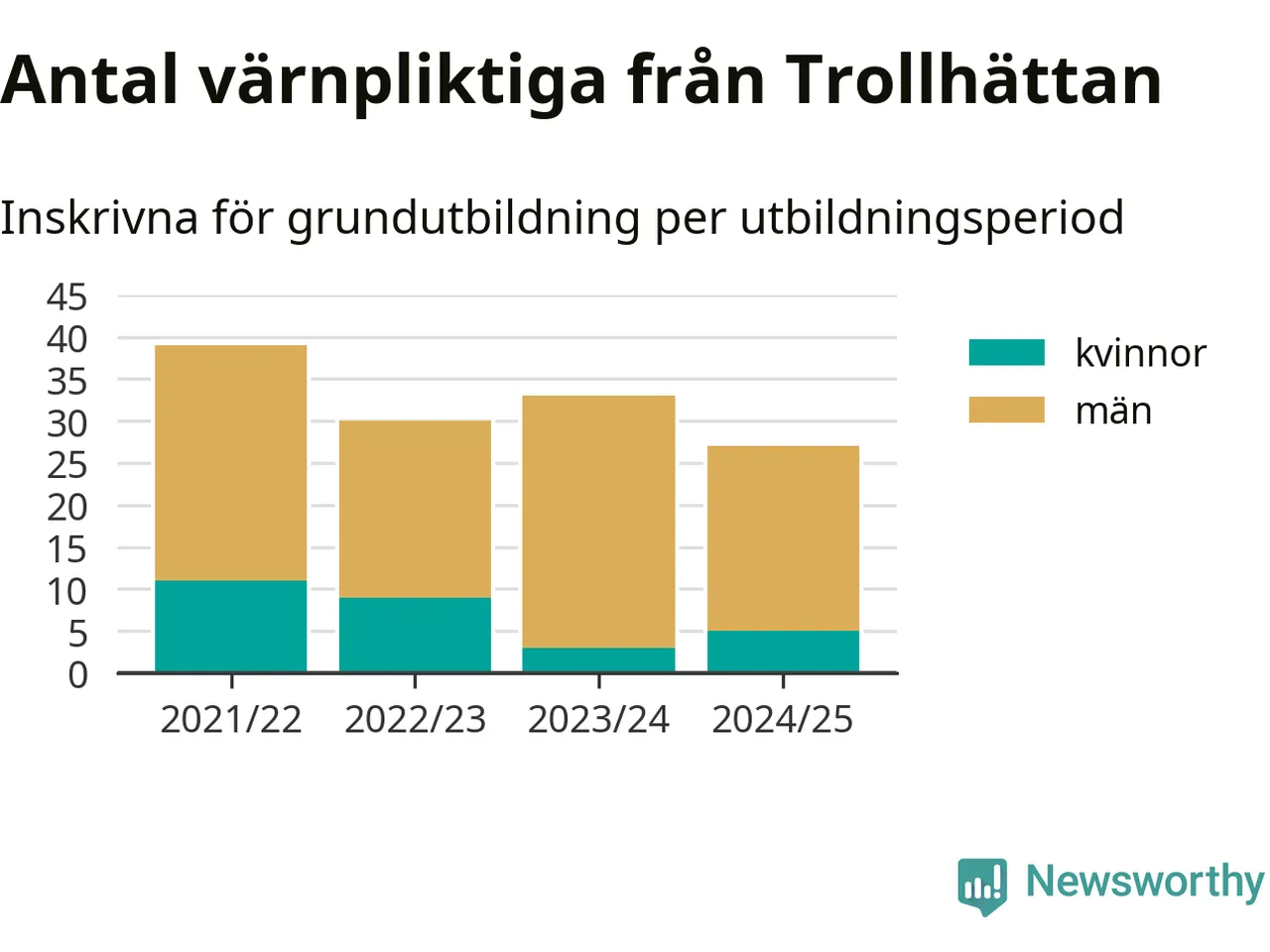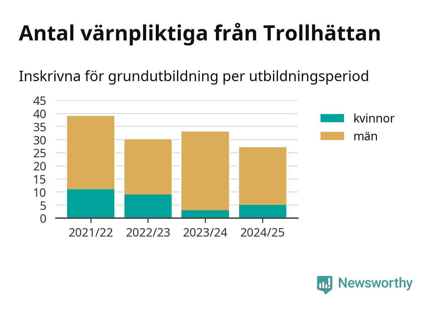 27 värnpliktiga från Trollhättan har skrivits in för att göra lumpen under innevarande utbildningsperiod, som sträcker sig från juni 2024 till och med första halvåret 2025. Det är två fler än året innan. Den allmänna värnplikten återinfördes 2018 och vi har siffror nedbrutna på kommunnivå sedan 2021/22. Som mest har 39 personer från Trollhättan skrivits in, utbildningsperioden 2021/22.