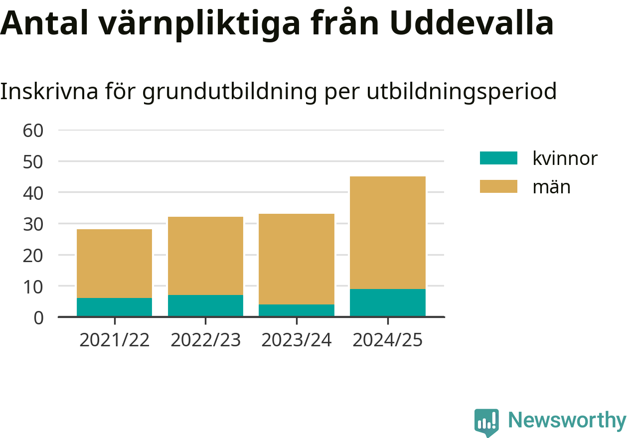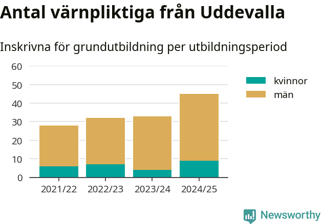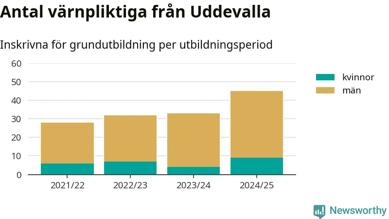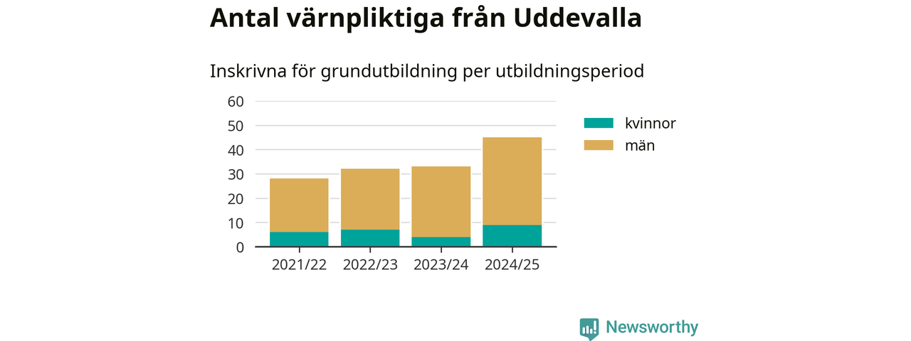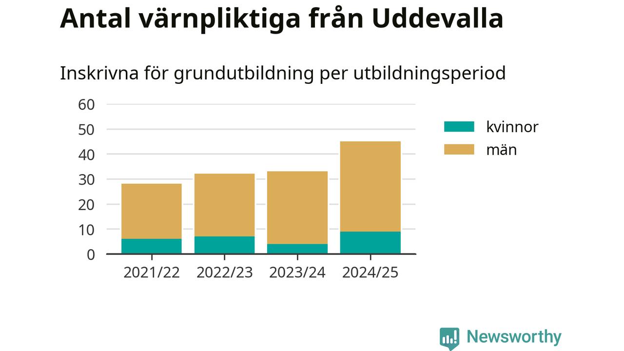 Antalet värnpliktiga från Uddevalla ökar stadigt, visar siffror från Plikt- och prövningsverket. Under det här värnpliktsåret, med utbildningsstart från juni 2024 till början av 2025, är 45 värnpliktiga inskrivna för att påbörja sin grundutbildning. Det är den högsta siffran åtminstone sedan 2021/22, vilket är så långt bakåt vi har siffror på kommunnivå. Den allmänna värnplikten återinfördes 2018.