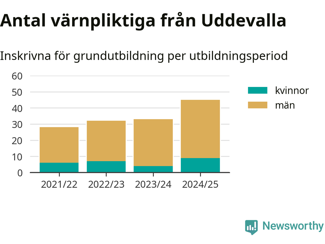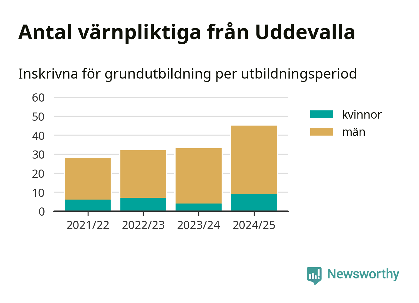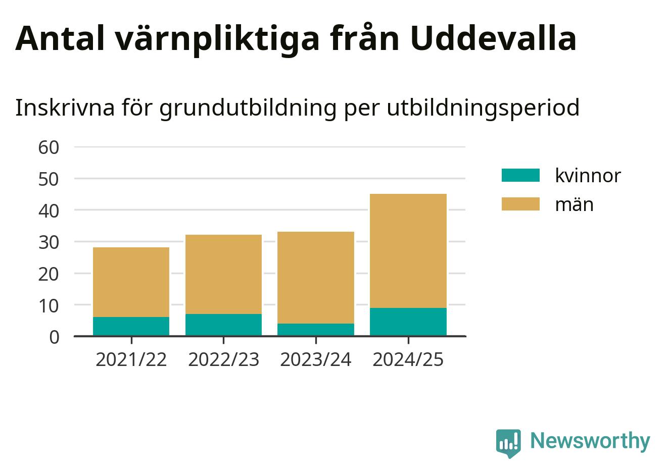 Antalet värnpliktiga från Uddevalla ökar stadigt, visar siffror från Plikt- och prövningsverket. Under det här värnpliktsåret, med utbildningsstart från juni 2024 till början av 2025, är 45 värnpliktiga inskrivna för att påbörja sin grundutbildning. Det är den högsta siffran åtminstone sedan 2021/22, vilket är så långt bakåt vi har siffror på kommunnivå. Den allmänna värnplikten återinfördes 2018.