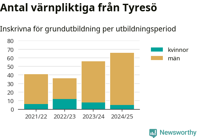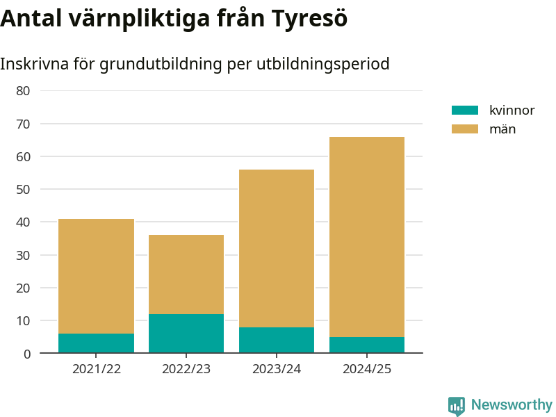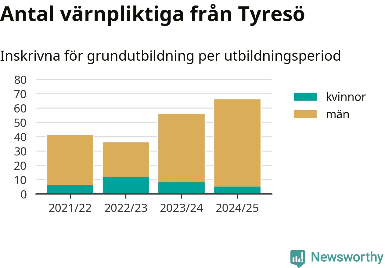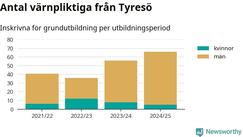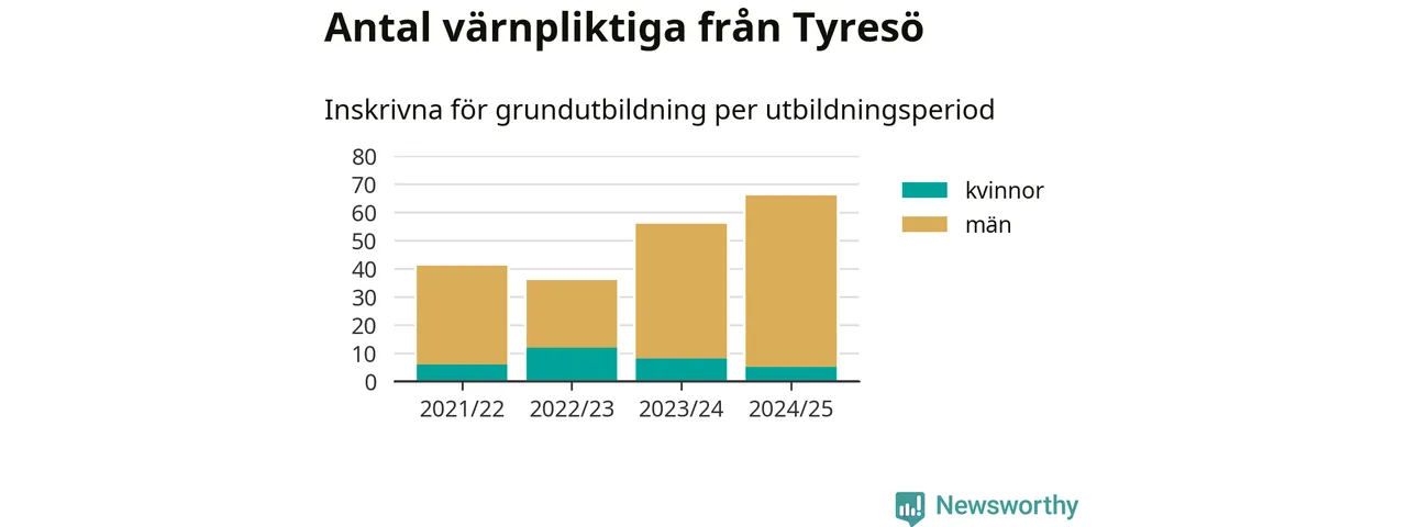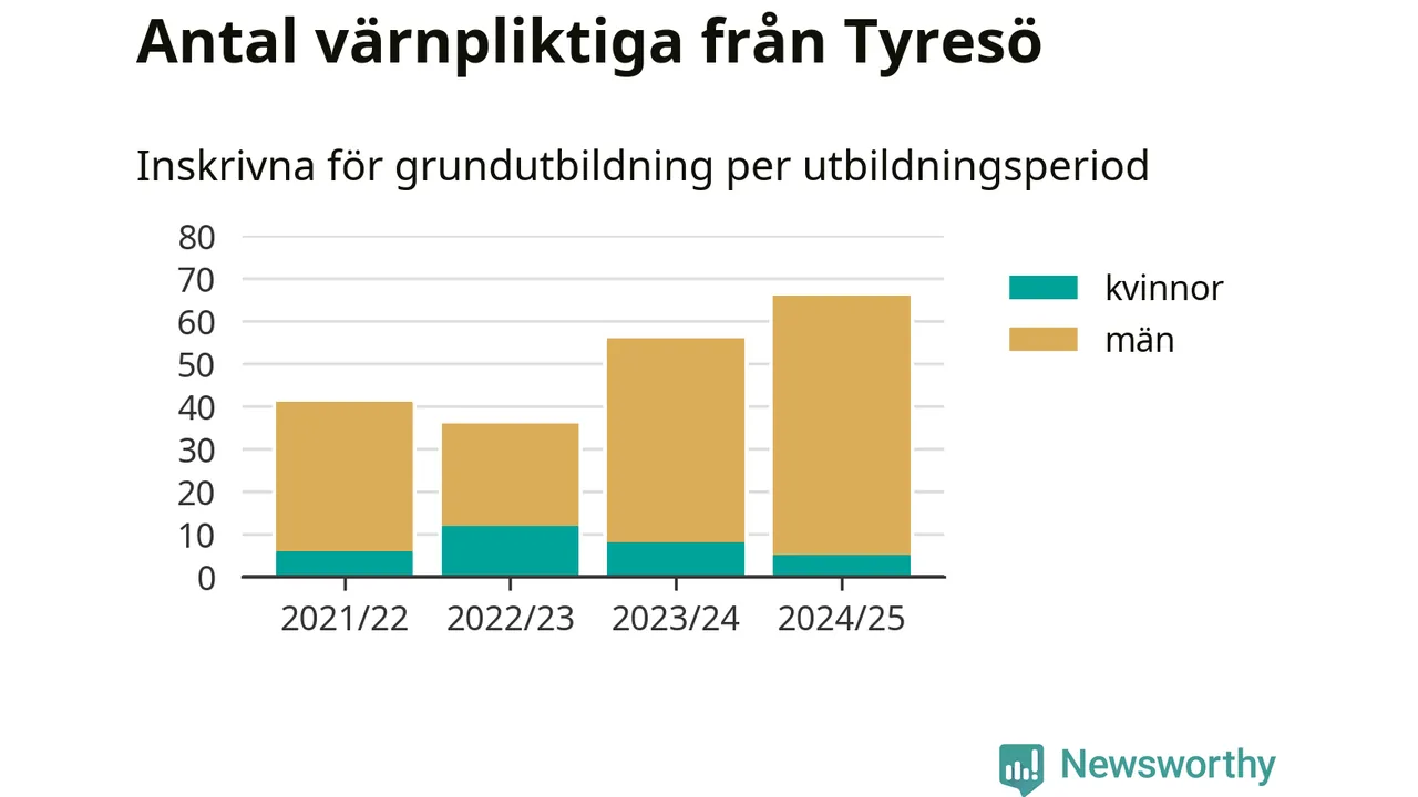 Antalet värnpliktiga från Tyresö ökar stadigt, visar siffror från Plikt- och prövningsverket. Under det här värnpliktsåret, med utbildningsstart från juni 2024 till början av 2025, är 66 värnpliktiga inskrivna för att påbörja sin grundutbildning. Det är den högsta siffran åtminstone sedan 2021/22, vilket är så långt bakåt vi har siffror på kommunnivå. Den allmänna värnplikten återinfördes 2018.