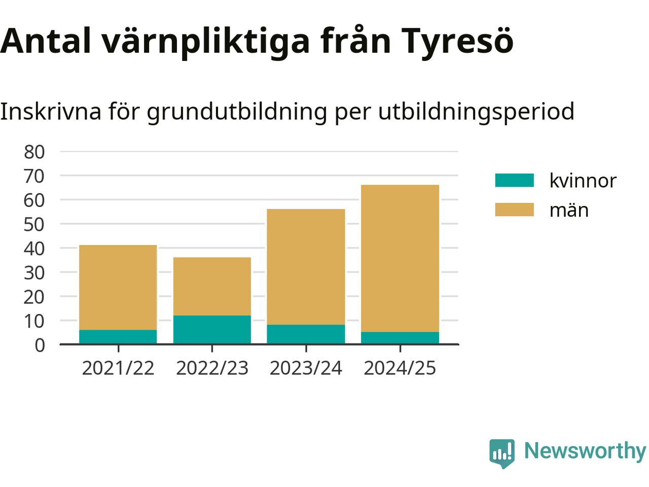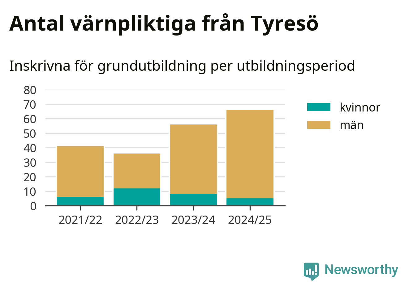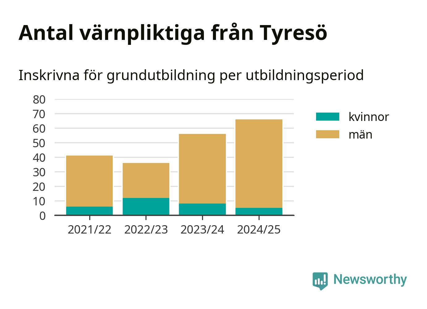 Antalet värnpliktiga från Tyresö ökar stadigt, visar siffror från Plikt- och prövningsverket. Under det här värnpliktsåret, med utbildningsstart från juni 2024 till början av 2025, är 66 värnpliktiga inskrivna för att påbörja sin grundutbildning. Det är den högsta siffran åtminstone sedan 2021/22, vilket är så långt bakåt vi har siffror på kommunnivå. Den allmänna värnplikten återinfördes 2018.