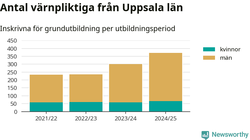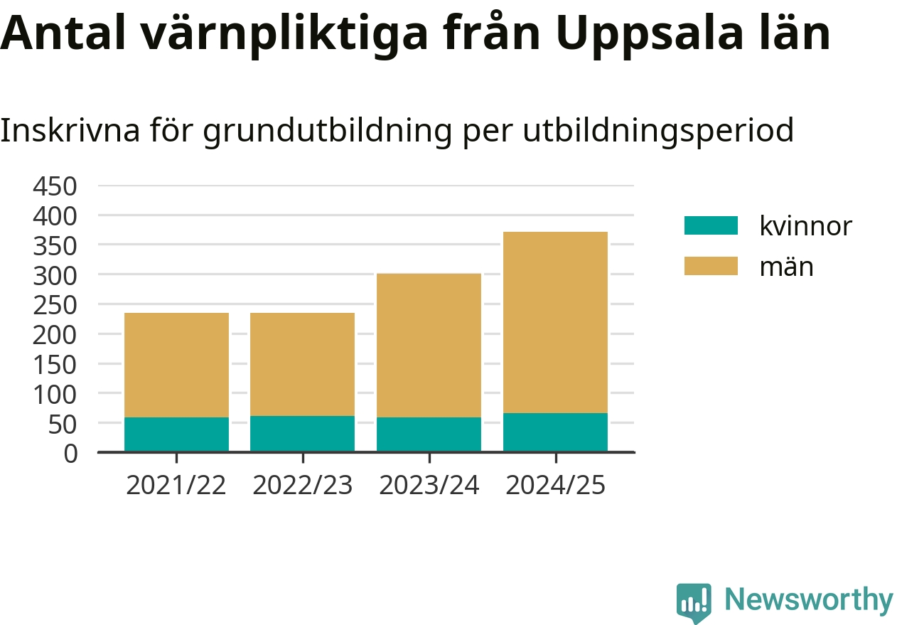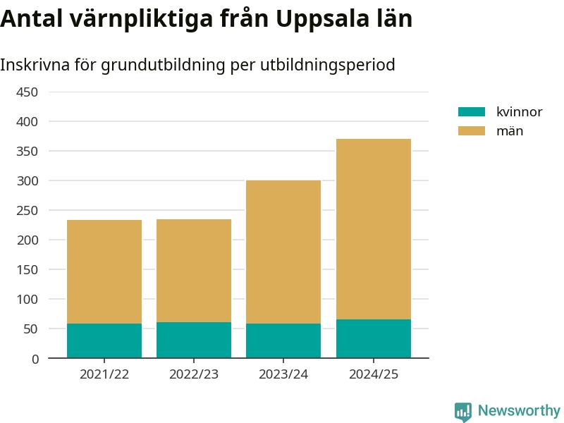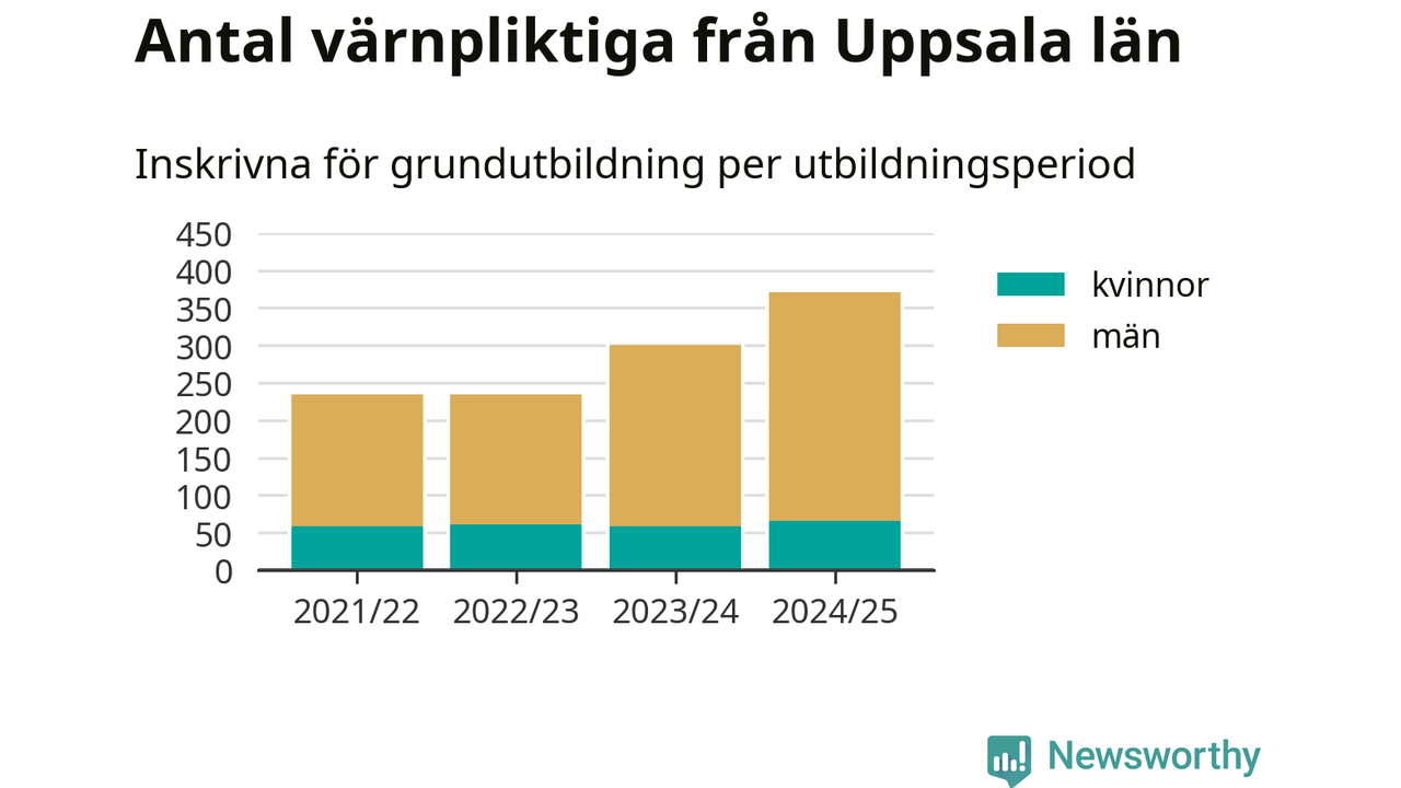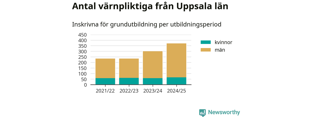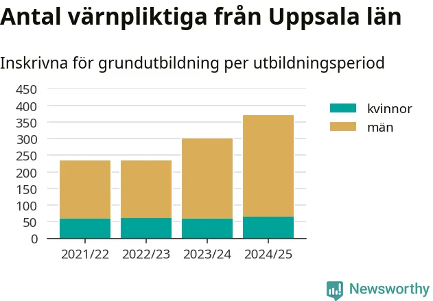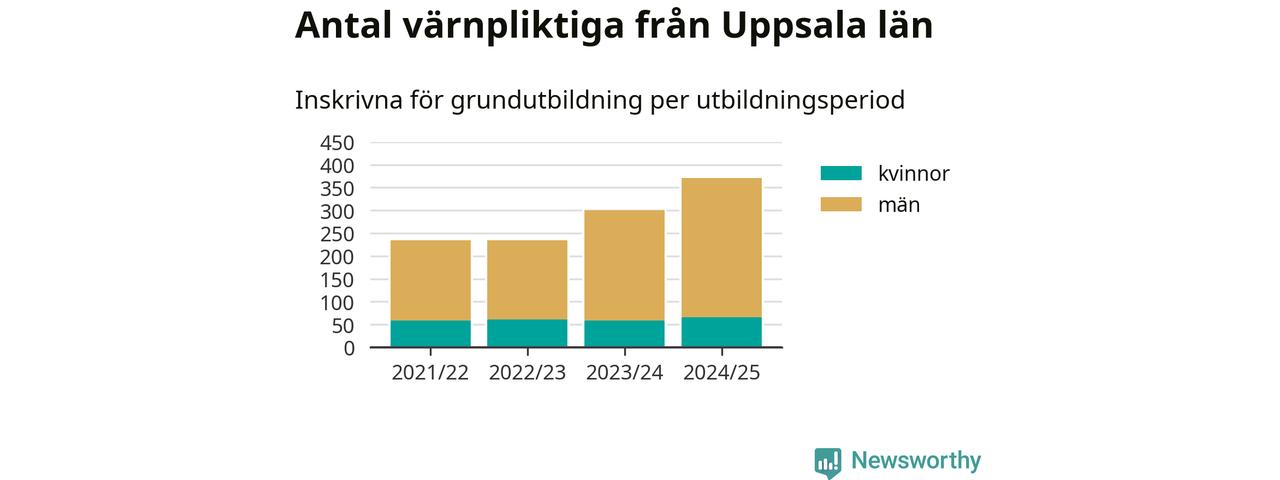 Antalet värnpliktiga från Uppsala län ökar stadigt, visar siffror från Plikt- och prövningsverket. Under det här värnpliktsåret, med utbildningsstart från juni 2024 till början av 2025, är 371 värnpliktiga inskrivna för att påbörja sin grundutbildning. Det är den högsta siffran åtminstone sedan 2021/22, vilket är så långt bakåt vi har siffror på länsnivå. Den allmänna värnplikten återinfördes 2018.
