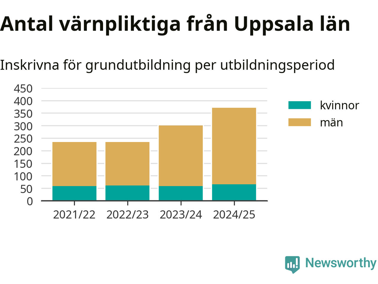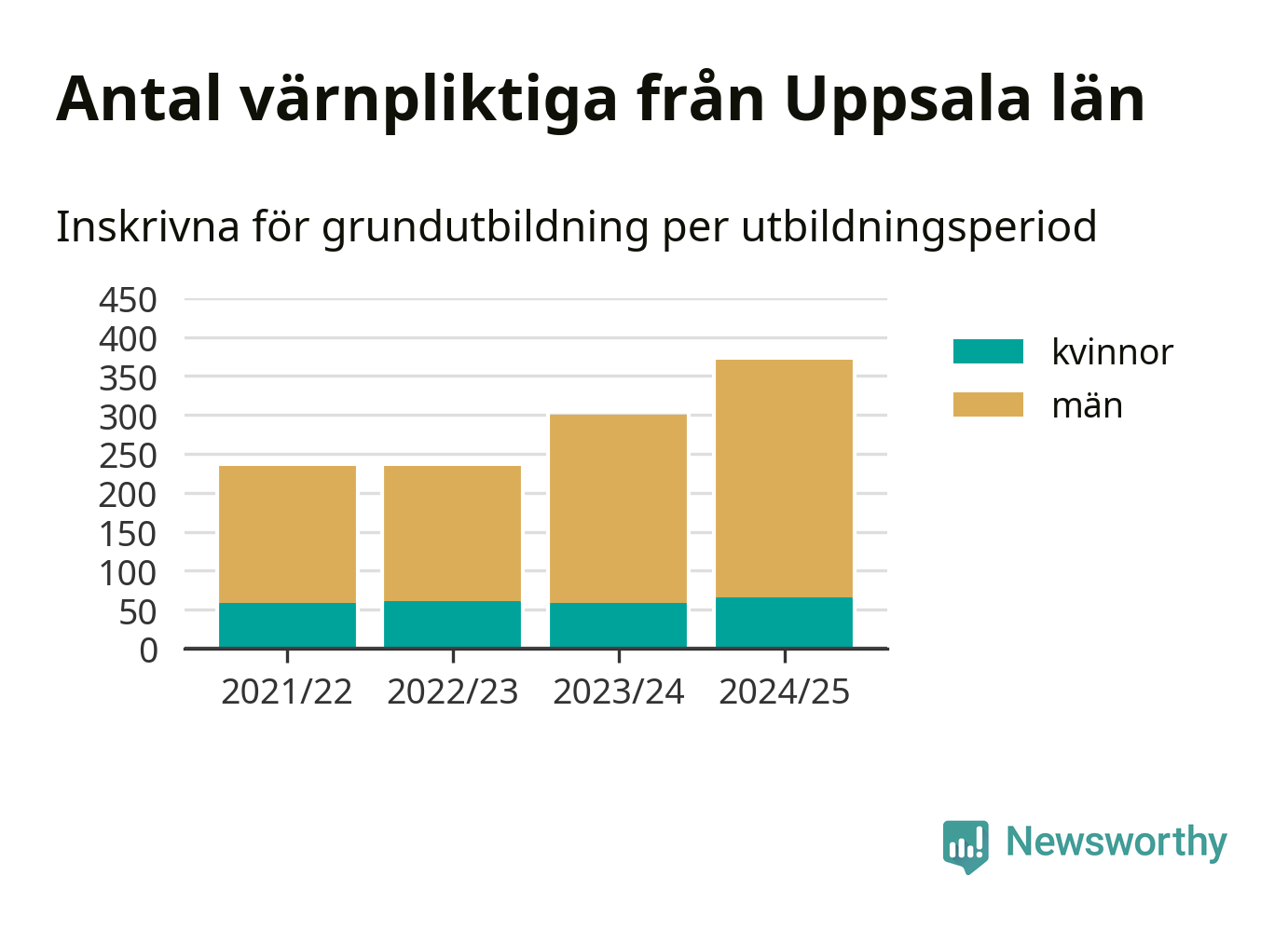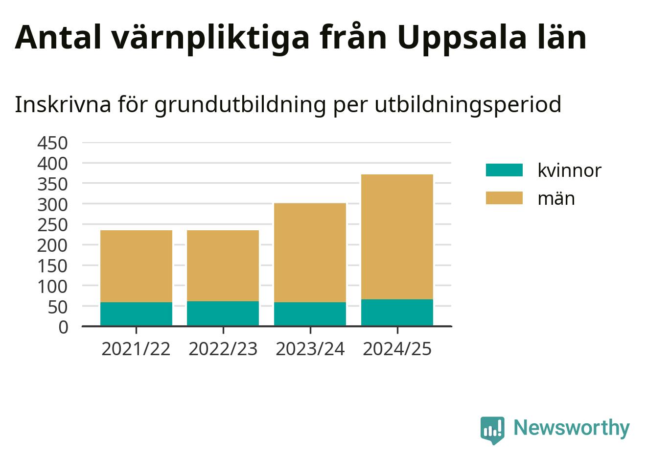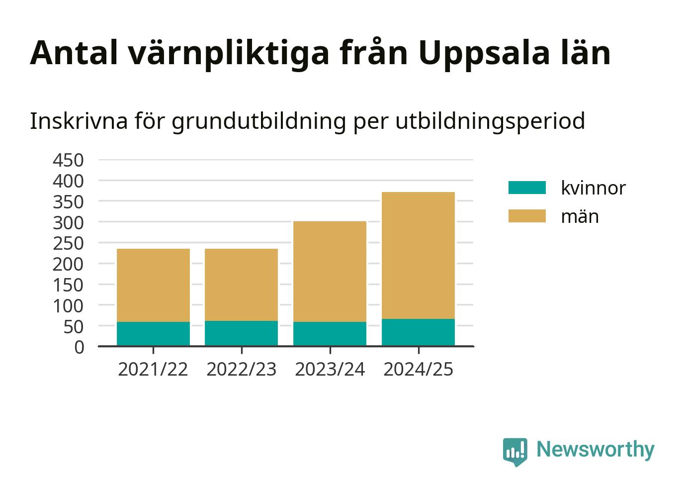 Antalet värnpliktiga från Uppsala län ökar stadigt, visar siffror från Plikt- och prövningsverket. Under det här värnpliktsåret, med utbildningsstart från juni 2024 till början av 2025, är 371 värnpliktiga inskrivna för att påbörja sin grundutbildning. Det är den högsta siffran åtminstone sedan 2021/22, vilket är så långt bakåt vi har siffror på länsnivå. Den allmänna värnplikten återinfördes 2018.