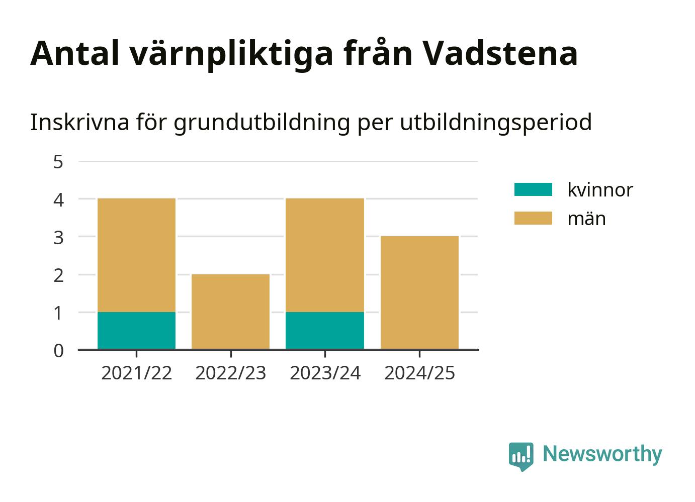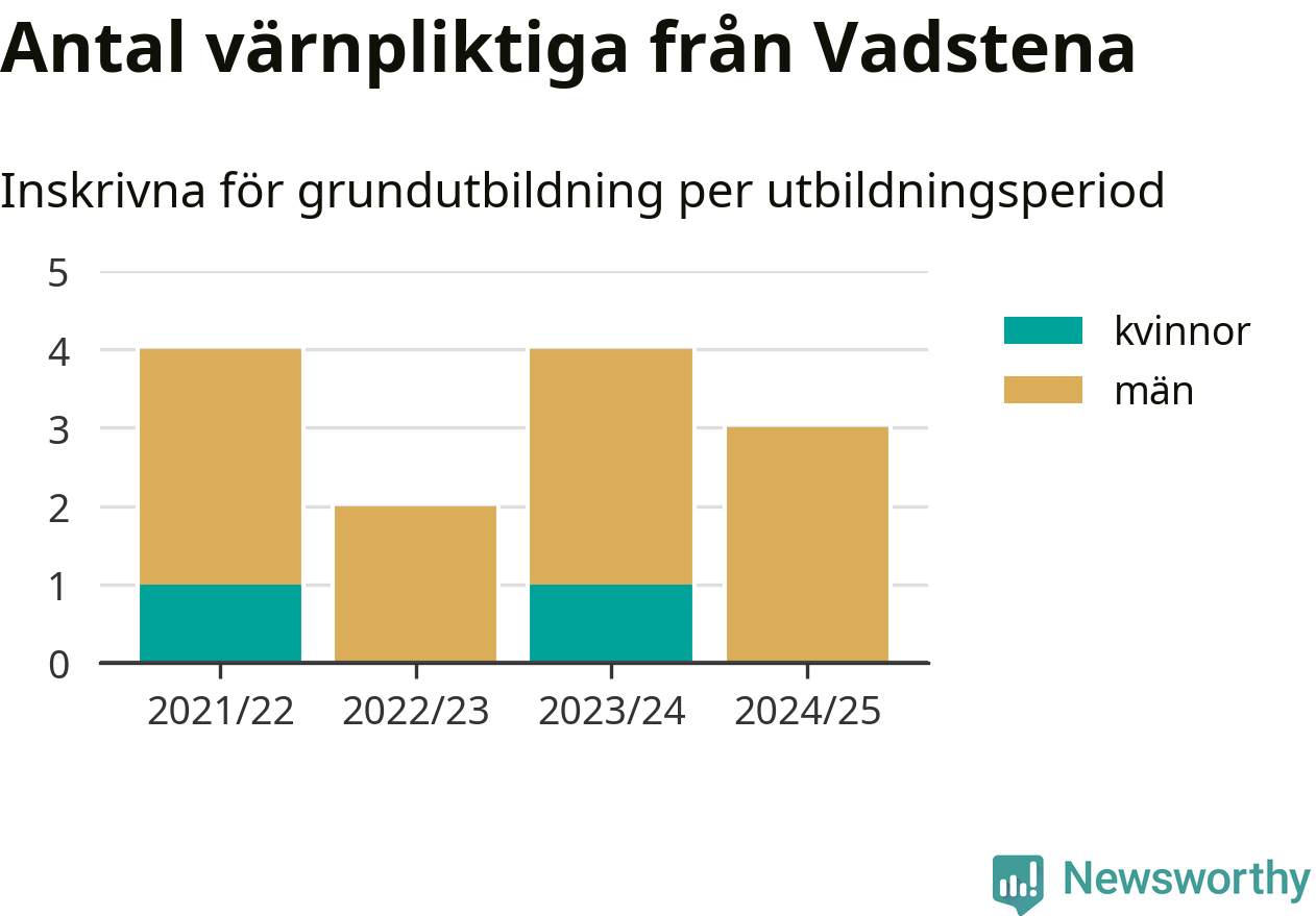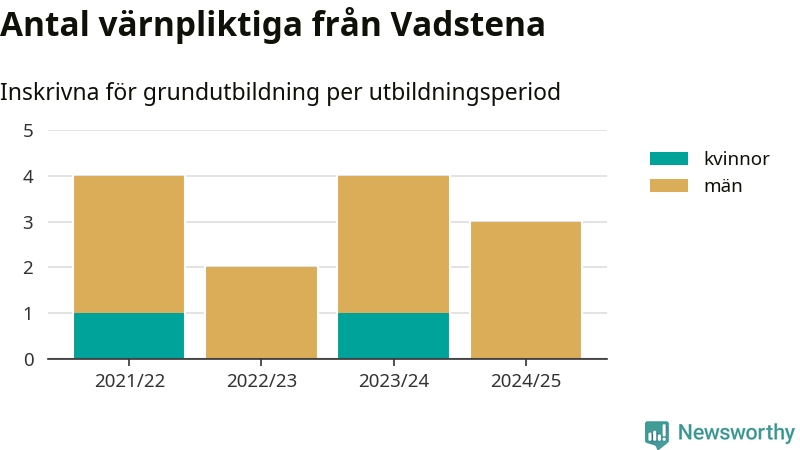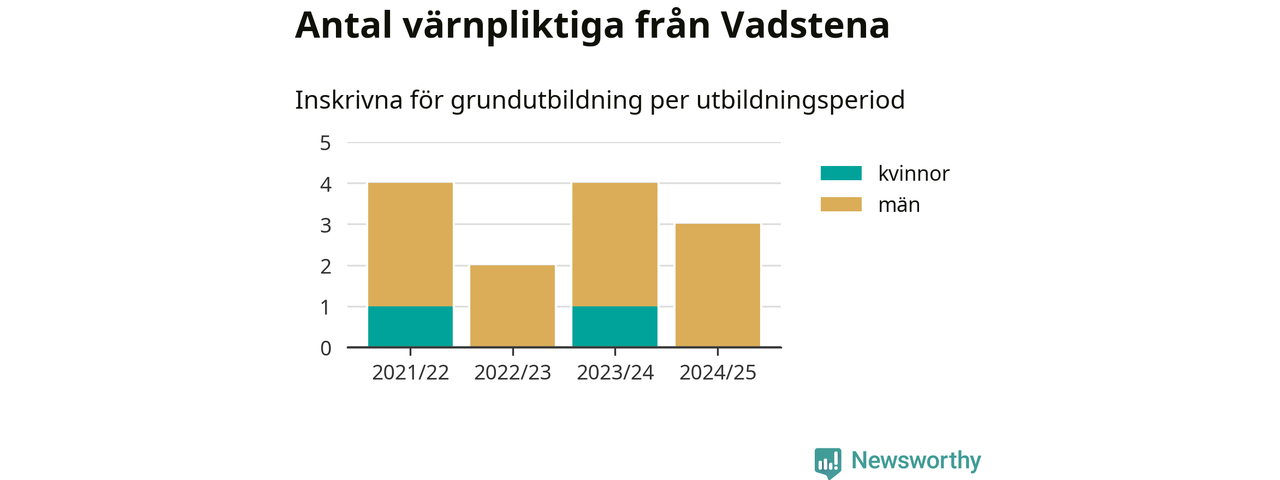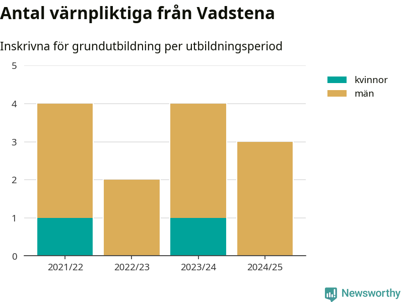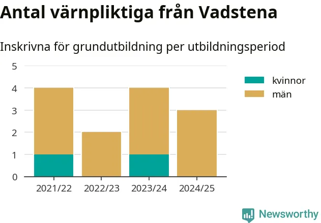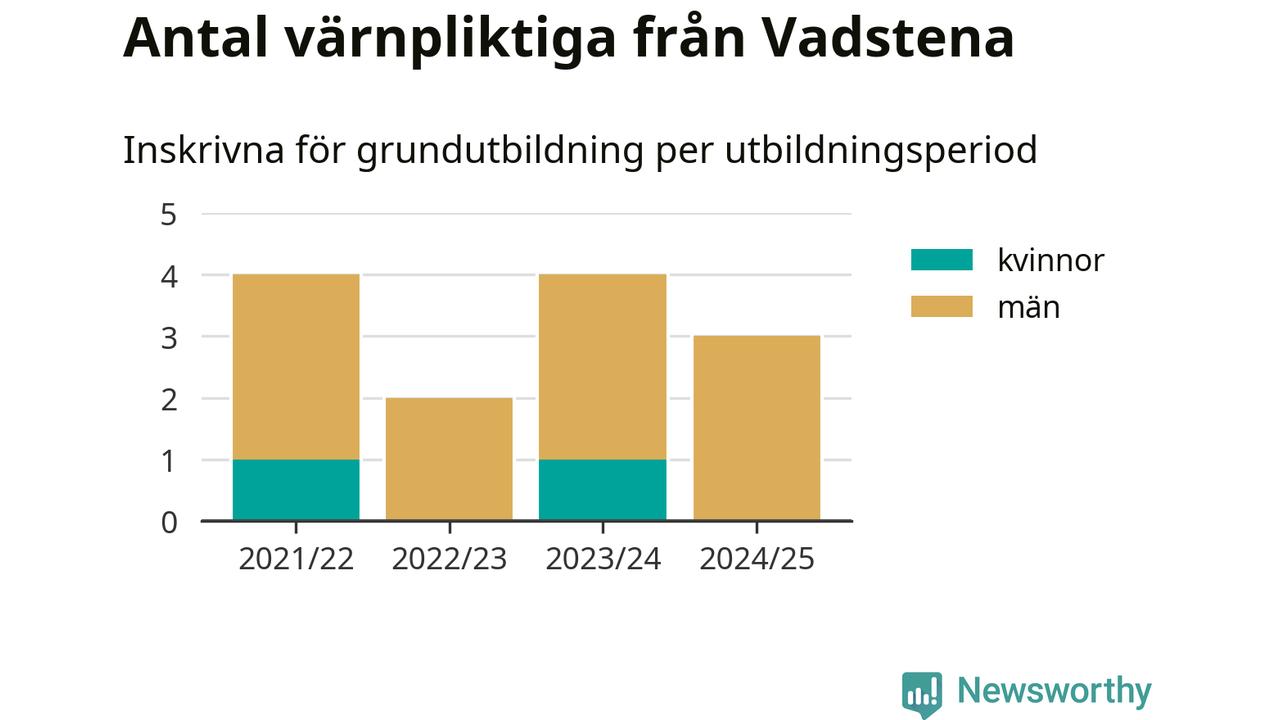 Tre värnpliktiga från Vadstena har skrivits in för att göra lumpen under innevarande utbildningsperiod, som sträcker sig från juni 2024 till och med första halvåret 2025. Det är ett färre än året innan. Den allmänna värnplikten återinfördes 2018 och vi har siffror nedbrutna på kommunnivå sedan 2021/22. Som mest har fyra personer från Vadstena skrivits in, utbildningsperioderna 2021/22 och 2023/24.