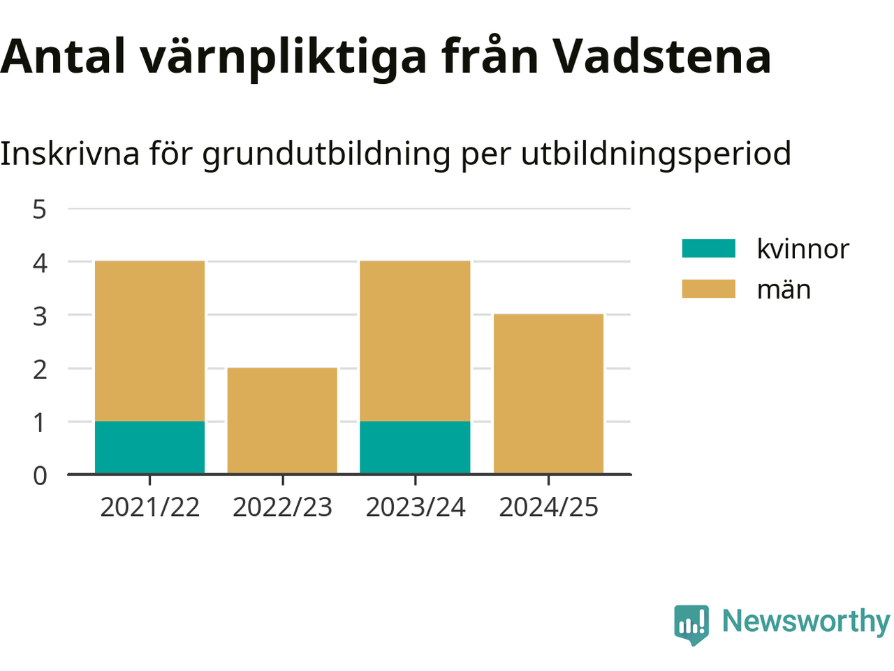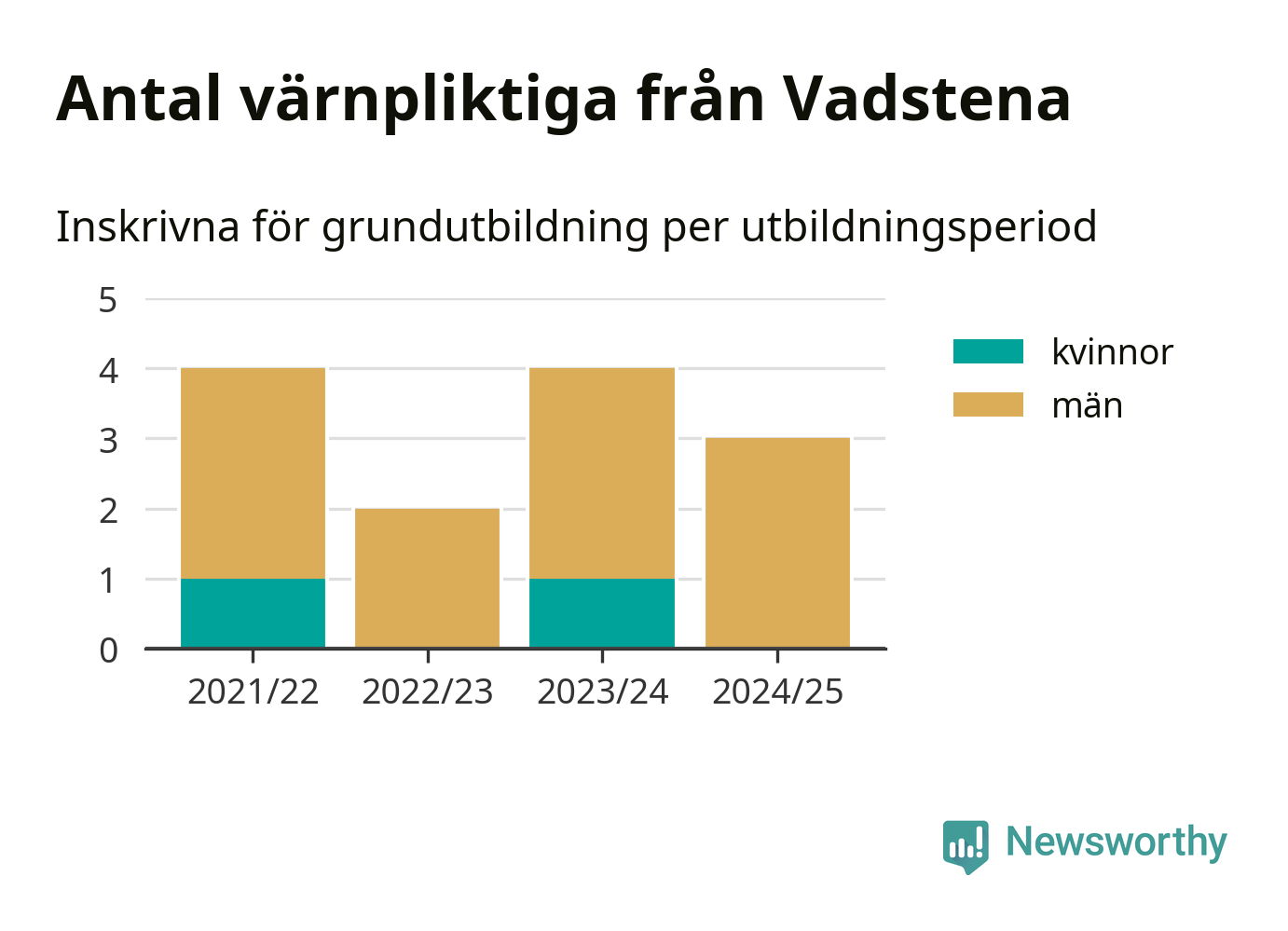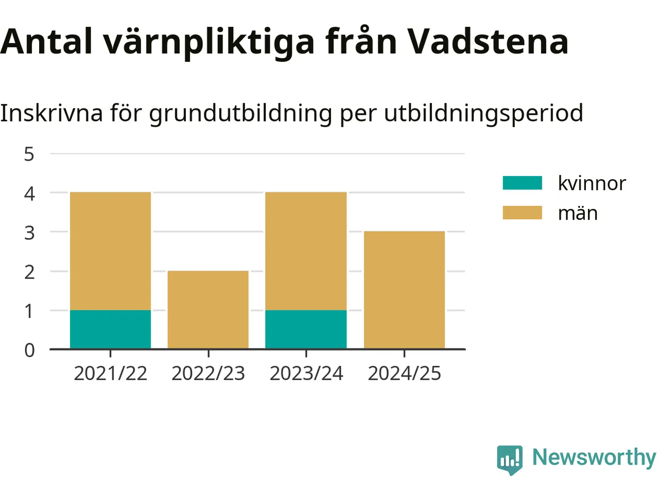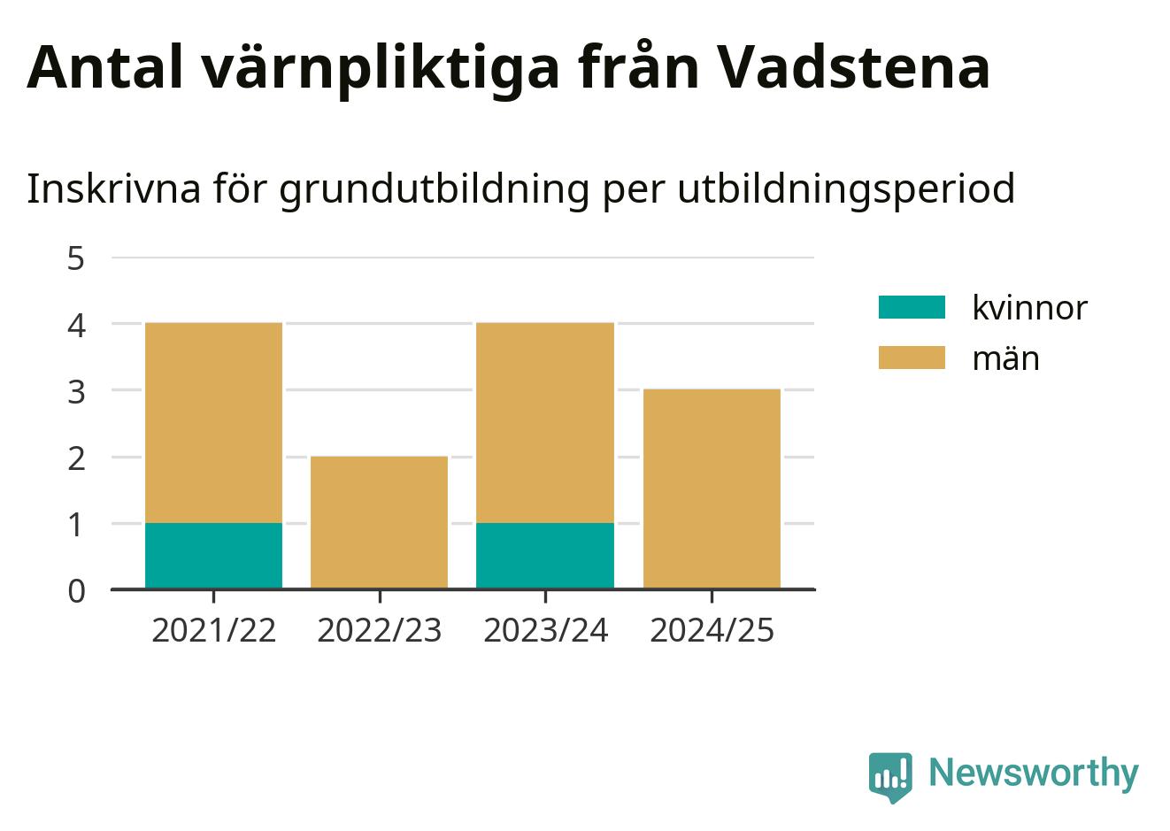 Tre värnpliktiga från Vadstena har skrivits in för att göra lumpen under innevarande utbildningsperiod, som sträcker sig från juni 2024 till och med första halvåret 2025. Det är ett färre än året innan. Den allmänna värnplikten återinfördes 2018 och vi har siffror nedbrutna på kommunnivå sedan 2021/22. Som mest har fyra personer från Vadstena skrivits in, utbildningsperioderna 2021/22 och 2023/24.