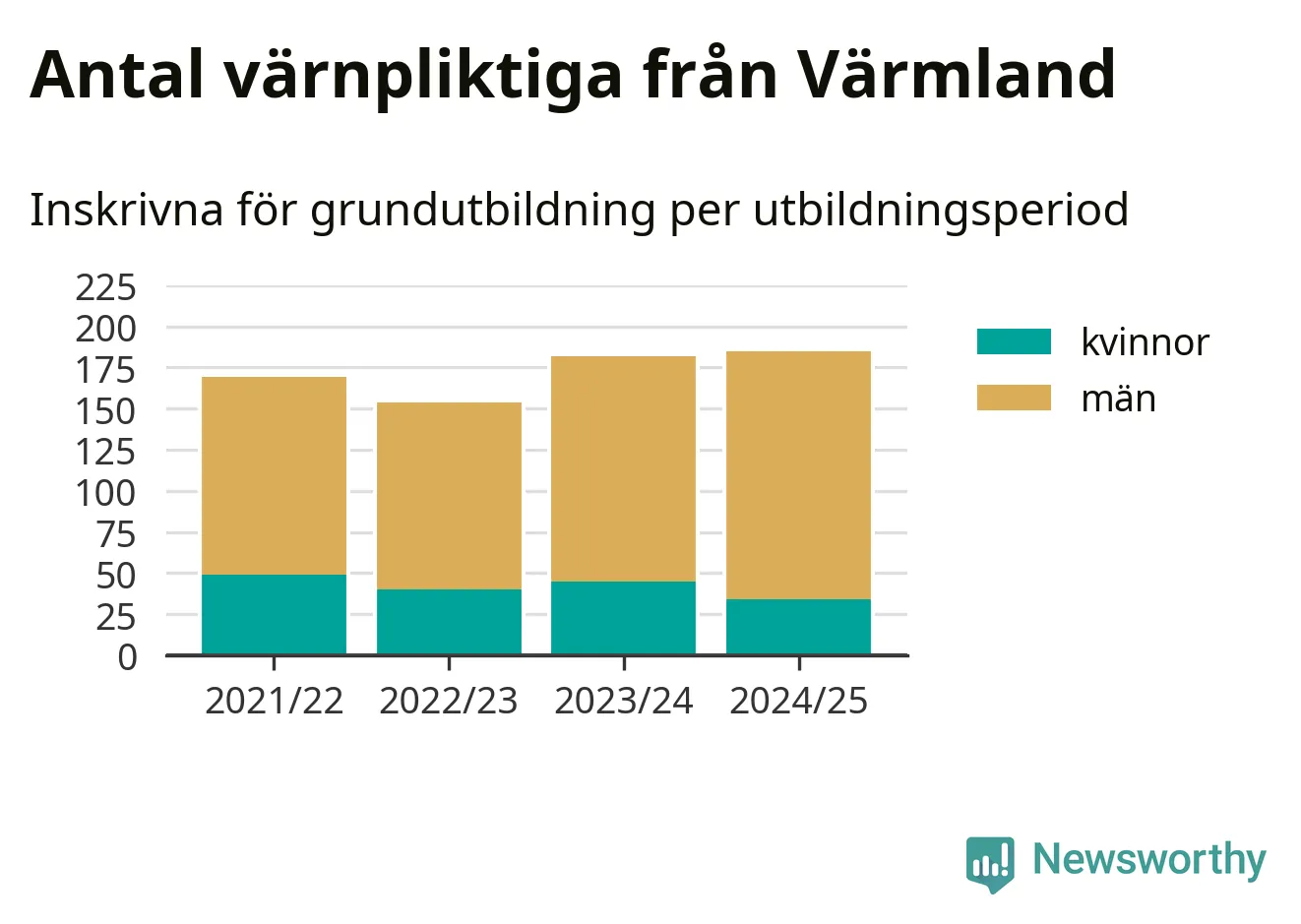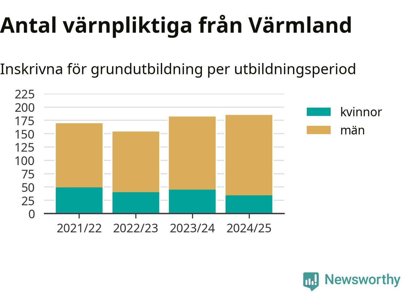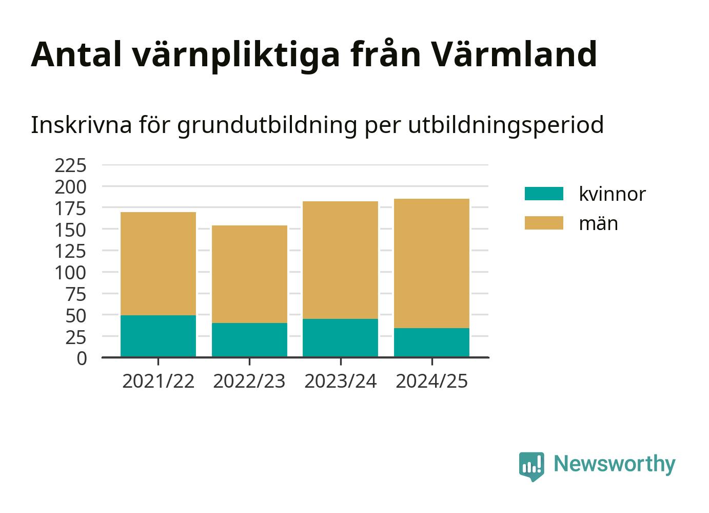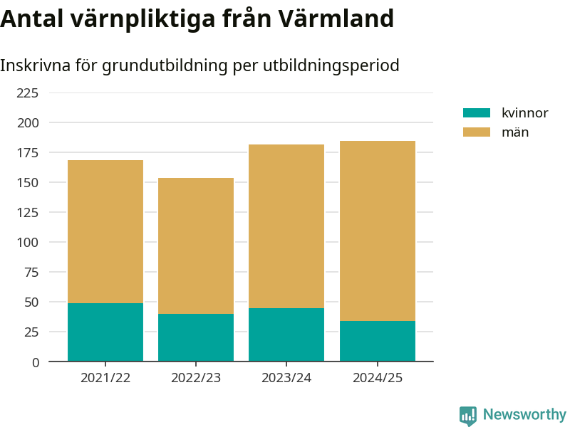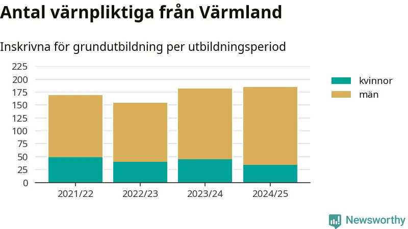I riket som helhet har antalet som skrivits in ökat de senaste åren – från omkring 5 600 2022/23 till omkring 8 300 personer 2024/25. Samtidigt har mansdominansen bland de värnpliktiga ökat, antalet kvinnor har legat stadigt kring 1 400 och ökningen har egentligen bara skett bland männen. Det innebär att 2022/23 – när andelen kvinnor var som högst – var ungefär 24 procent av de inskrivna kvinna, i år är motsvarande siffra 17 procent.