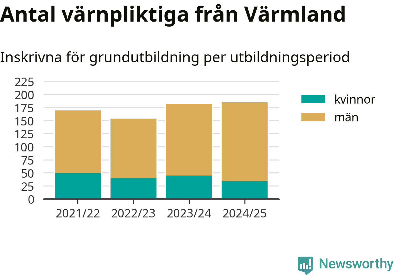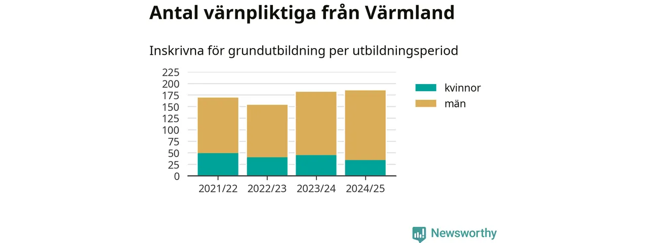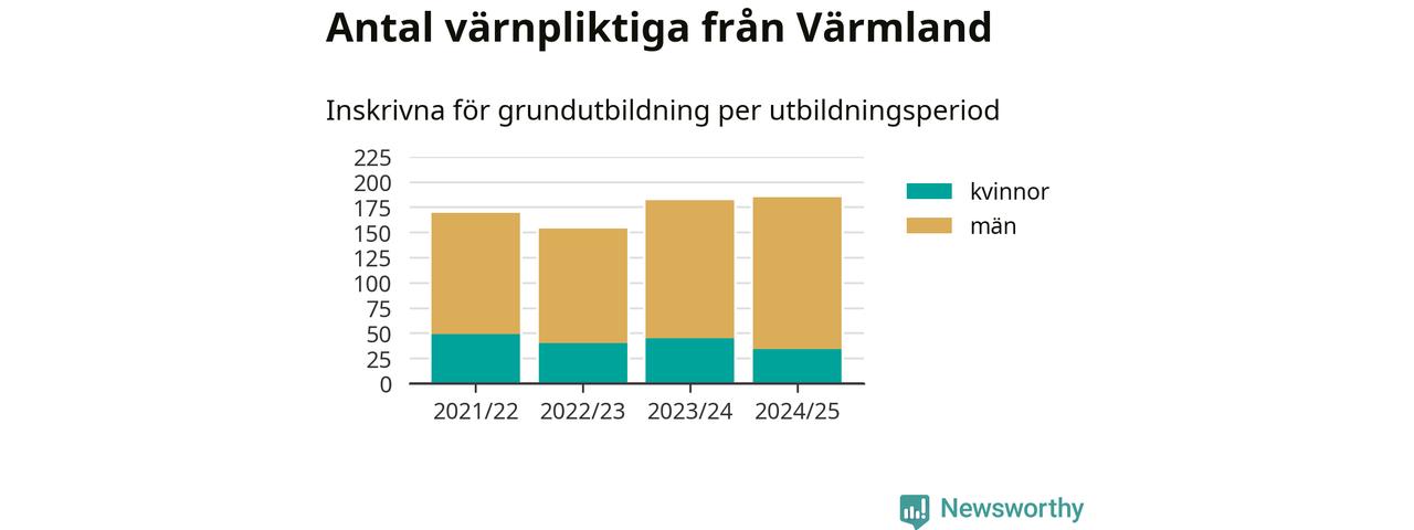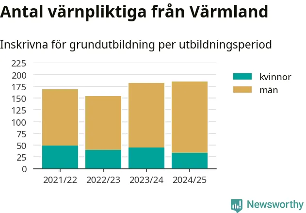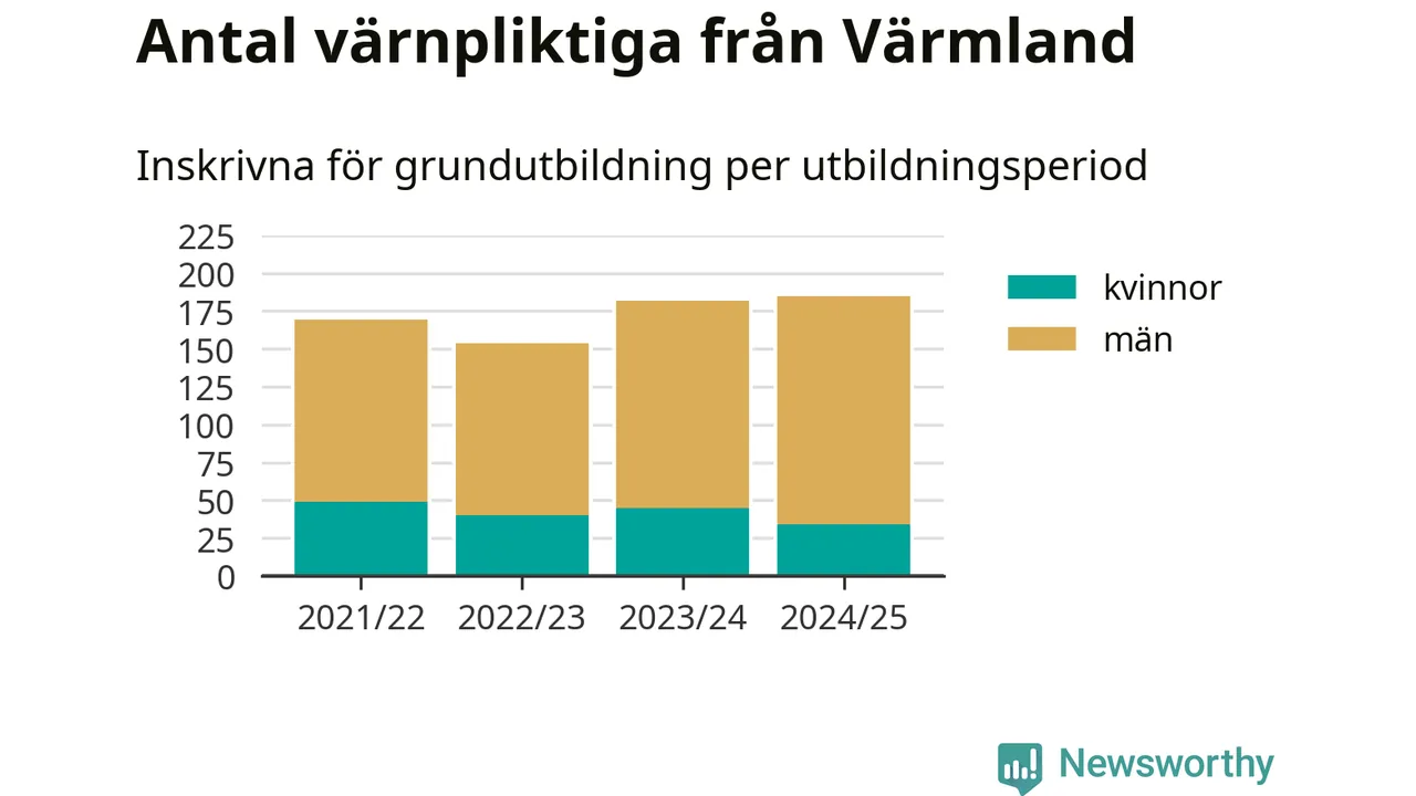 Antalet värnpliktiga från Värmland ökar stadigt, visar siffror från Plikt- och prövningsverket. Under det här värnpliktsåret, med utbildningsstart från juni 2024 till början av 2025, är 185 värnpliktiga inskrivna för att påbörja sin grundutbildning. Det är den högsta siffran åtminstone sedan 2021/22, vilket är så långt bakåt vi har siffror på länsnivå. Den allmänna värnplikten återinfördes 2018.