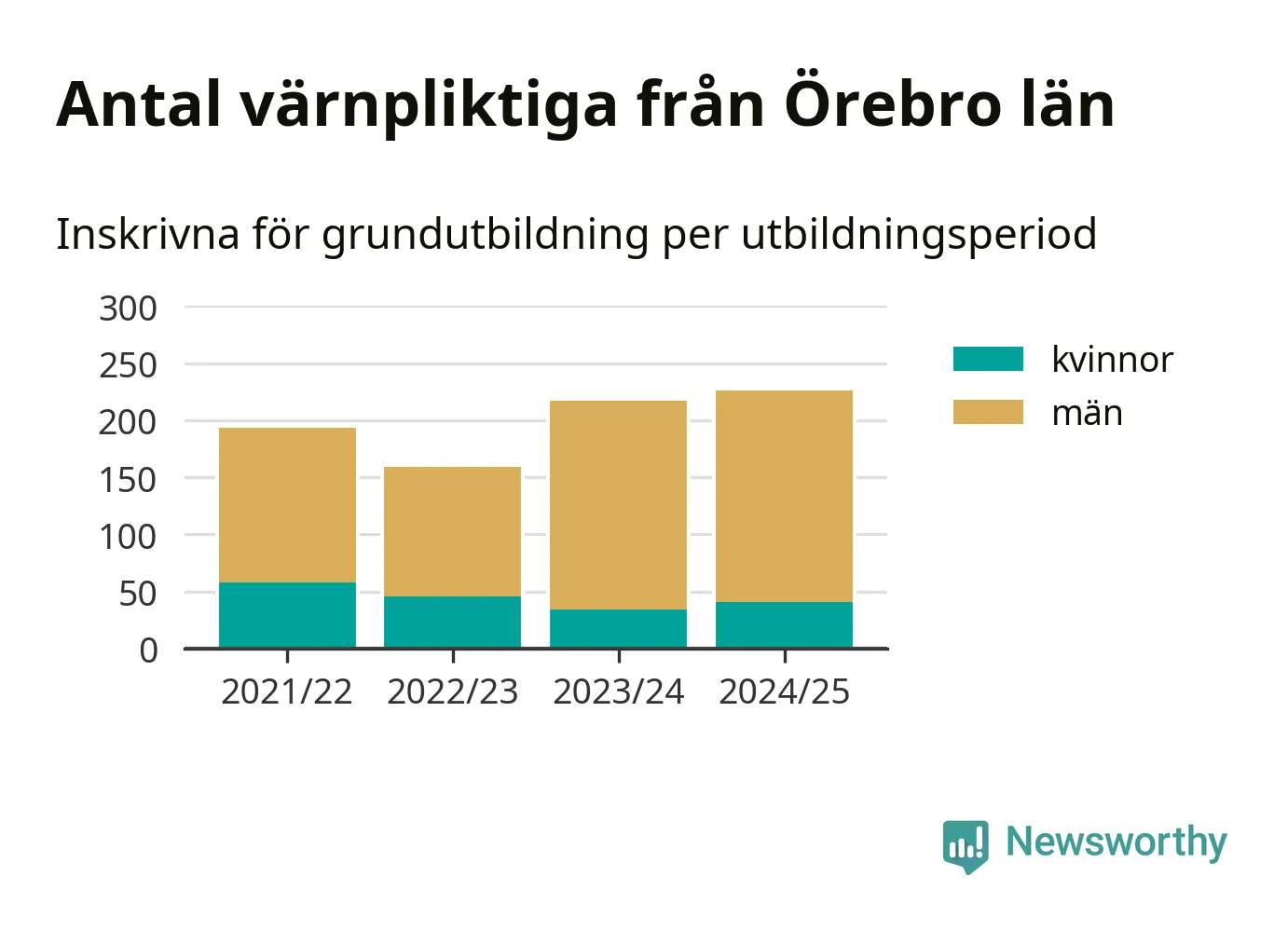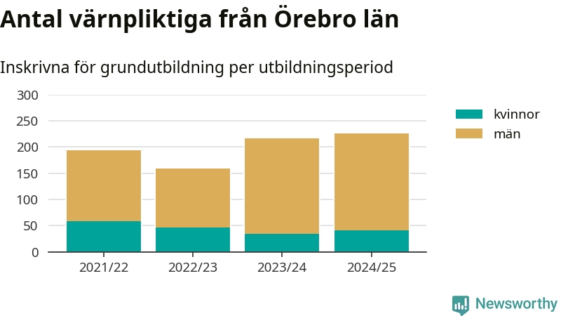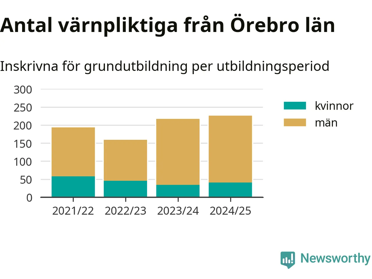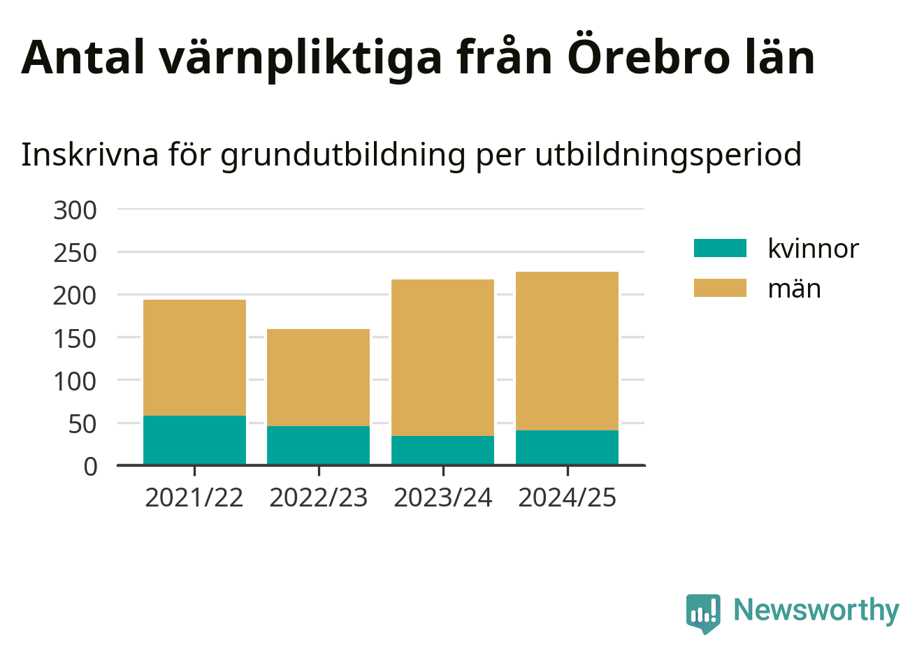 Antalet värnpliktiga från Örebro län ökar stadigt, visar siffror från Plikt- och prövningsverket. Under det här värnpliktsåret, med utbildningsstart från juni 2024 till början av 2025, är 226 värnpliktiga inskrivna för att påbörja sin grundutbildning. Det är den högsta siffran åtminstone sedan 2021/22, vilket är så långt bakåt vi har siffror på länsnivå. Den allmänna värnplikten återinfördes 2018.