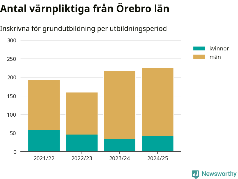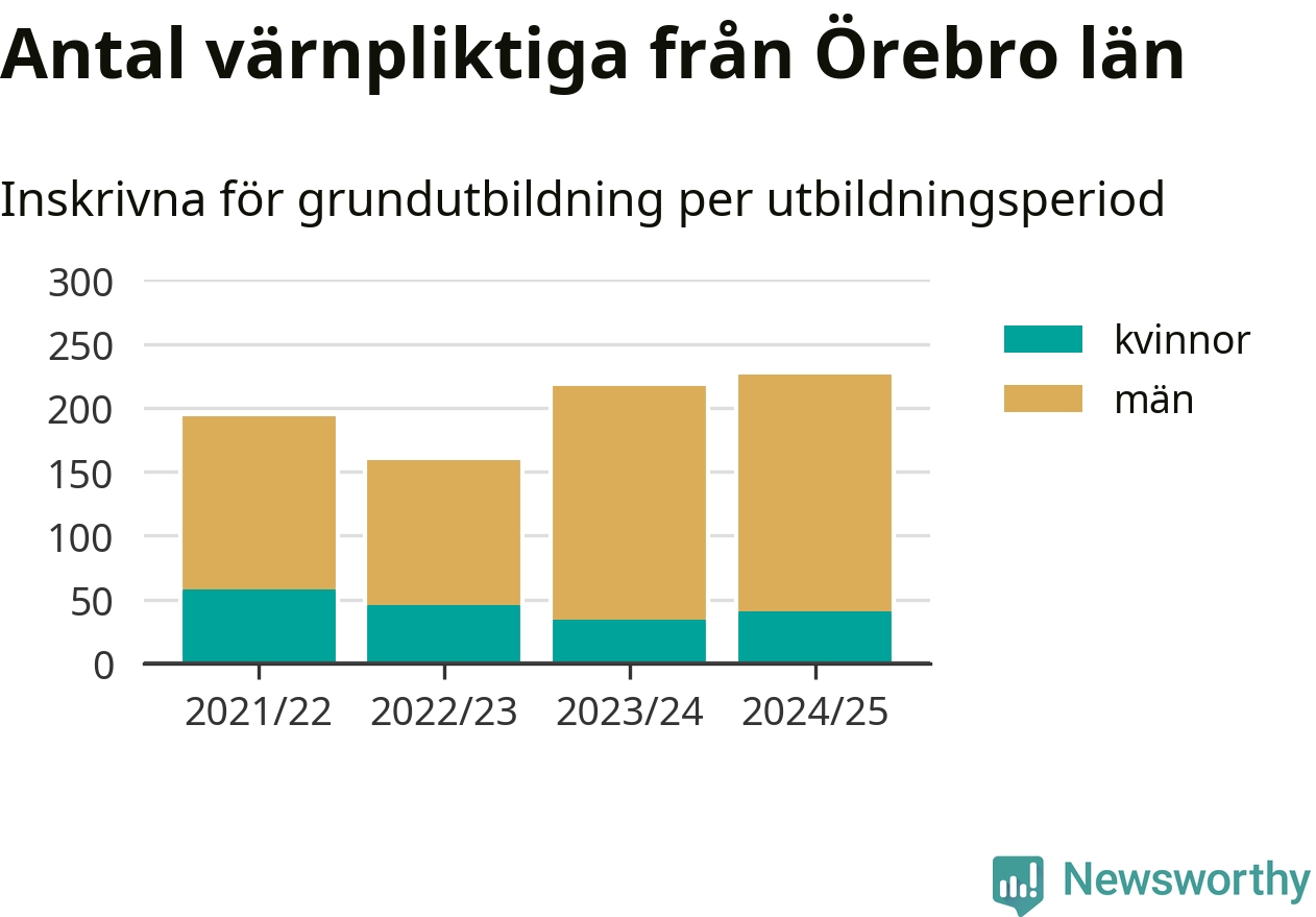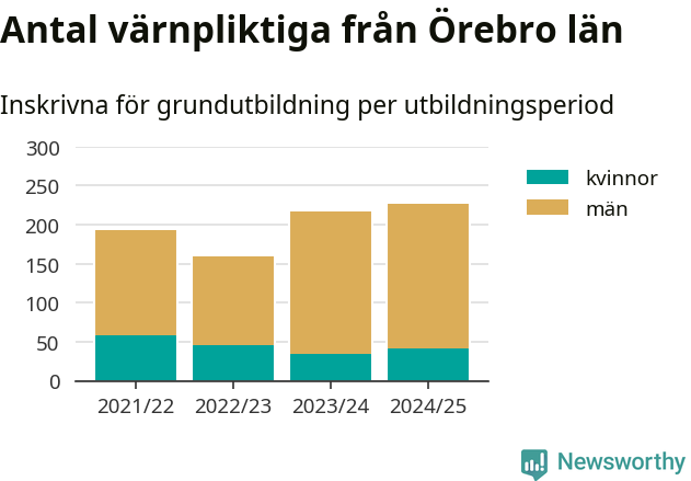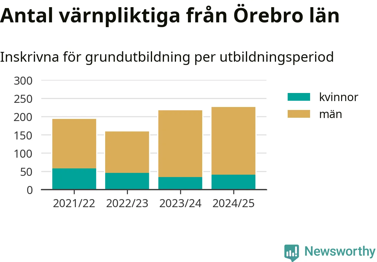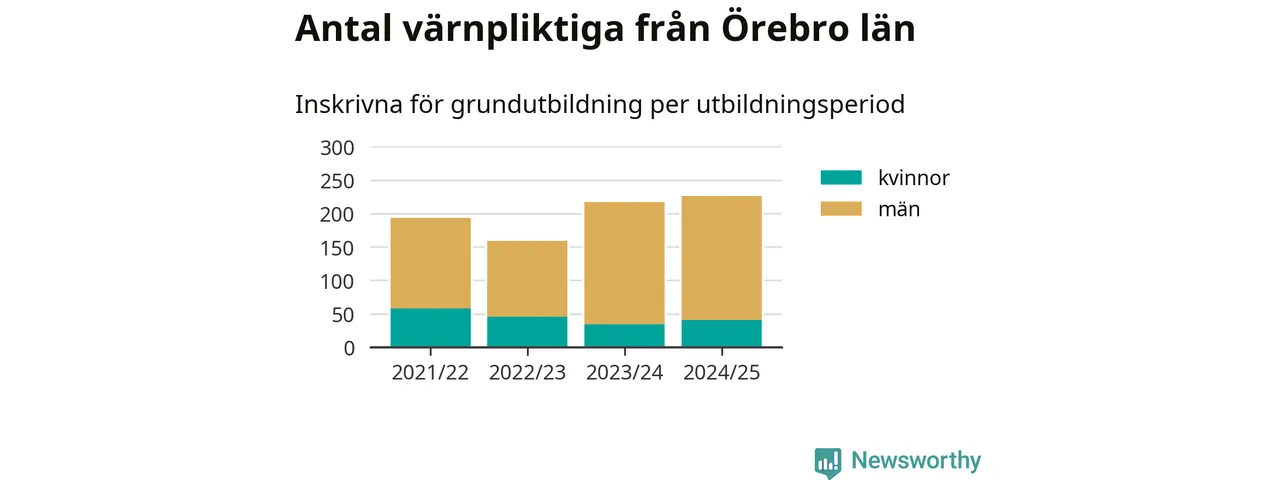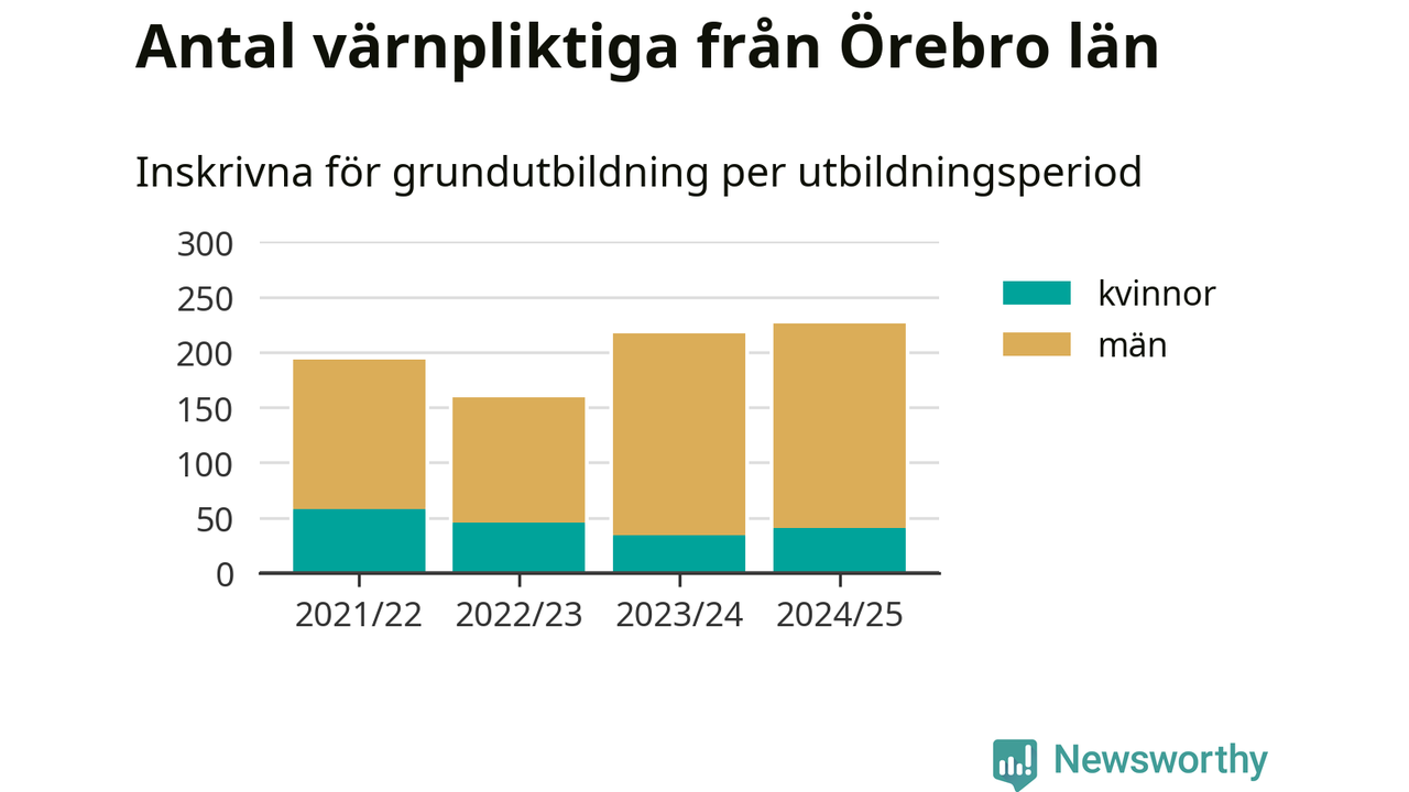 Antalet värnpliktiga från Örebro län ökar stadigt, visar siffror från Plikt- och prövningsverket. Under det här värnpliktsåret, med utbildningsstart från juni 2024 till början av 2025, är 226 värnpliktiga inskrivna för att påbörja sin grundutbildning. Det är den högsta siffran åtminstone sedan 2021/22, vilket är så långt bakåt vi har siffror på länsnivå. Den allmänna värnplikten återinfördes 2018.