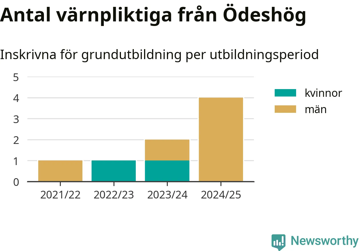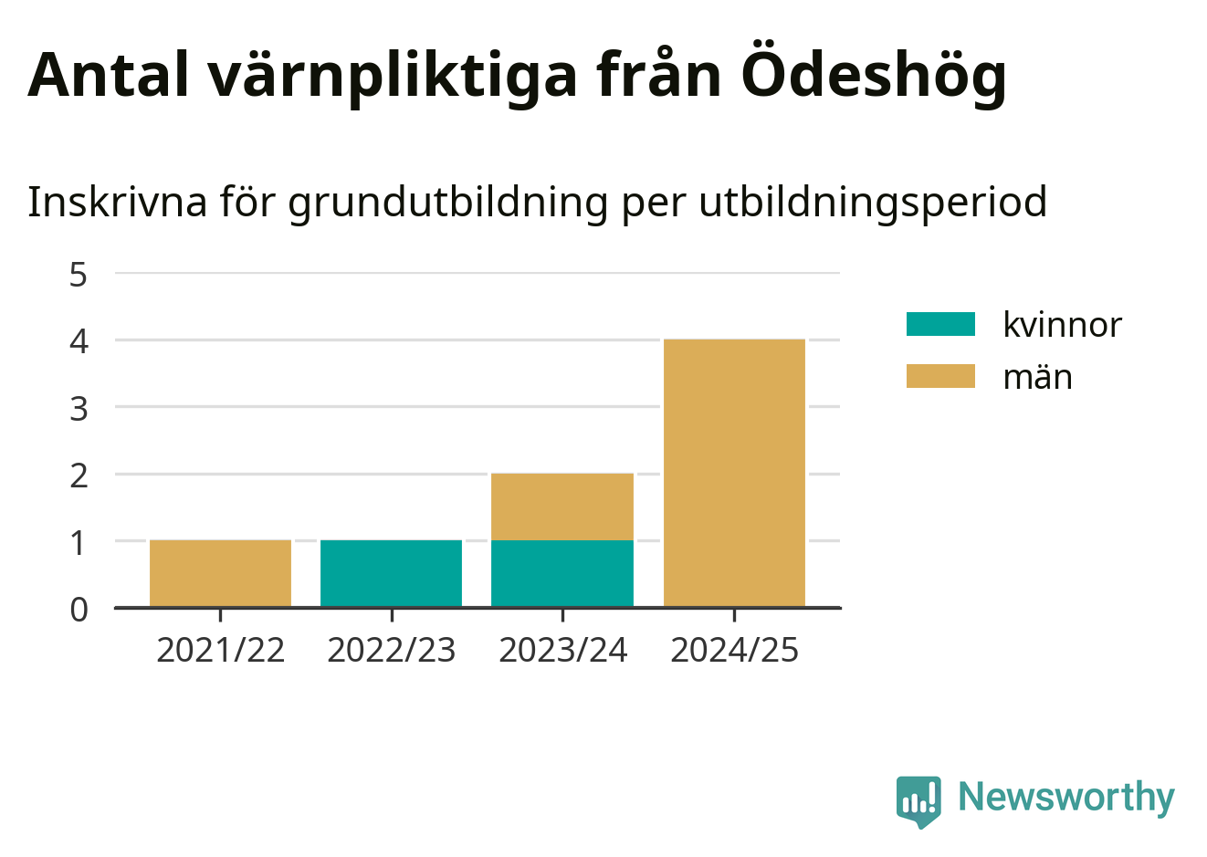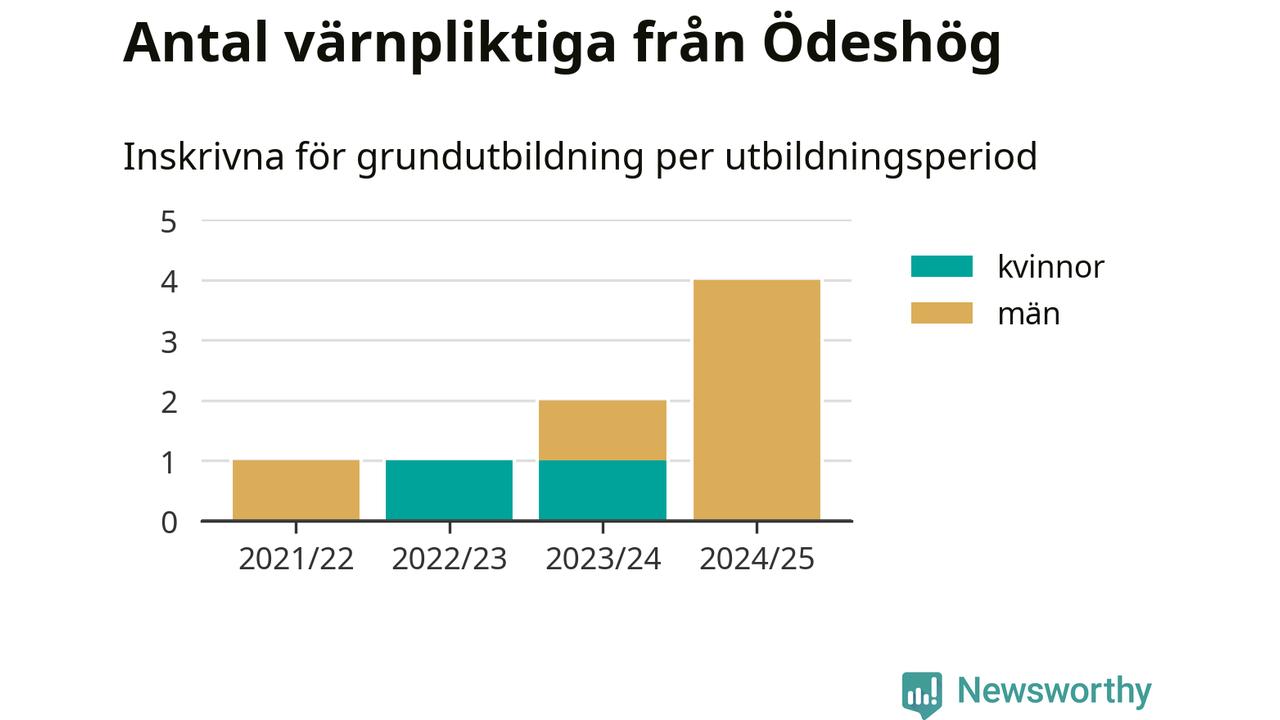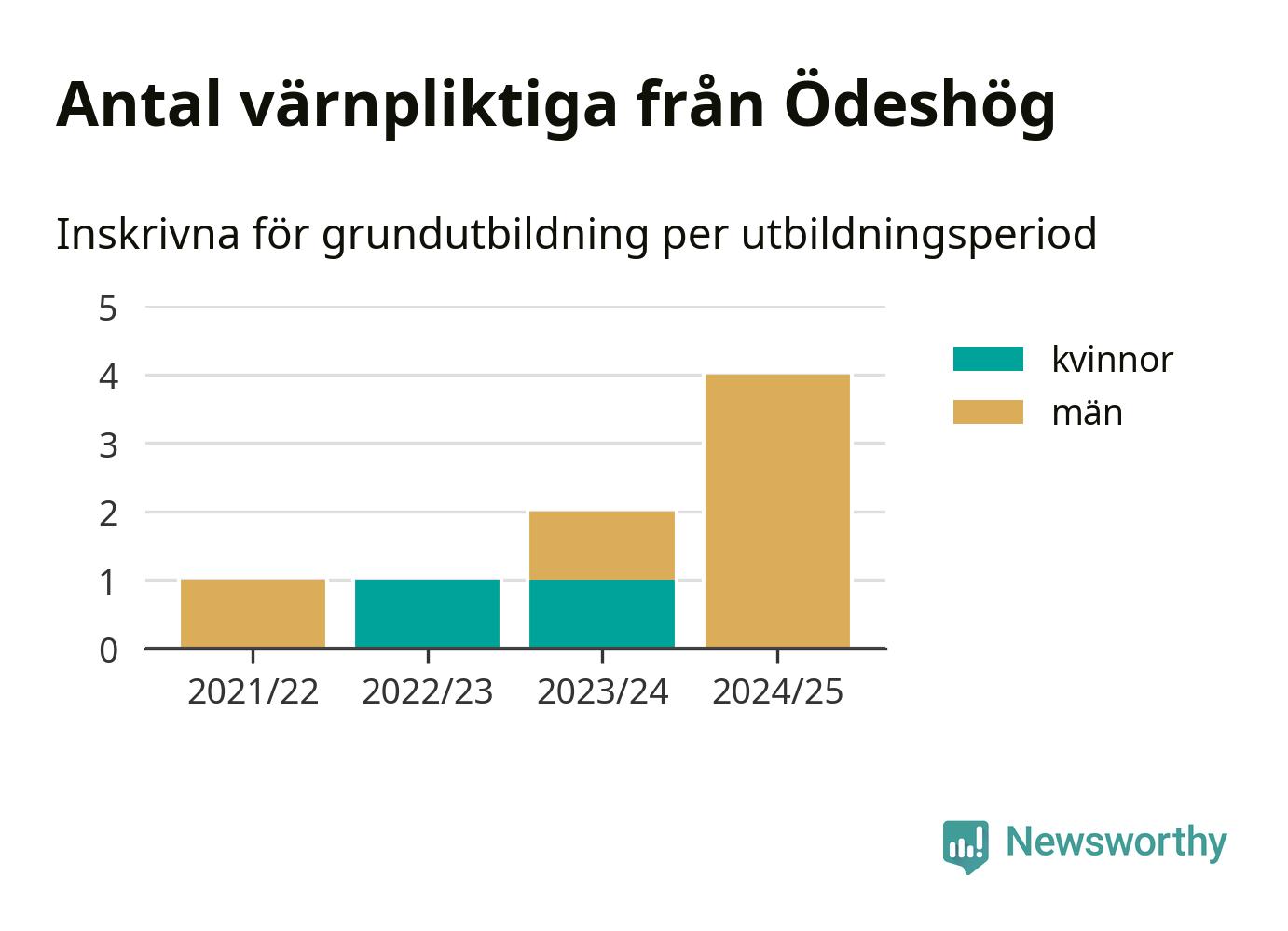Antalet värnpliktiga från Ödeshög ökar stadigt, visar siffror från Plikt- och prövningsverket. Under det här värnpliktsåret, med utbildningsstart från juni 2024 till början av 2025, är fyra värnpliktiga inskrivna för att påbörja sin grundutbildning. Det är den högsta siffran åtminstone sedan 2021/22, vilket är så långt bakåt vi har siffror på kommunnivå. Den allmänna värnplikten återinfördes 2018.