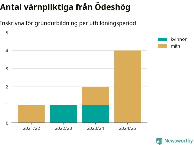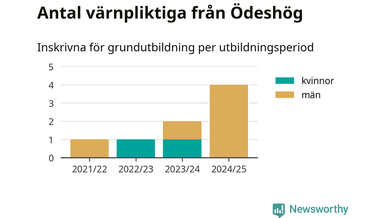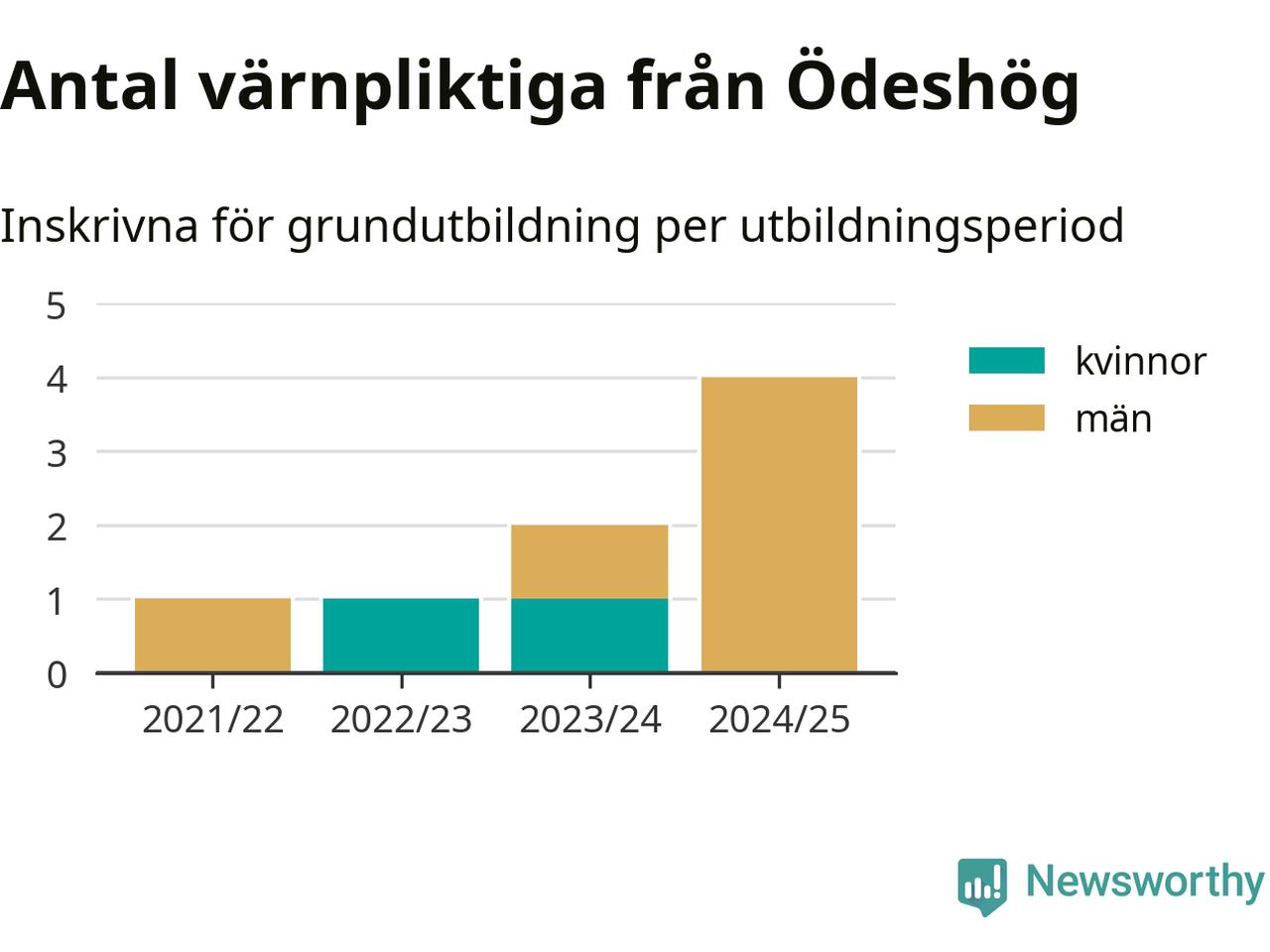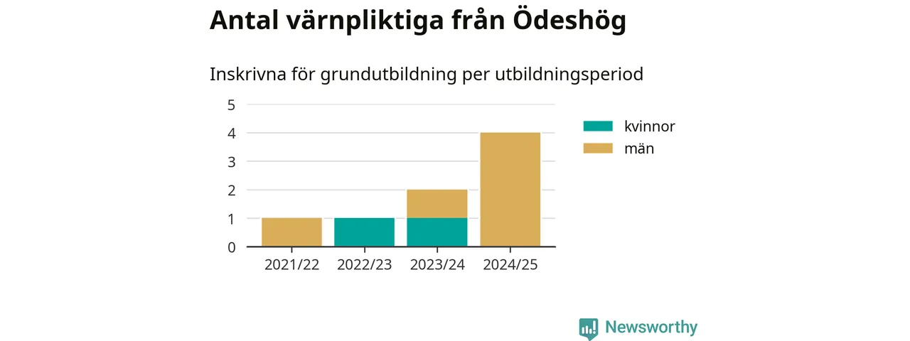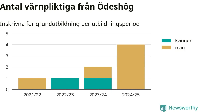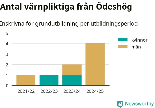 Antalet värnpliktiga från Ödeshög ökar stadigt, visar siffror från Plikt- och prövningsverket. Under det här värnpliktsåret, med utbildningsstart från juni 2024 till början av 2025, är fyra värnpliktiga inskrivna för att påbörja sin grundutbildning. Det är den högsta siffran åtminstone sedan 2021/22, vilket är så långt bakåt vi har siffror på kommunnivå. Den allmänna värnplikten återinfördes 2018.