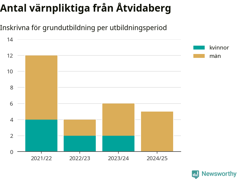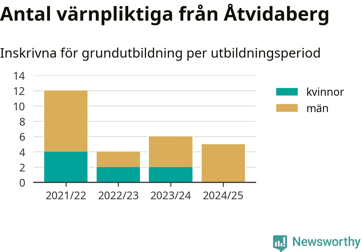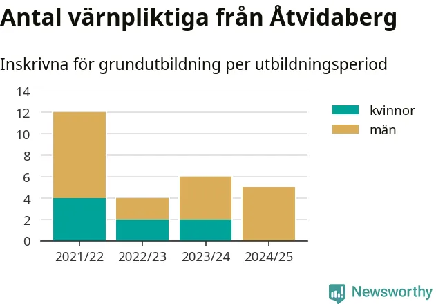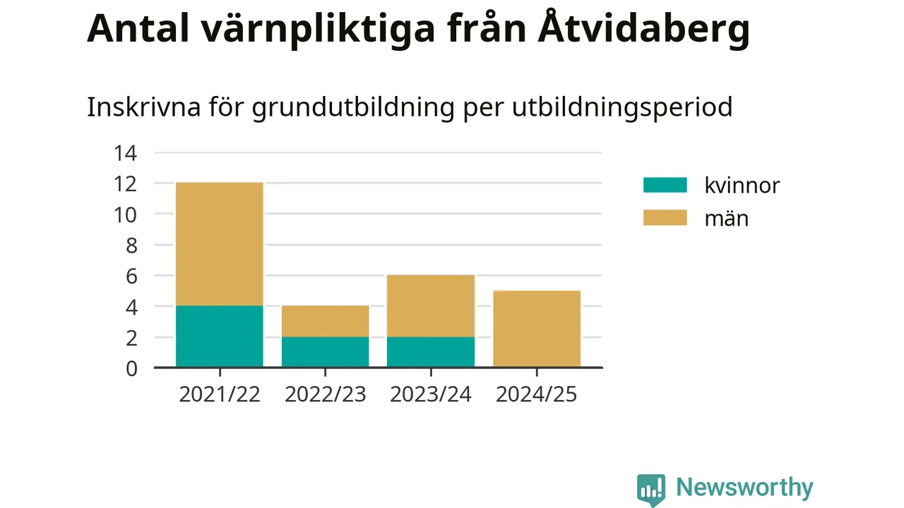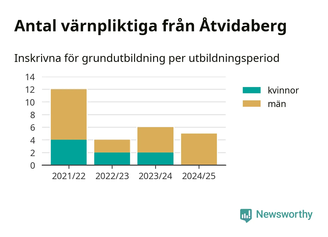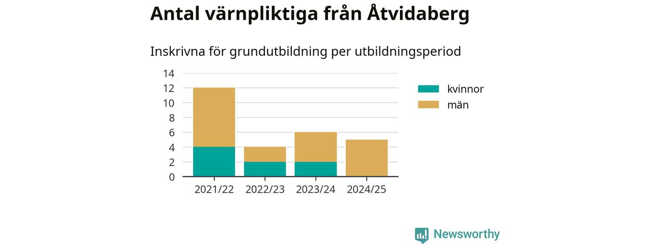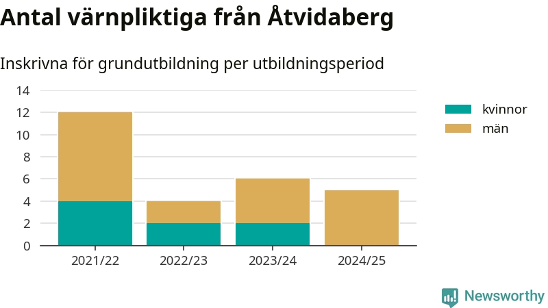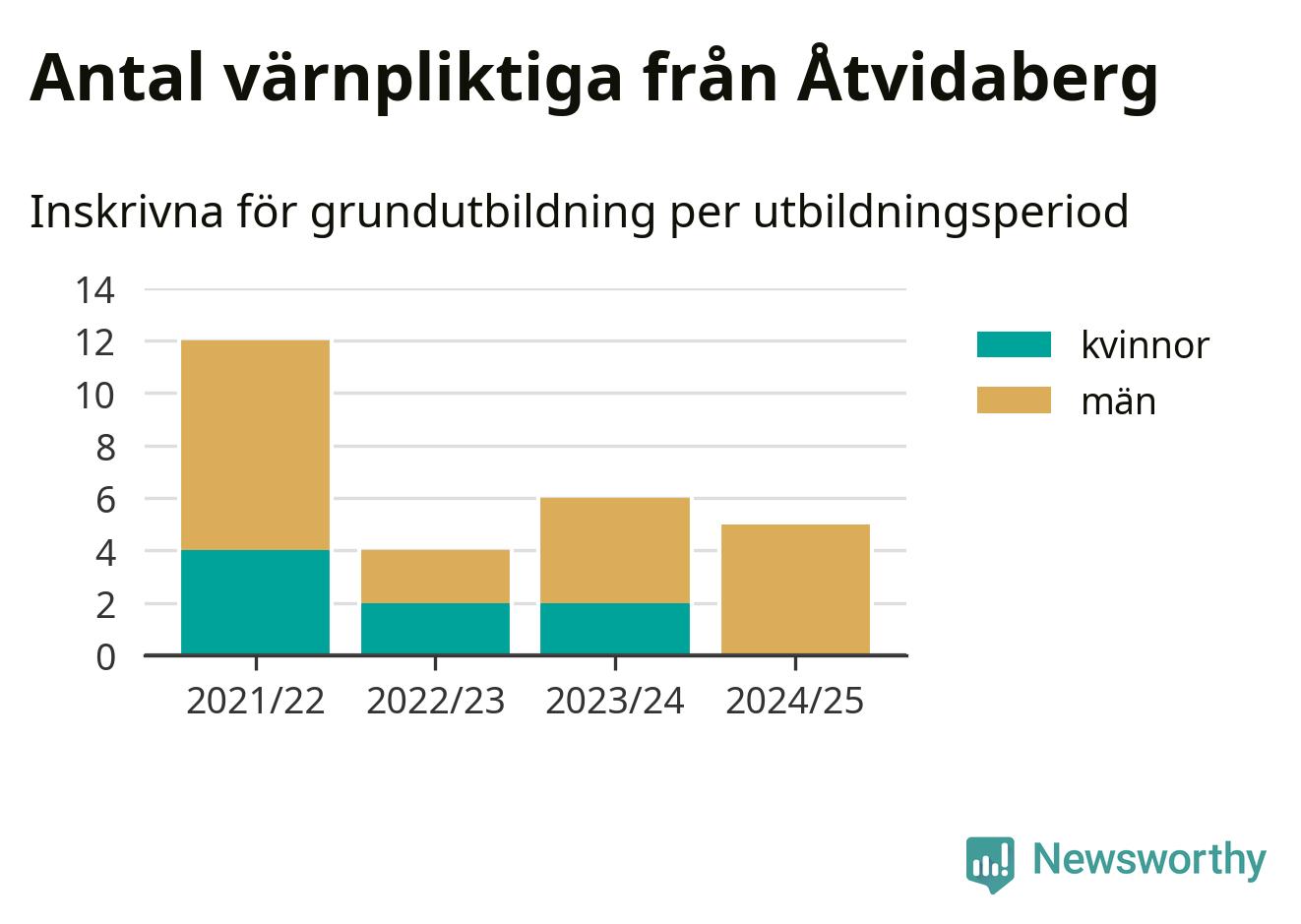 Fem värnpliktiga från Åtvidaberg har skrivits in för att göra lumpen under innevarande utbildningsperiod, som sträcker sig från juni 2024 till och med första halvåret 2025. Det är två färre än året innan. Den allmänna värnplikten återinfördes 2018 och vi har siffror nedbrutna på kommunnivå sedan 2021/22. Som mest har tolv personer från Åtvidaberg skrivits in, utbildningsperioden 2021/22.