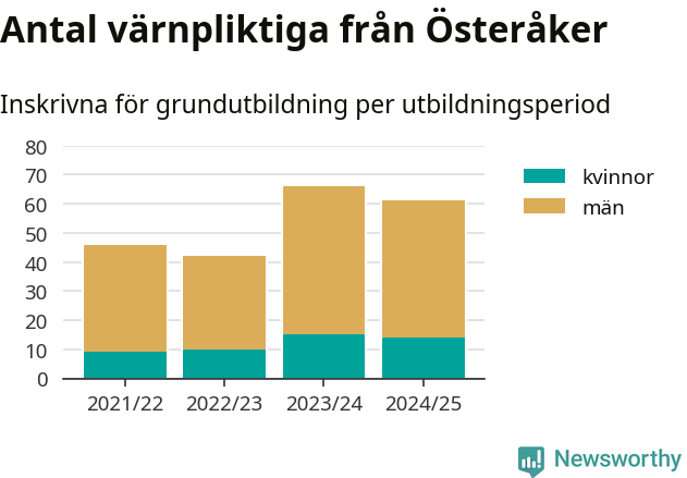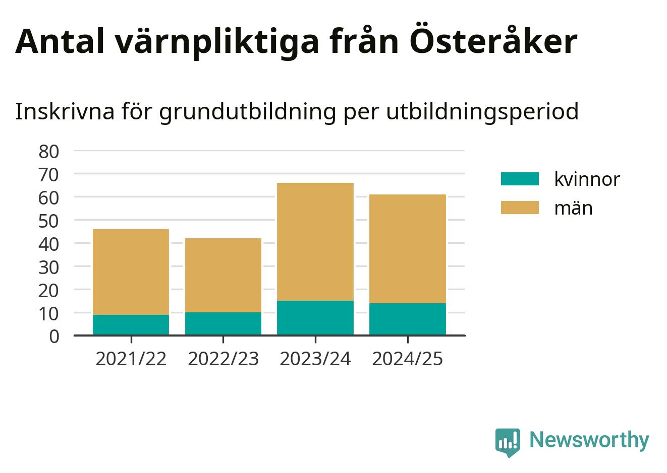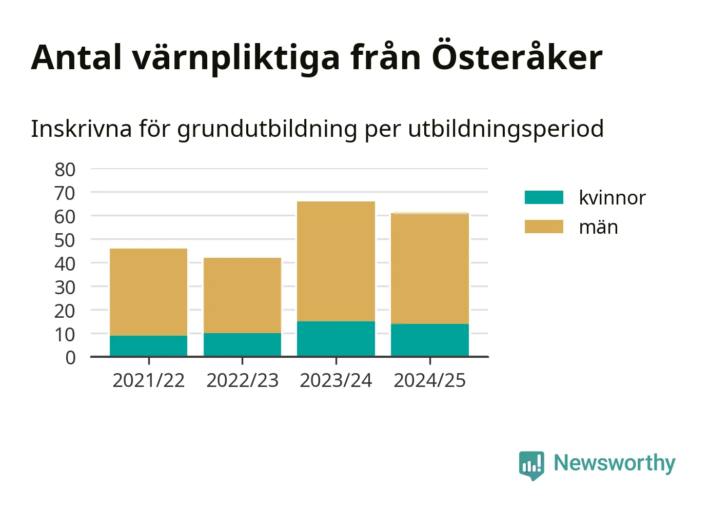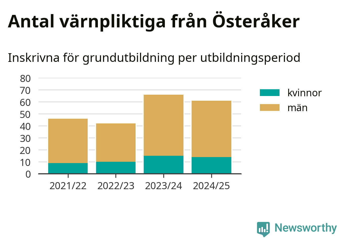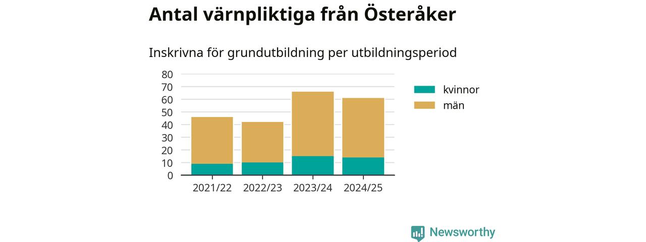 61 värnpliktiga från Österåker har skrivits in för att göra lumpen under innevarande utbildningsperiod, som sträcker sig från juni 2024 till och med första halvåret 2025. Det är ett färre än året innan. Den allmänna värnplikten återinfördes 2018 och vi har siffror nedbrutna på kommunnivå sedan 2021/22. Som mest har 66 personer från Österåker skrivits in, utbildningsperioden 2023/24.
