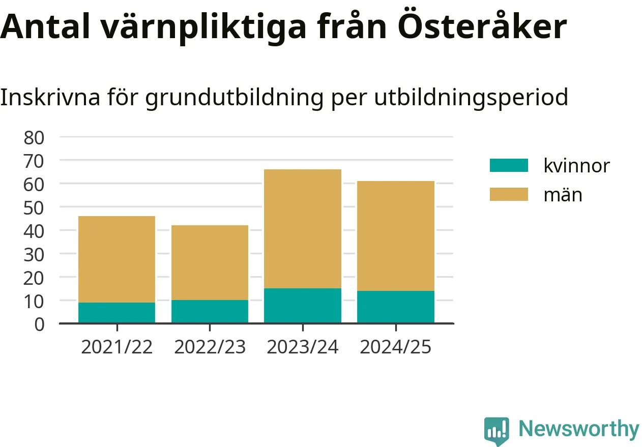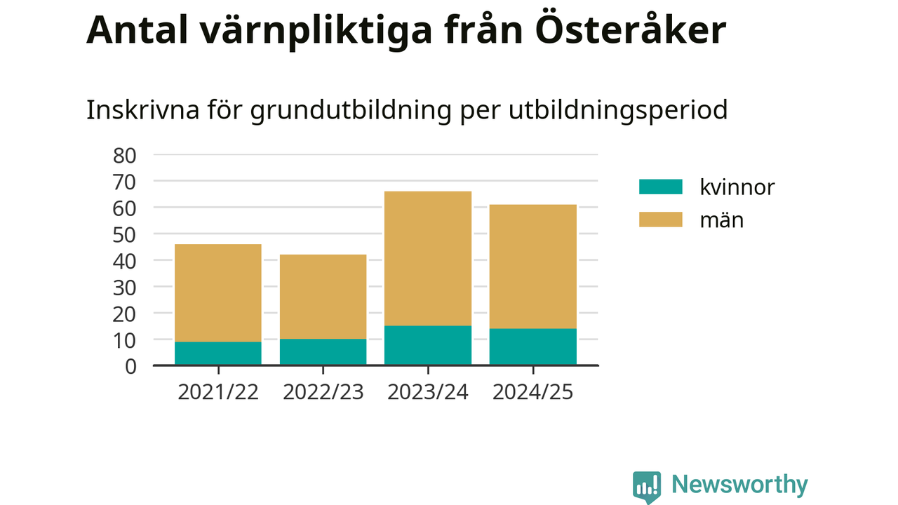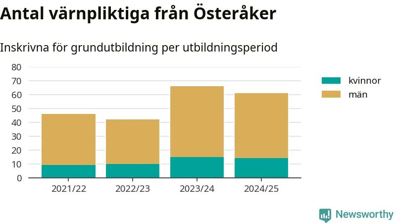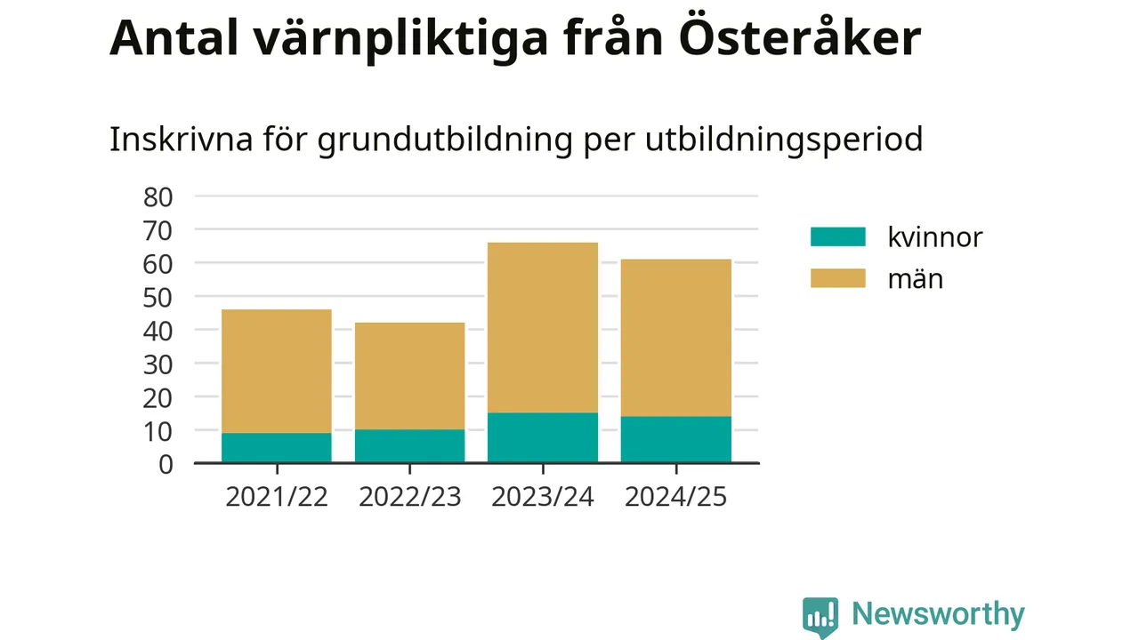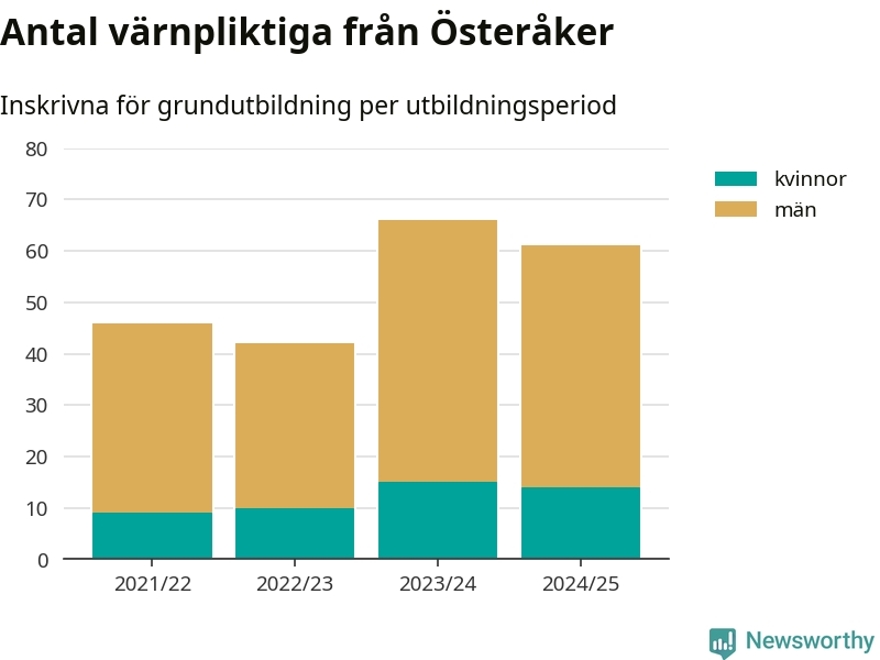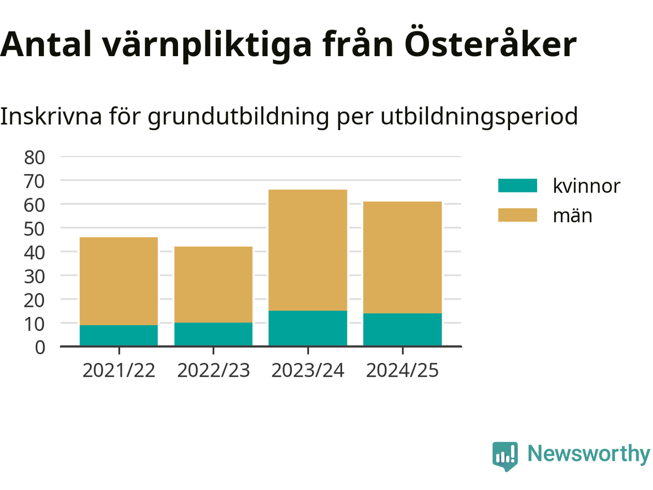 61 värnpliktiga från Österåker har skrivits in för att göra lumpen under innevarande utbildningsperiod, som sträcker sig från juni 2024 till och med första halvåret 2025. Det är ett färre än året innan. Den allmänna värnplikten återinfördes 2018 och vi har siffror nedbrutna på kommunnivå sedan 2021/22. Som mest har 66 personer från Österåker skrivits in, utbildningsperioden 2023/24.