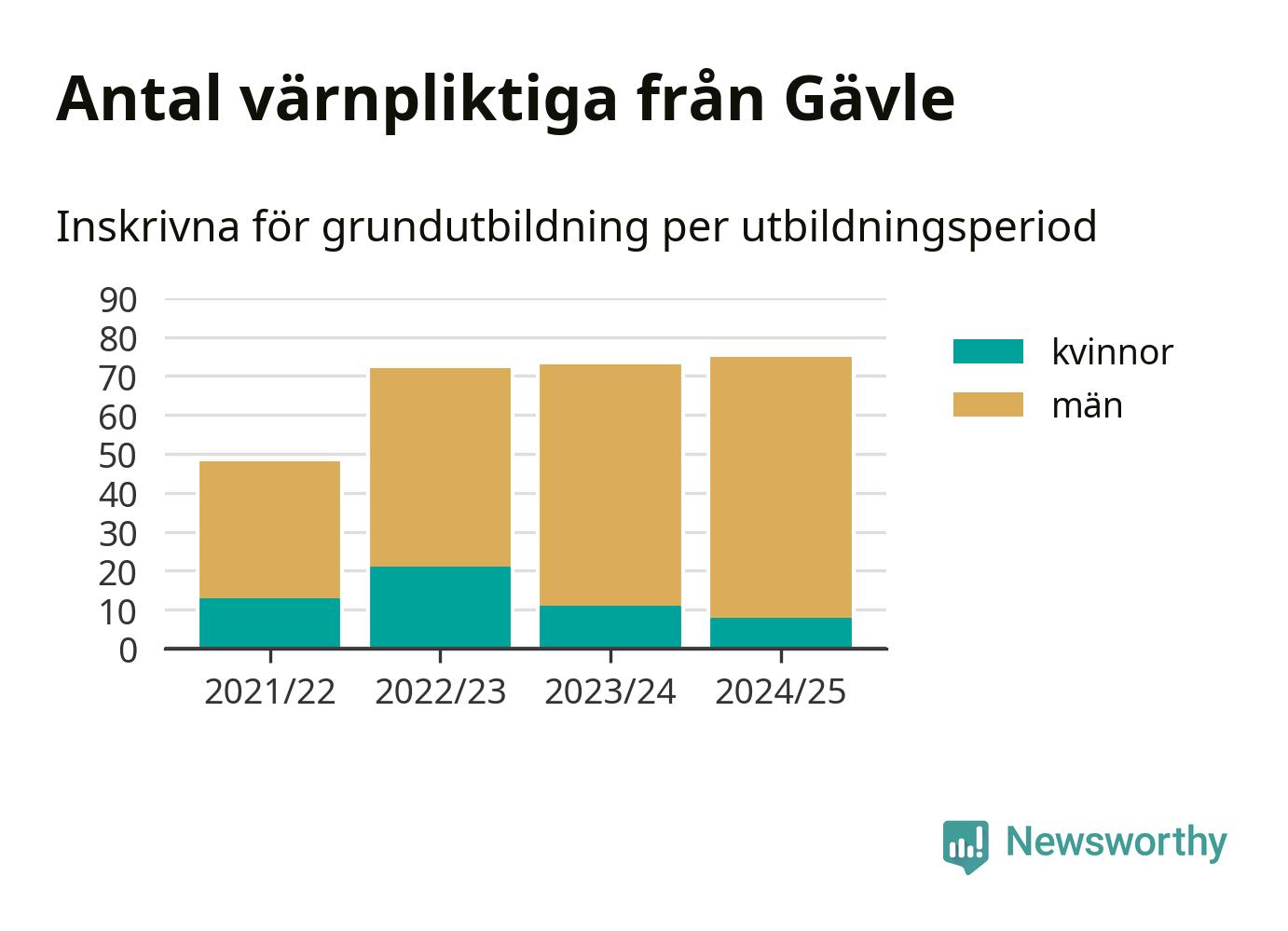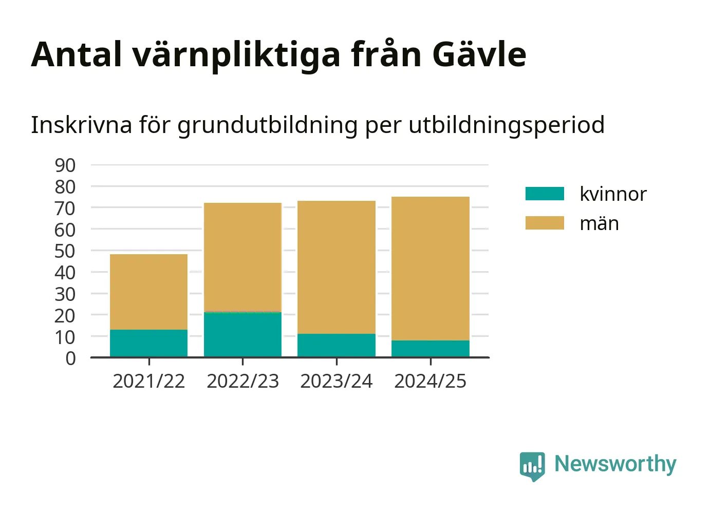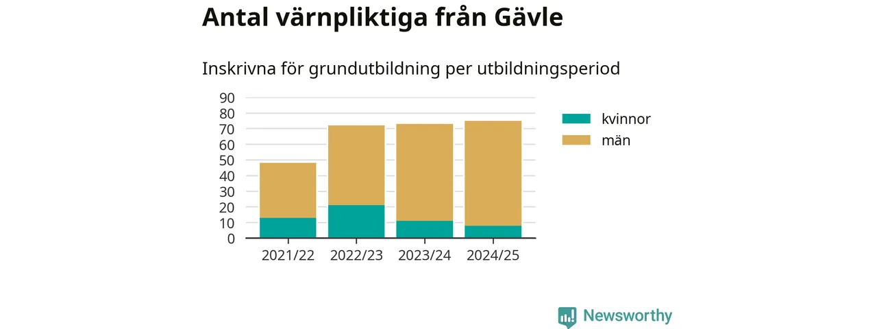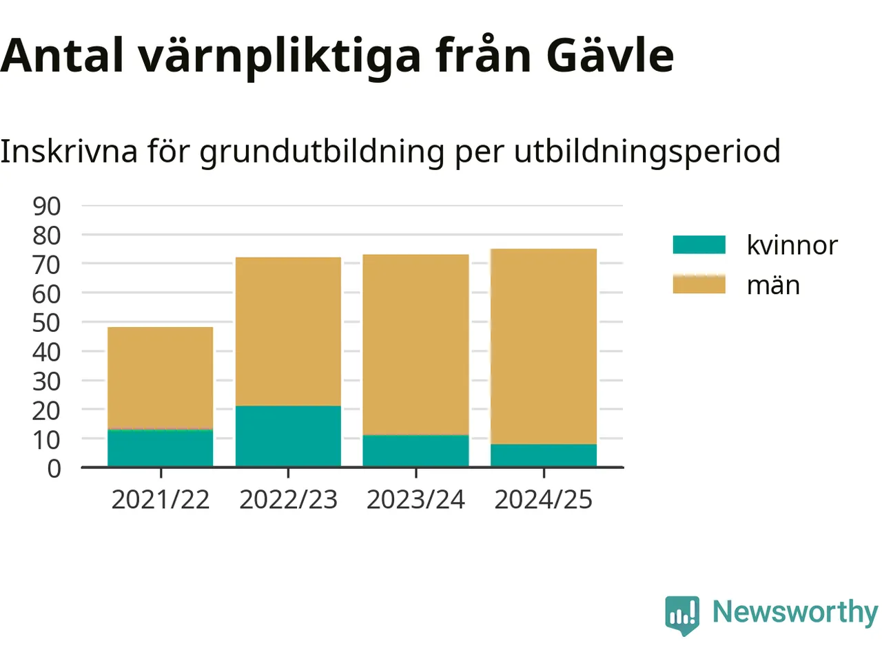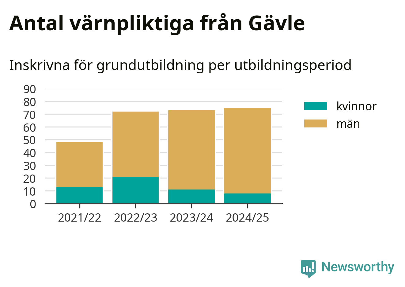 Antalet värnpliktiga från Gävle ökar stadigt, visar siffror från Plikt- och prövningsverket. Under det här värnpliktsåret, med utbildningsstart från juni 2024 till början av 2025, är 75 värnpliktiga inskrivna för att påbörja sin grundutbildning. Det är den högsta siffran åtminstone sedan 2021/22, vilket är så långt bakåt vi har siffror på kommunnivå. Den allmänna värnplikten återinfördes 2018.