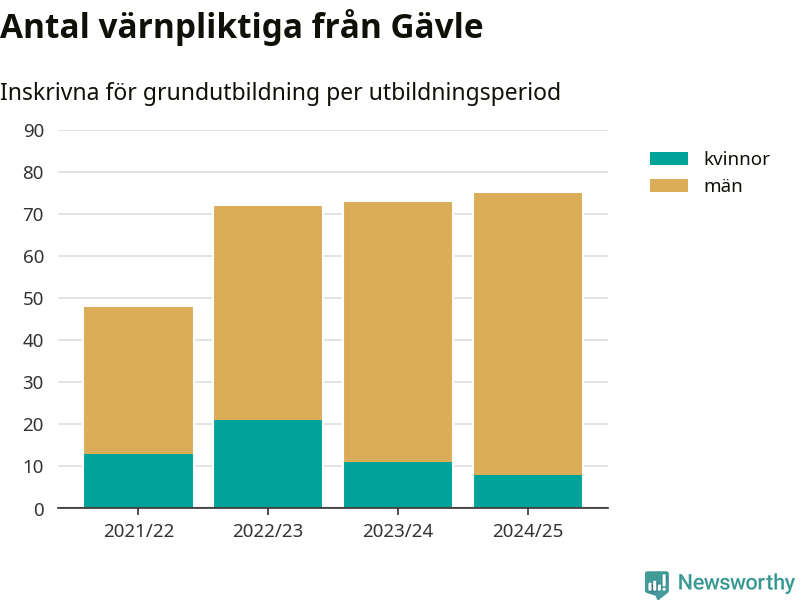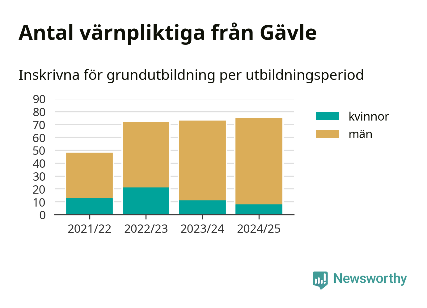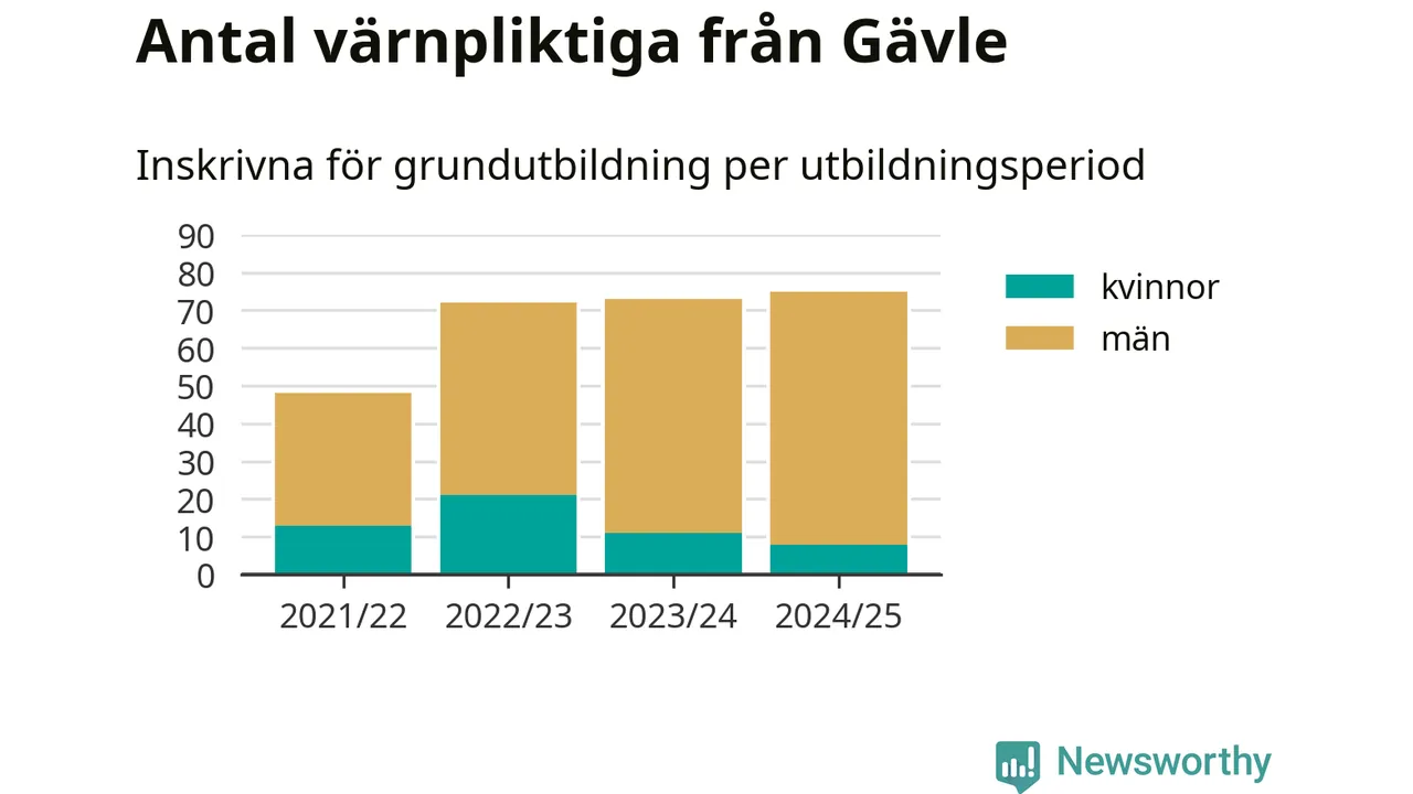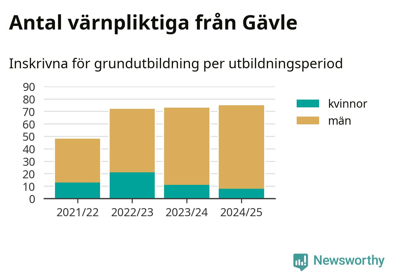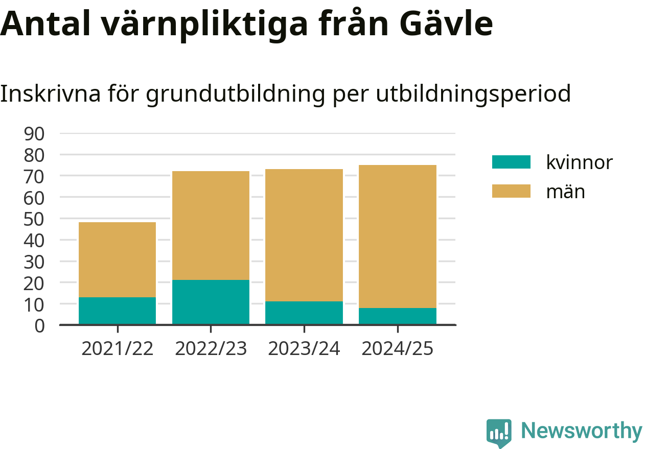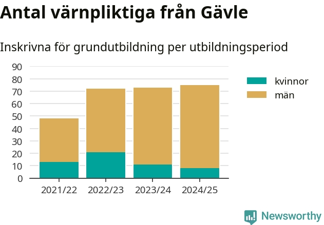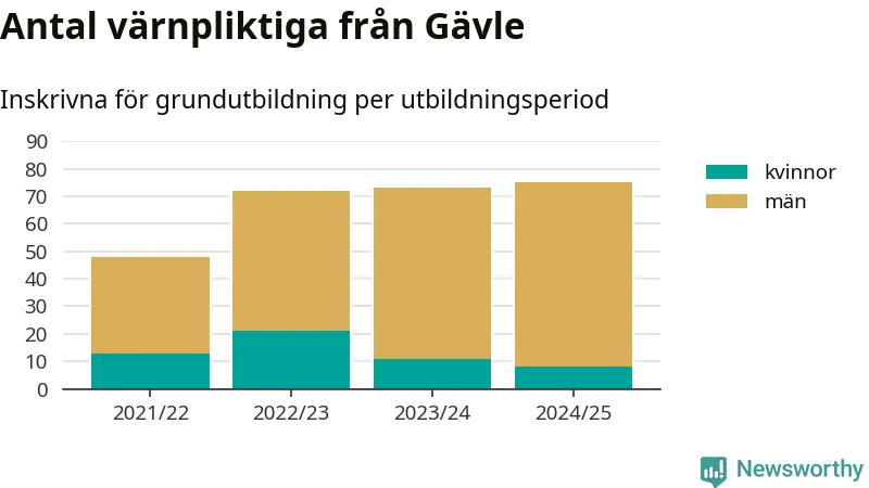 Antalet värnpliktiga från Gävle ökar stadigt, visar siffror från Plikt- och prövningsverket. Under det här värnpliktsåret, med utbildningsstart från juni 2024 till början av 2025, är 75 värnpliktiga inskrivna för att påbörja sin grundutbildning. Det är den högsta siffran åtminstone sedan 2021/22, vilket är så långt bakåt vi har siffror på kommunnivå. Den allmänna värnplikten återinfördes 2018.
