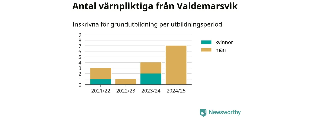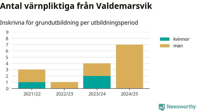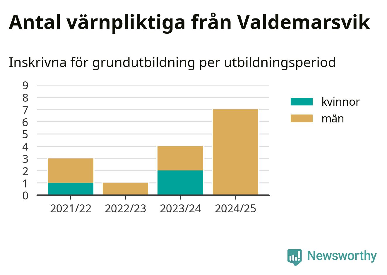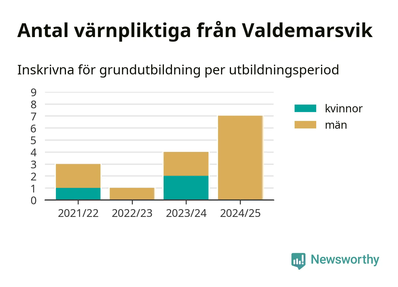 Antalet värnpliktiga från Valdemarsvik ökar stadigt, visar siffror från Plikt- och prövningsverket. Under det här värnpliktsåret, med utbildningsstart från juni 2024 till början av 2025, är sju värnpliktiga inskrivna för att påbörja sin grundutbildning. Det är den högsta siffran åtminstone sedan 2021/22, vilket är så långt bakåt vi har siffror på kommunnivå. Den allmänna värnplikten återinfördes 2018.