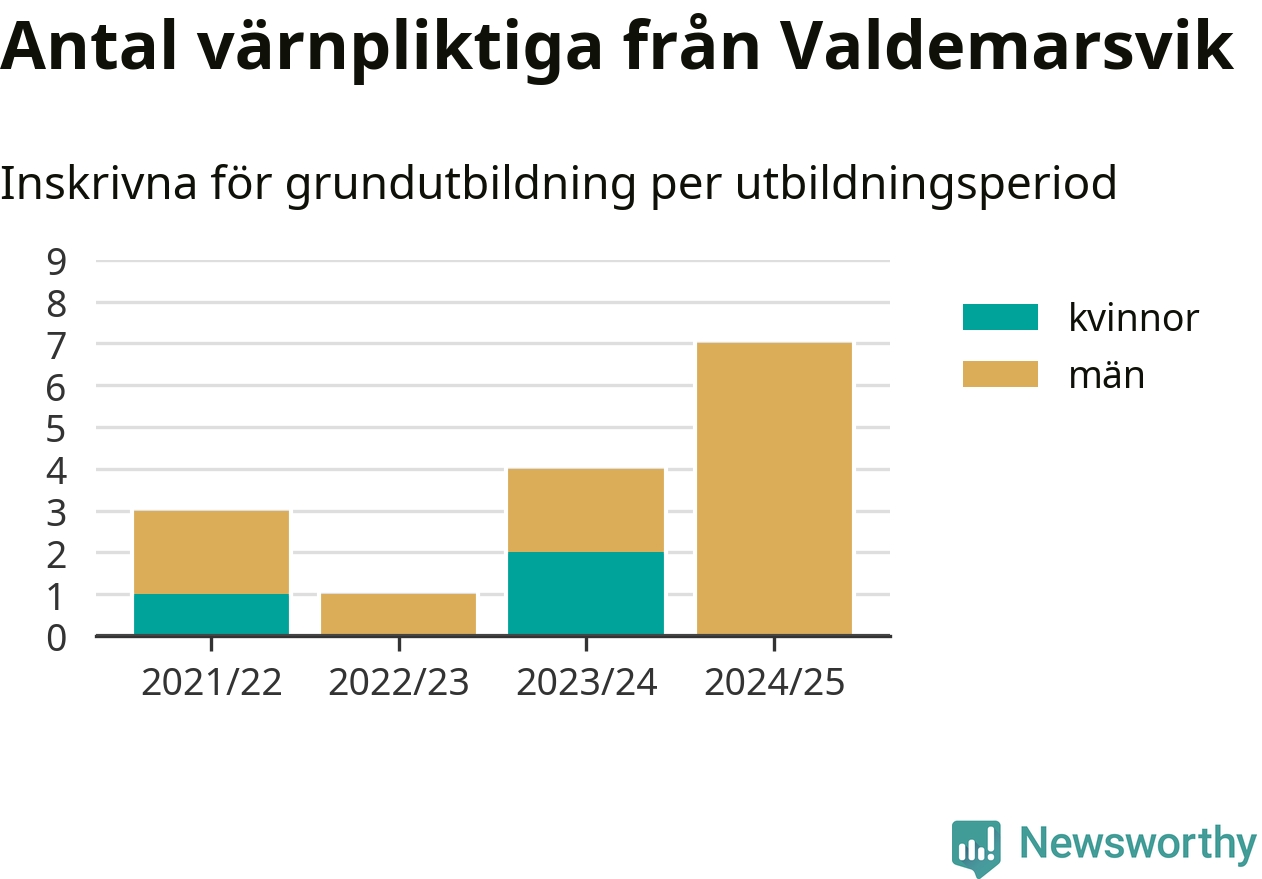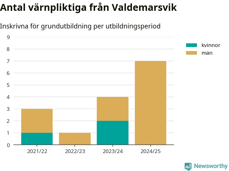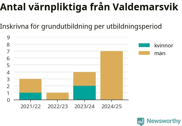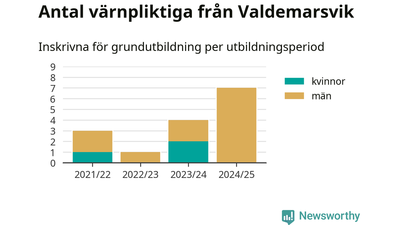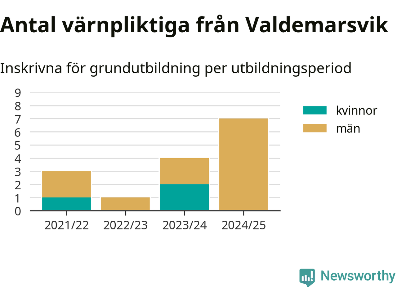 Antalet värnpliktiga från Valdemarsvik ökar stadigt, visar siffror från Plikt- och prövningsverket. Under det här värnpliktsåret, med utbildningsstart från juni 2024 till början av 2025, är sju värnpliktiga inskrivna för att påbörja sin grundutbildning. Det är den högsta siffran åtminstone sedan 2021/22, vilket är så långt bakåt vi har siffror på kommunnivå. Den allmänna värnplikten återinfördes 2018.