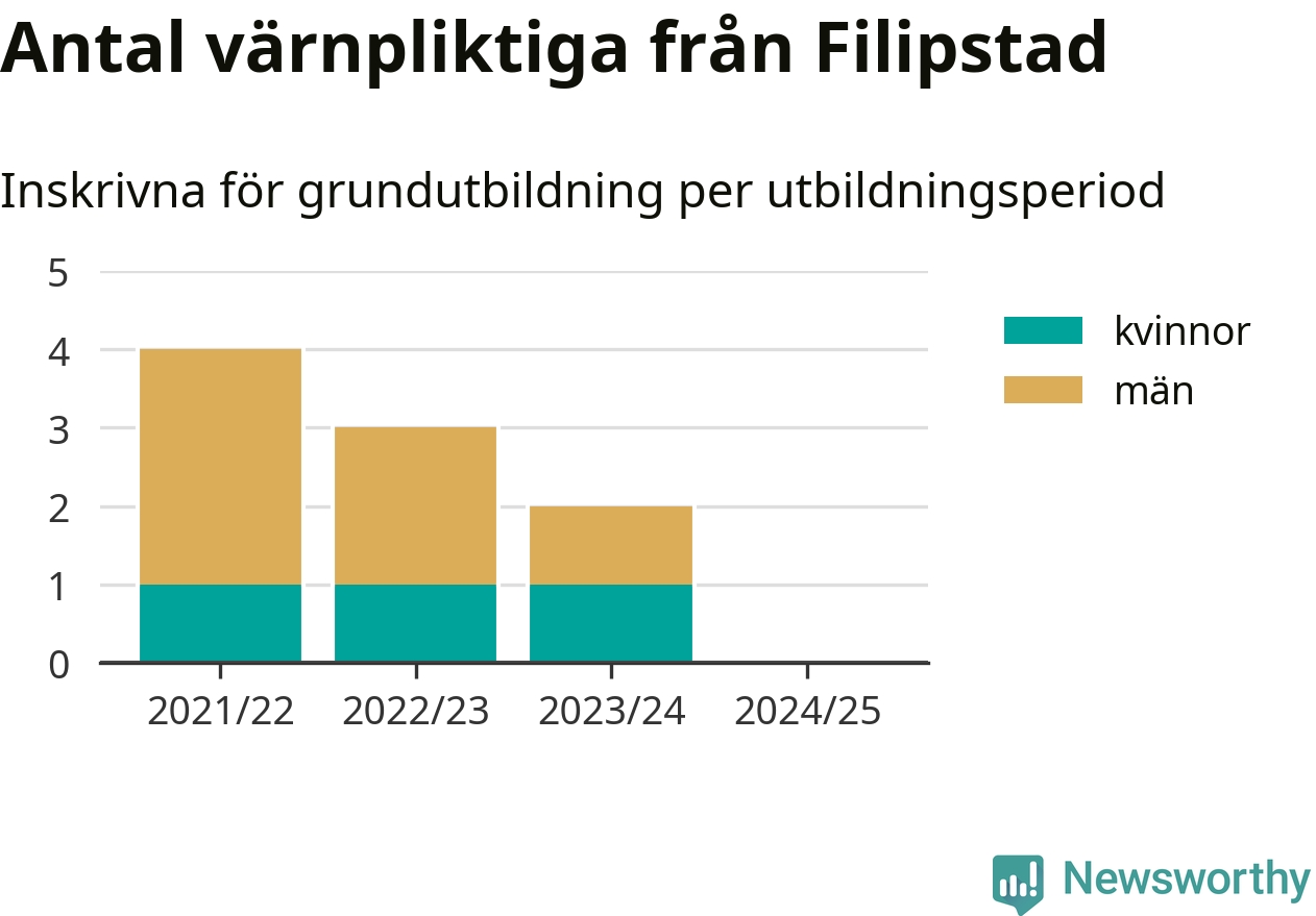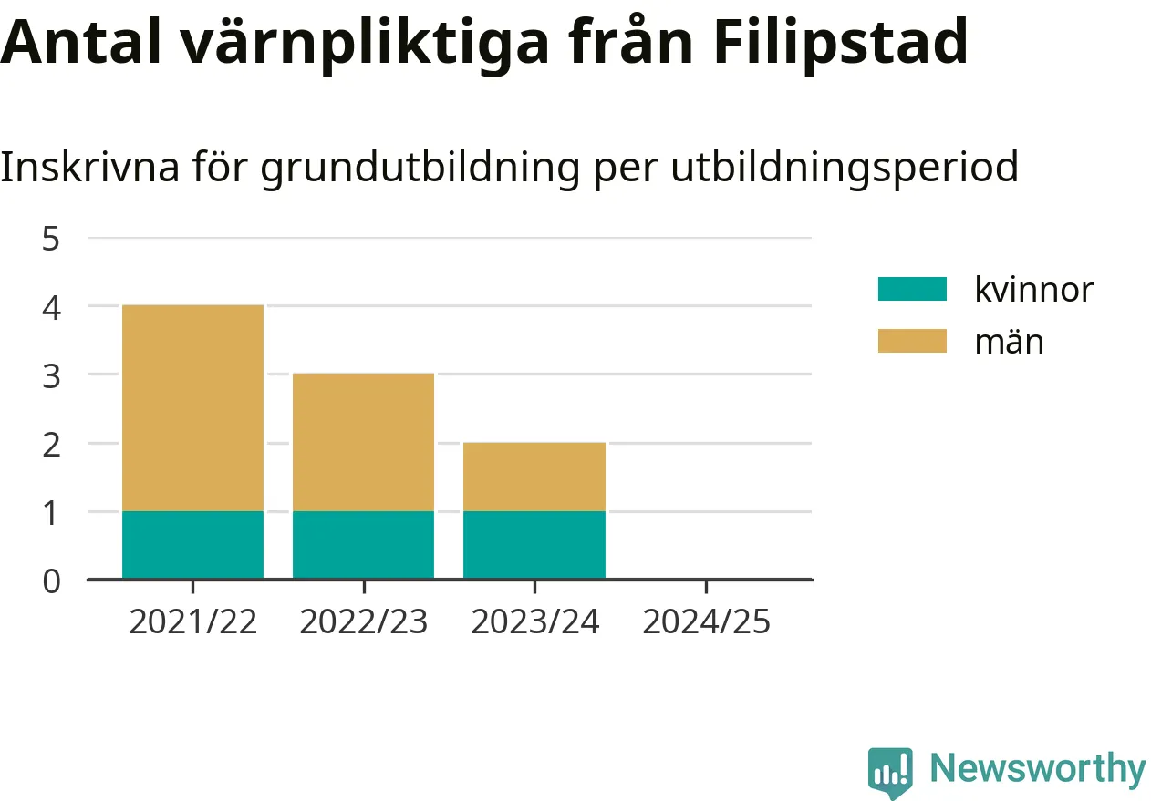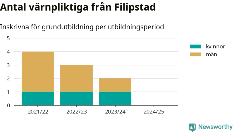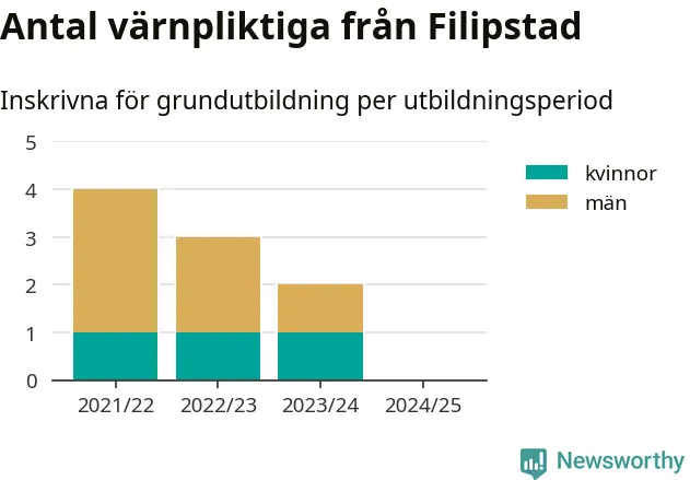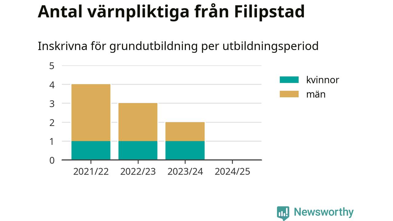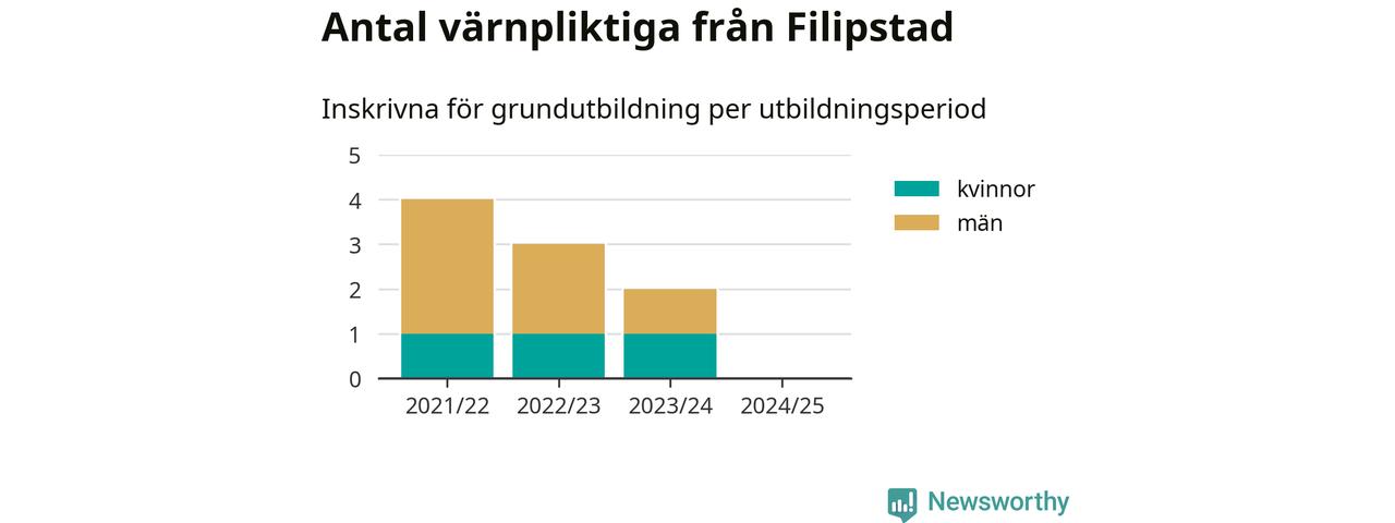 Försvarsmakten utbildar allt fler värnpliktiga, men under nuvarande värnpliktsår, som sträcker sig från juni 2024 till och med första halvåret 2025, är ingen från Filipstad inskriven för att påbörja sin grundutbildning. Förra året skrevs två personer från Filipstad in. Den allmänna värnplikten återinfördes 2018 och vi har siffror nedbrutna på kommunnivå sedan 2021/22. Som mest har fyra personer från Filipstad skrivits in, utbildningsperioden 2021/22.