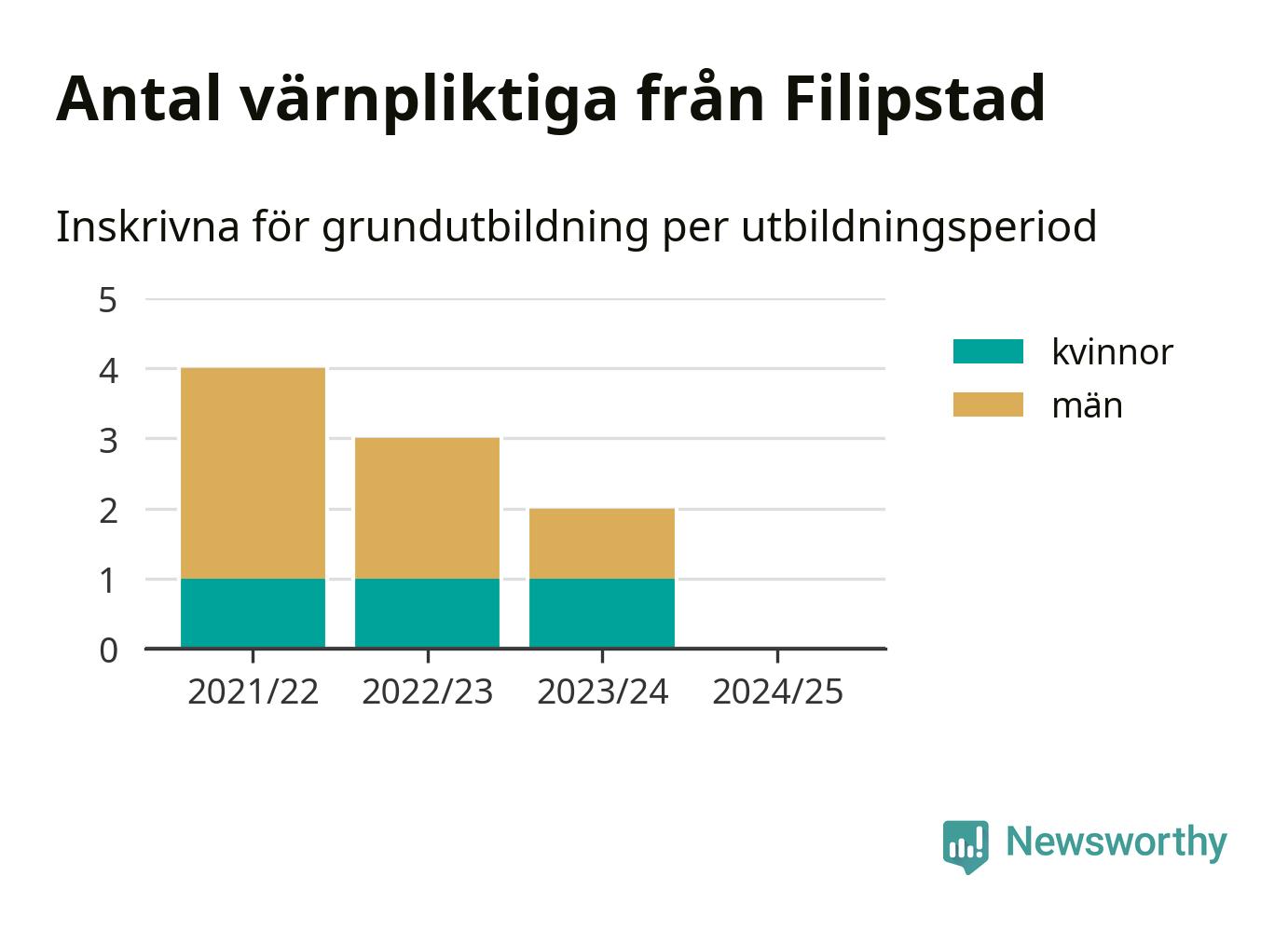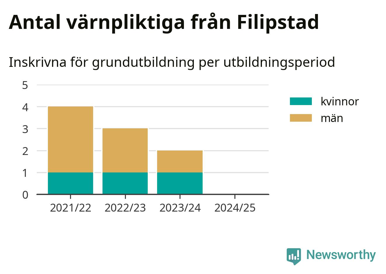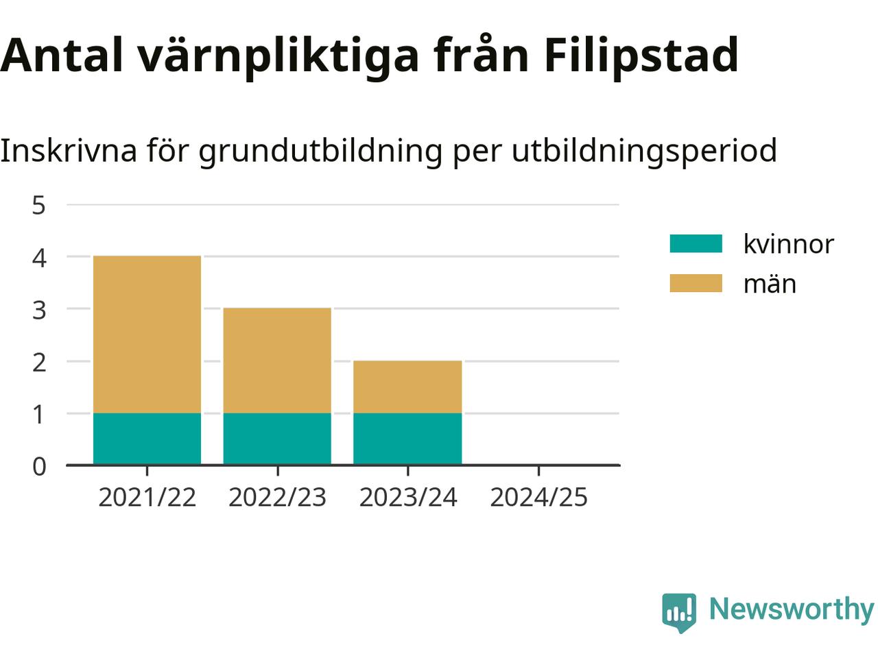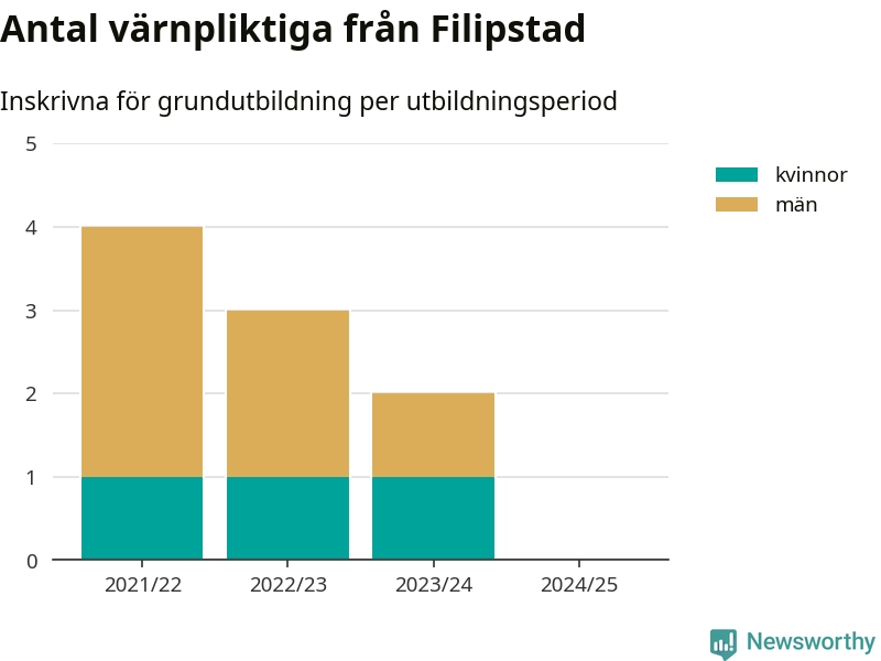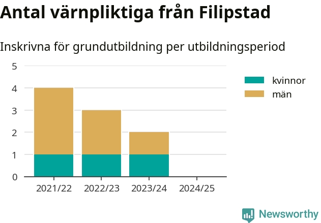 Försvarsmakten utbildar allt fler värnpliktiga, men under nuvarande värnpliktsår, som sträcker sig från juni 2024 till och med första halvåret 2025, är ingen från Filipstad inskriven för att påbörja sin grundutbildning. Förra året skrevs två personer från Filipstad in. Den allmänna värnplikten återinfördes 2018 och vi har siffror nedbrutna på kommunnivå sedan 2021/22. Som mest har fyra personer från Filipstad skrivits in, utbildningsperioden 2021/22.