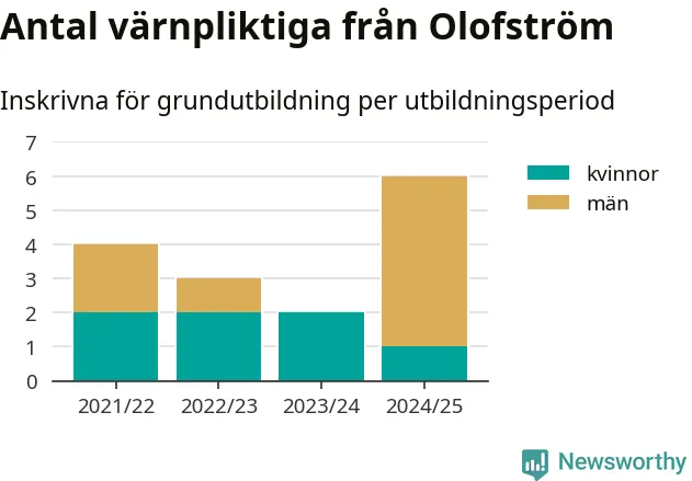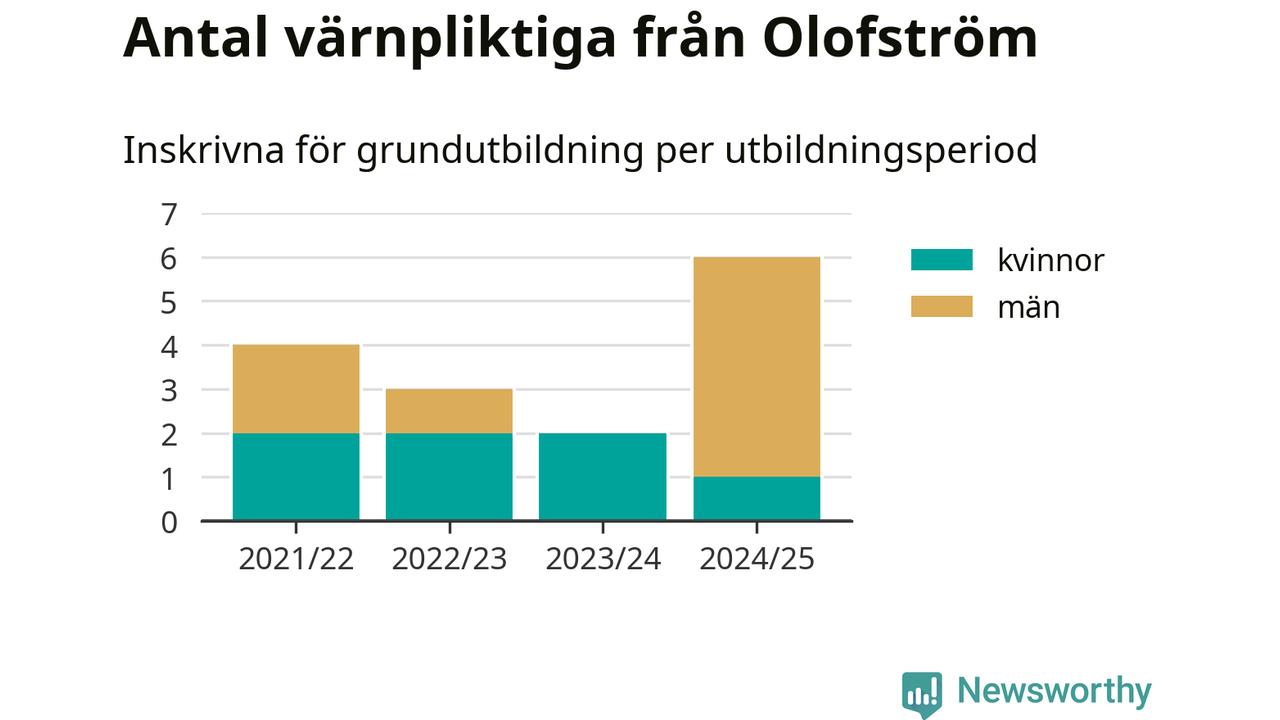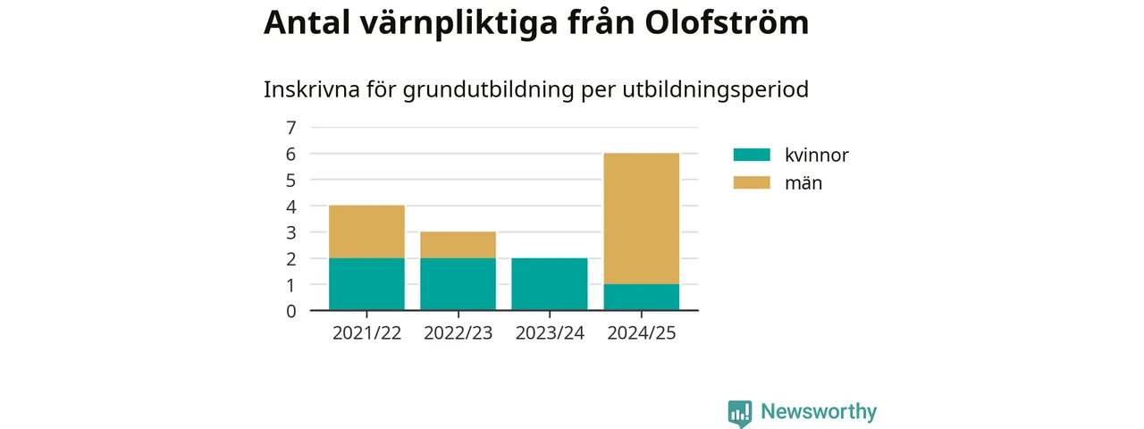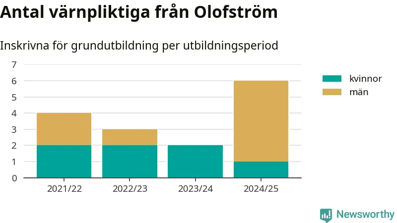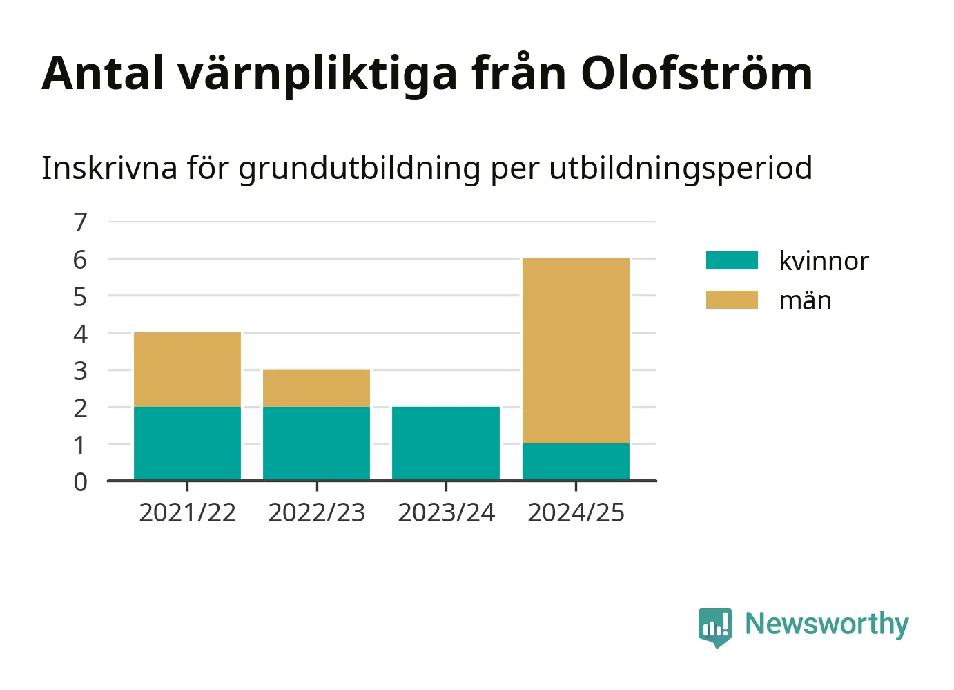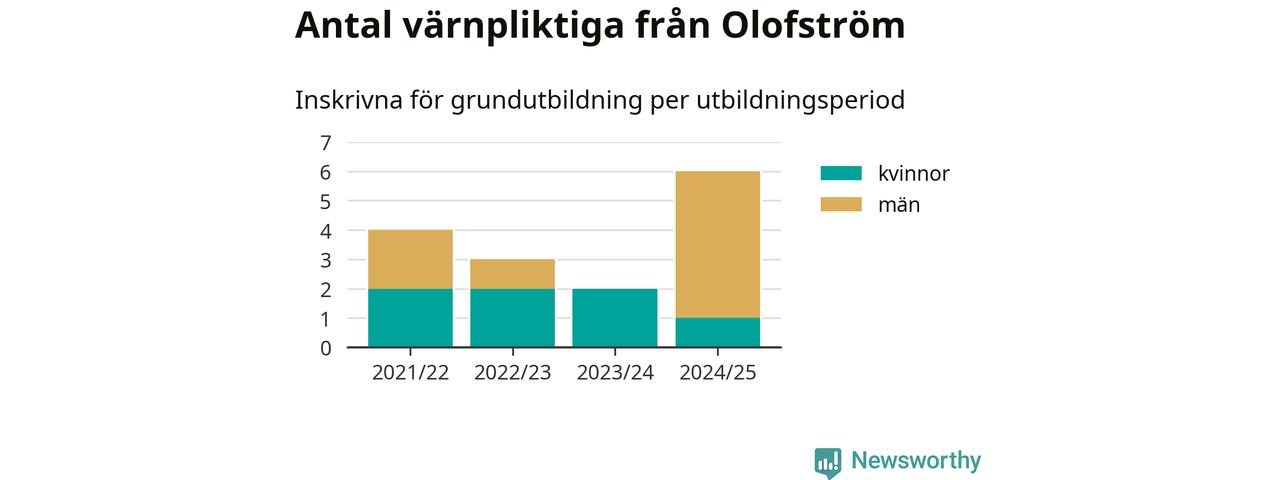 Sex värnpliktiga från Olofström har skrivits in för att göra lumpen under innevarande utbildningsperiod, som sträcker sig från juni 2024 till och med första halvåret 2025. Det är den högsta siffran åtminstone sedan 2021/22, vilket är så långt bakåt vi har siffror på kommunnivå. Den allmänna värnplikten återinfördes 2018.