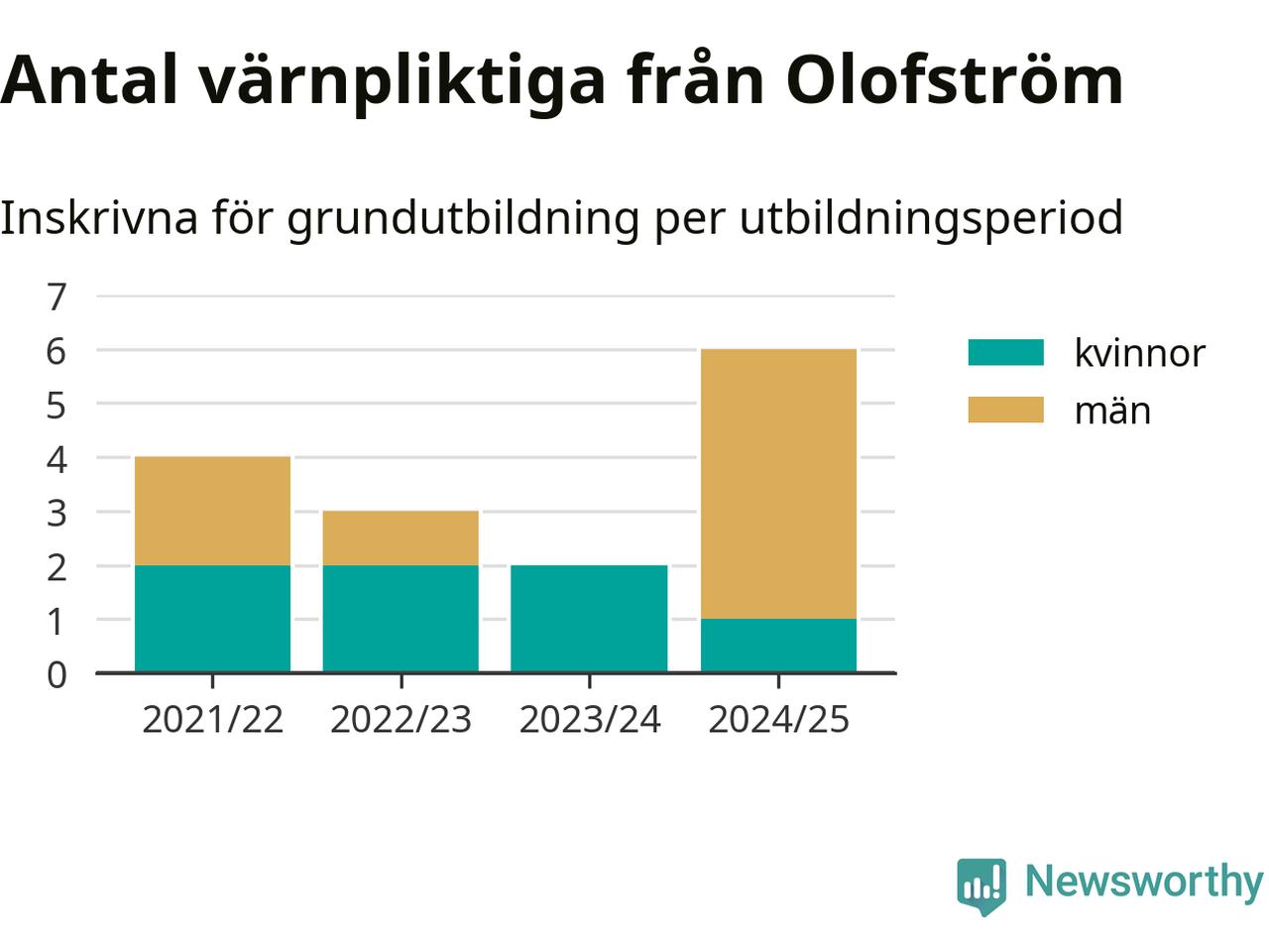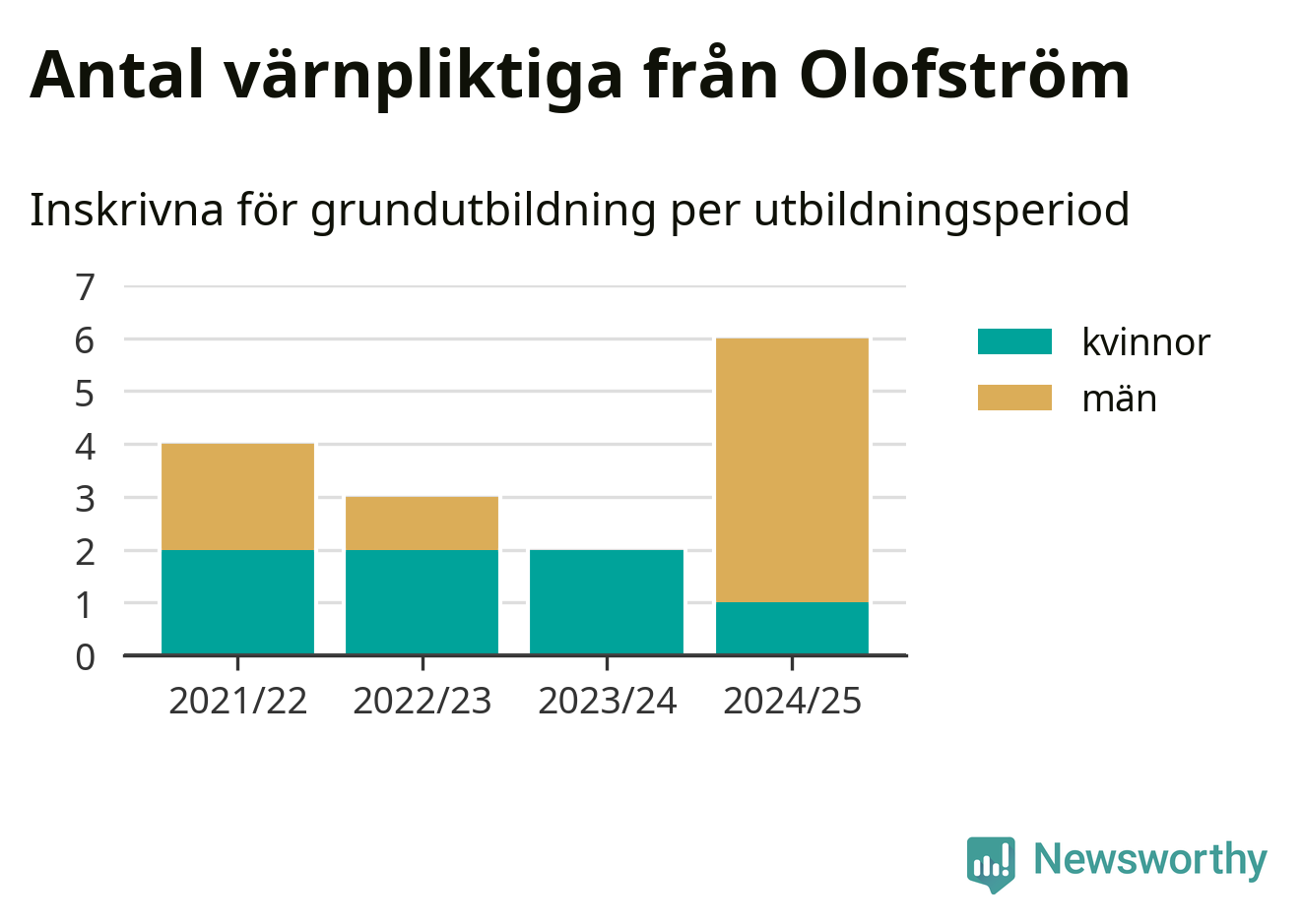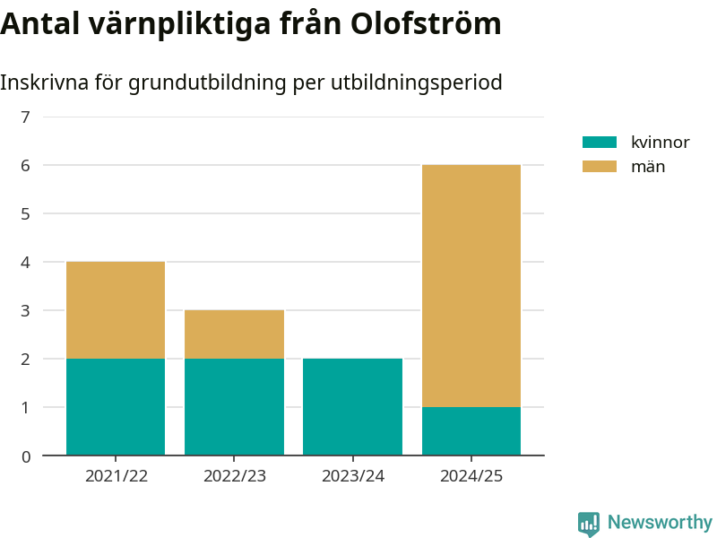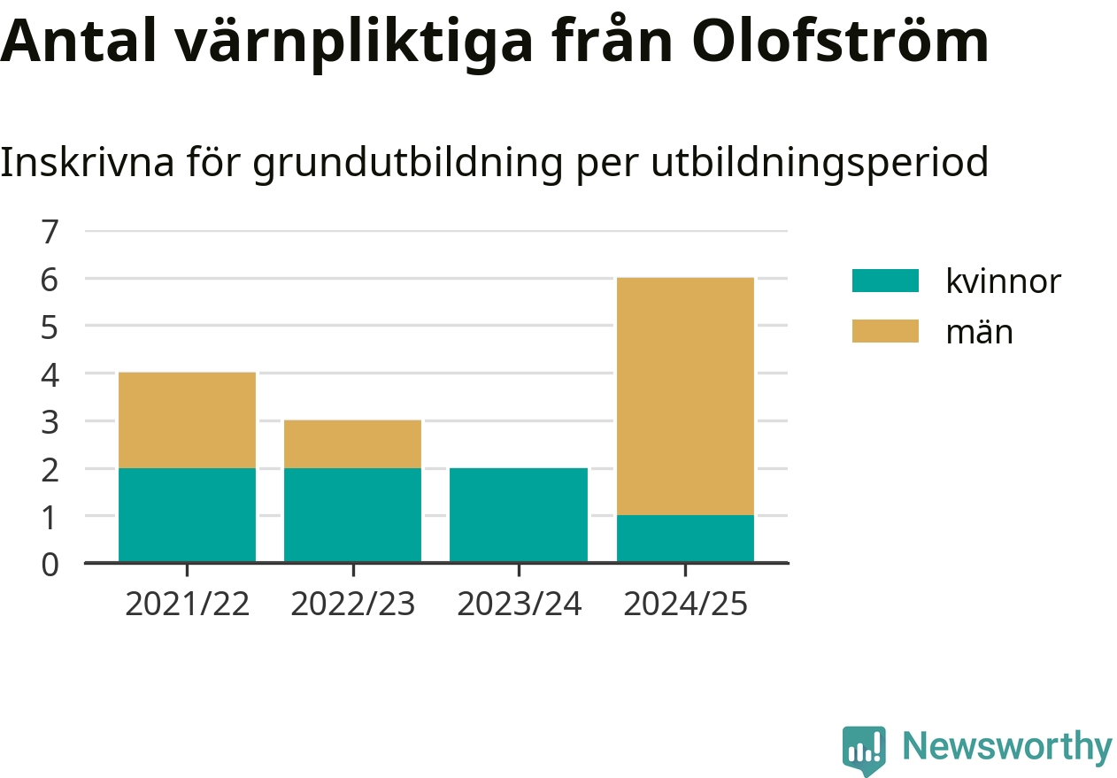 Sex värnpliktiga från Olofström har skrivits in för att göra lumpen under innevarande utbildningsperiod, som sträcker sig från juni 2024 till och med första halvåret 2025. Det är den högsta siffran åtminstone sedan 2021/22, vilket är så långt bakåt vi har siffror på kommunnivå. Den allmänna värnplikten återinfördes 2018.