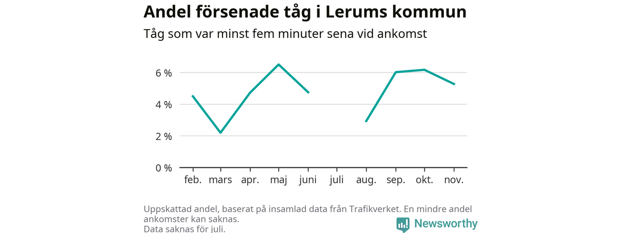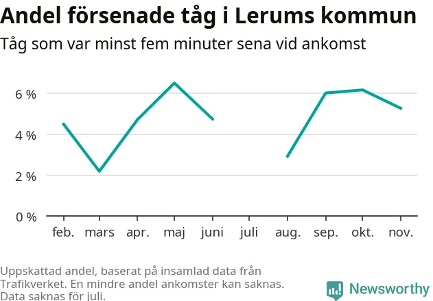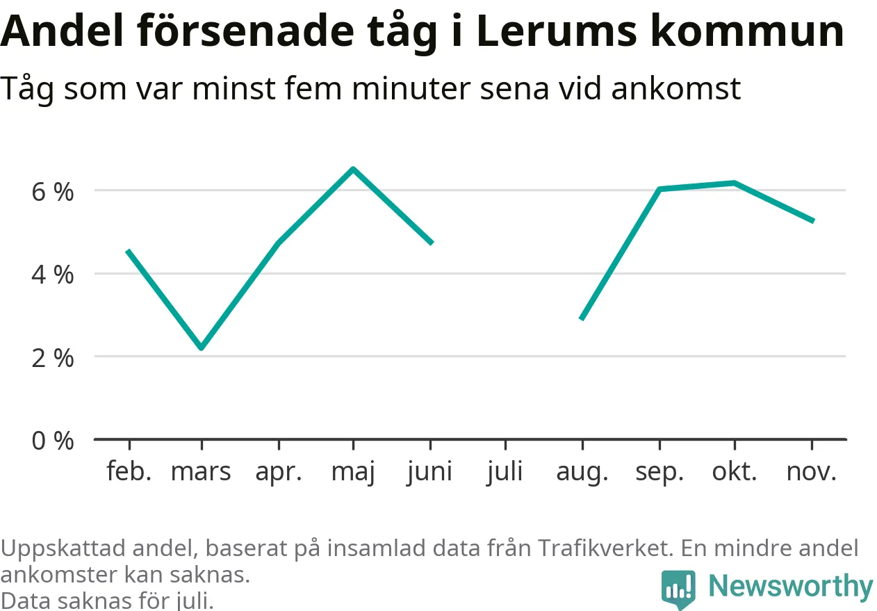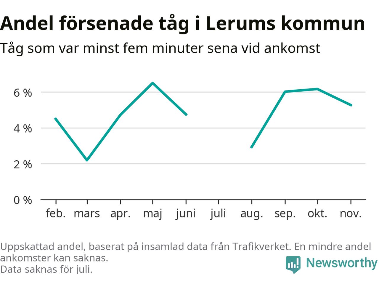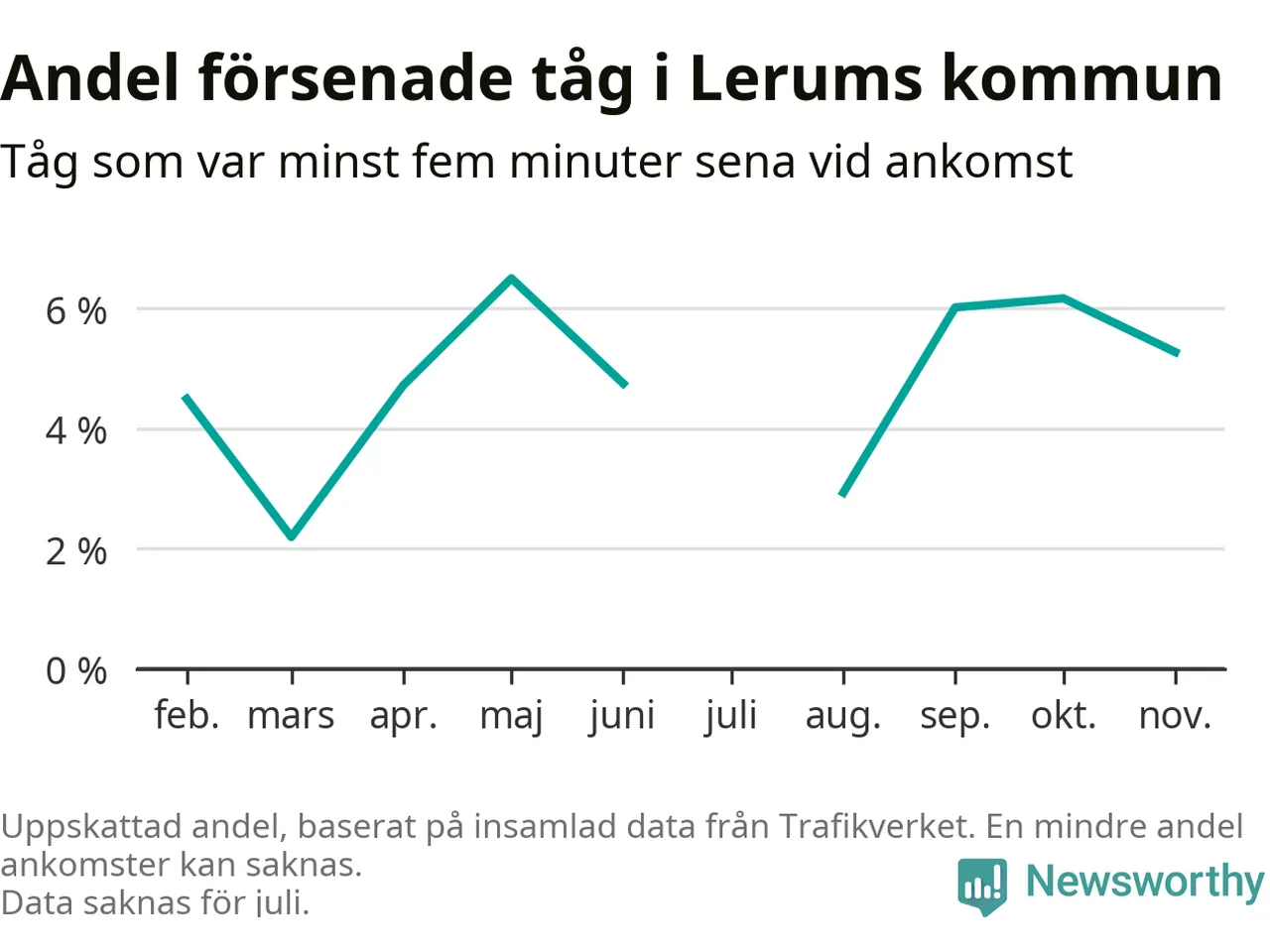 Den svenska tågtrafiken har dragits med historiskt dålig punktlig under första halvan av 2024. Juni månad har dock sett något bättre ut än maj. Newsworthy har samlat in tågens ankomsttider under november, för att se hur stor andel av tågen till Lerums kommun som var i tid under den senaste månaden.