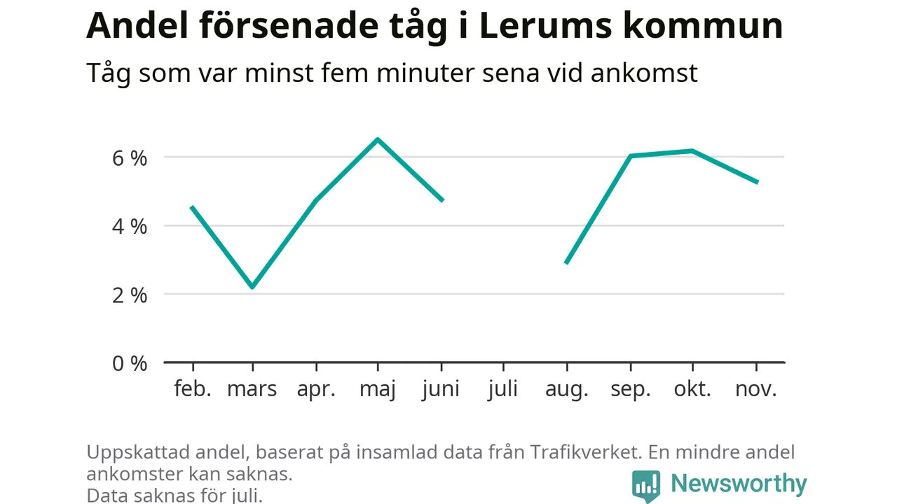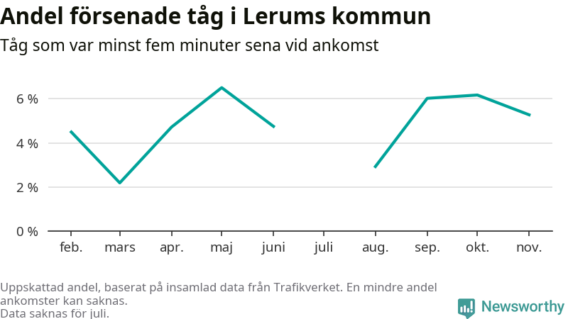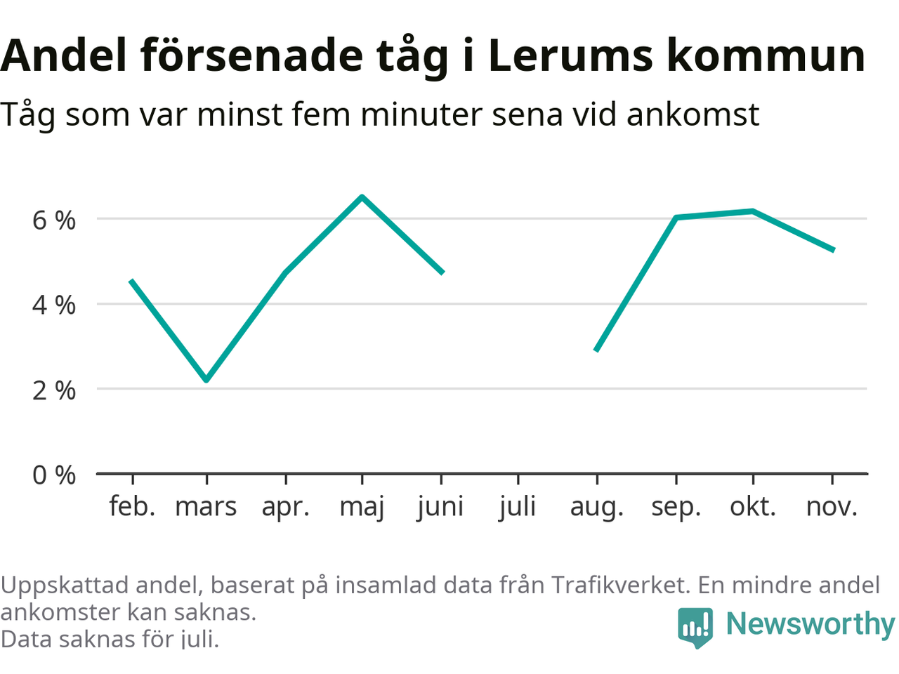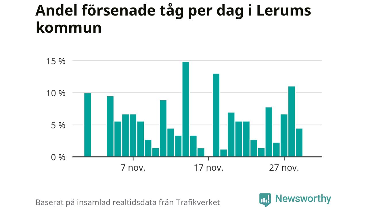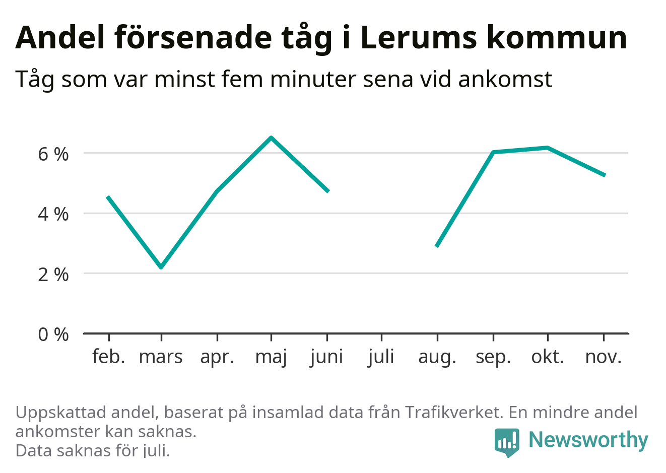 Den svenska tågtrafiken har dragits med historiskt dålig punktlig under första halvan av 2024. Juni månad har dock sett något bättre ut än maj. Newsworthy har samlat in tågens ankomsttider under november, för att se hur stor andel av tågen till Lerums kommun som var i tid under den senaste månaden.