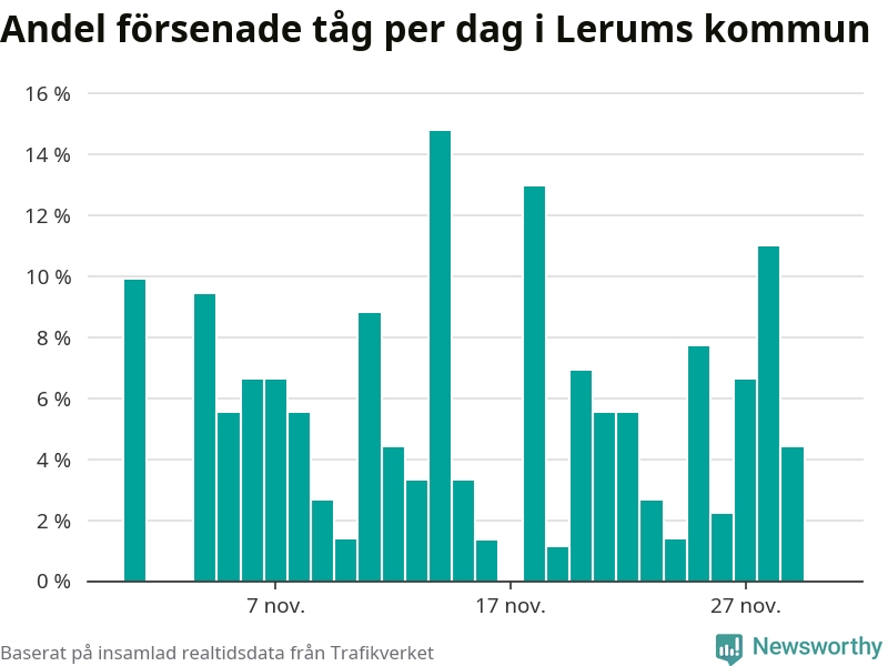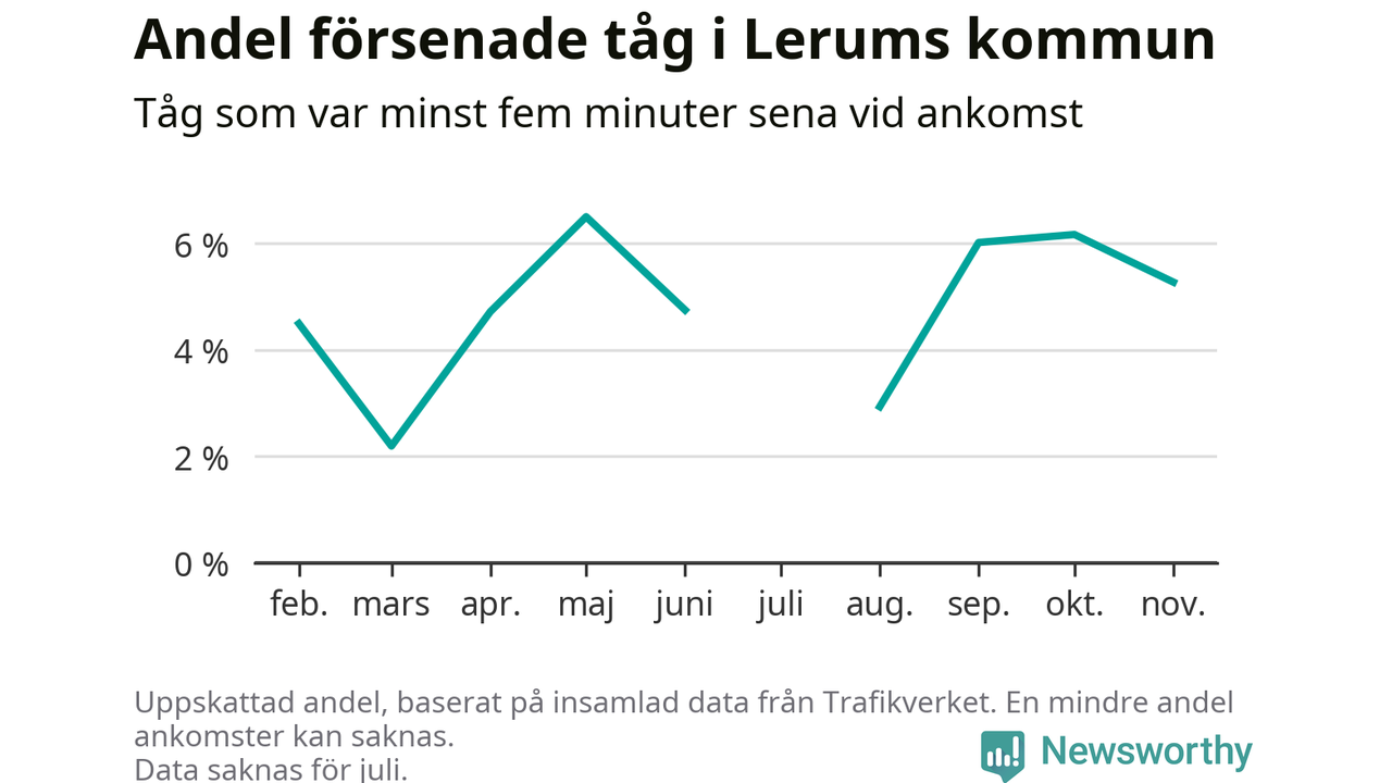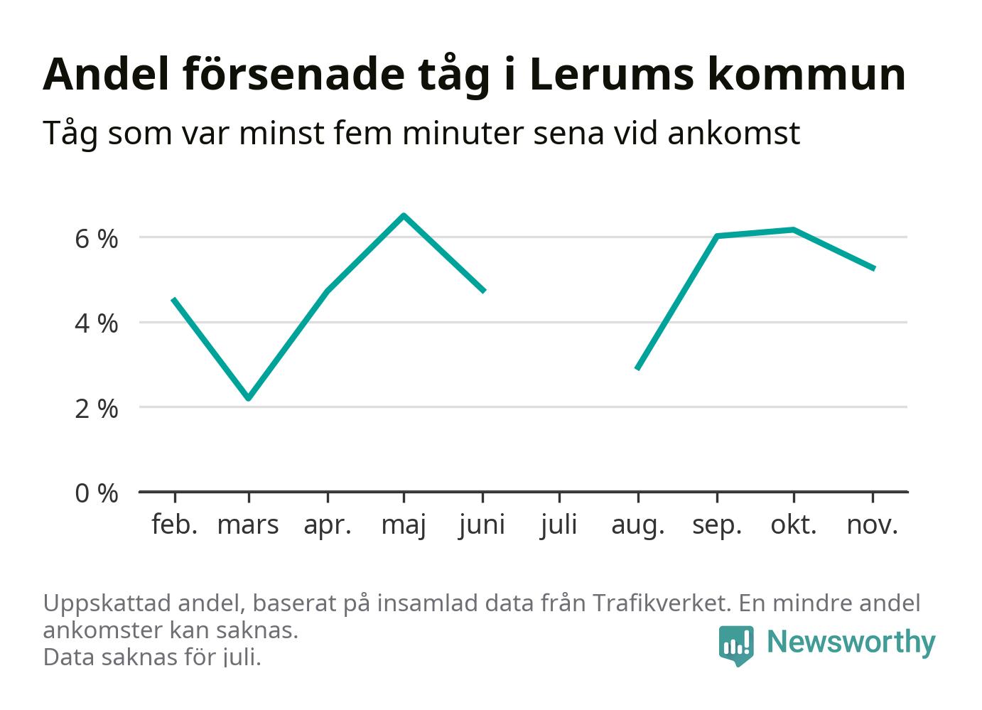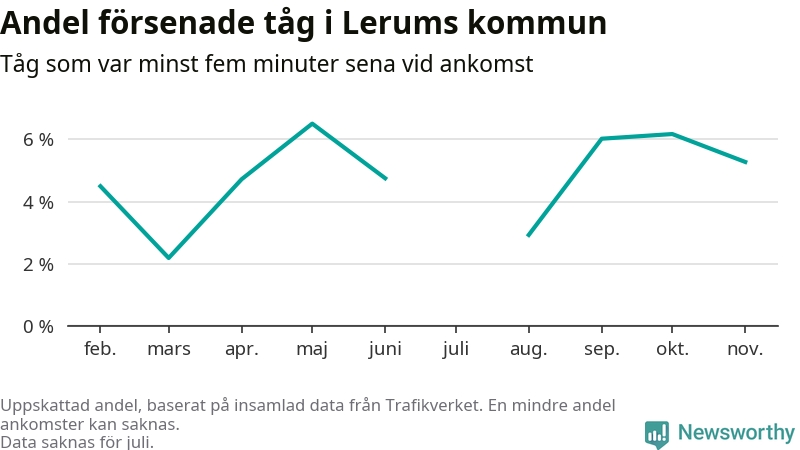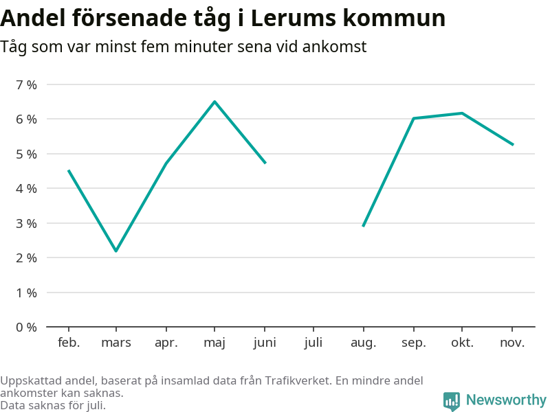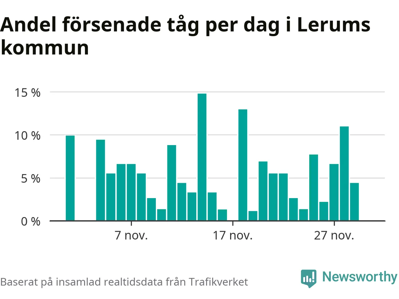 Den svenska tågtrafiken har dragits med historiskt dålig punktlig under första halvan av 2024. Juni månad har dock sett något bättre ut än maj. Newsworthy har samlat in tågens ankomsttider under november, för att se hur stor andel av tågen till Lerums kommun som var i tid under den senaste månaden.