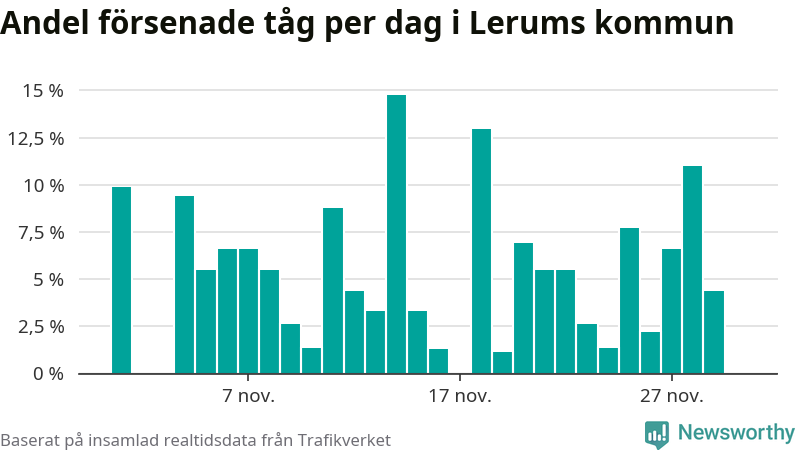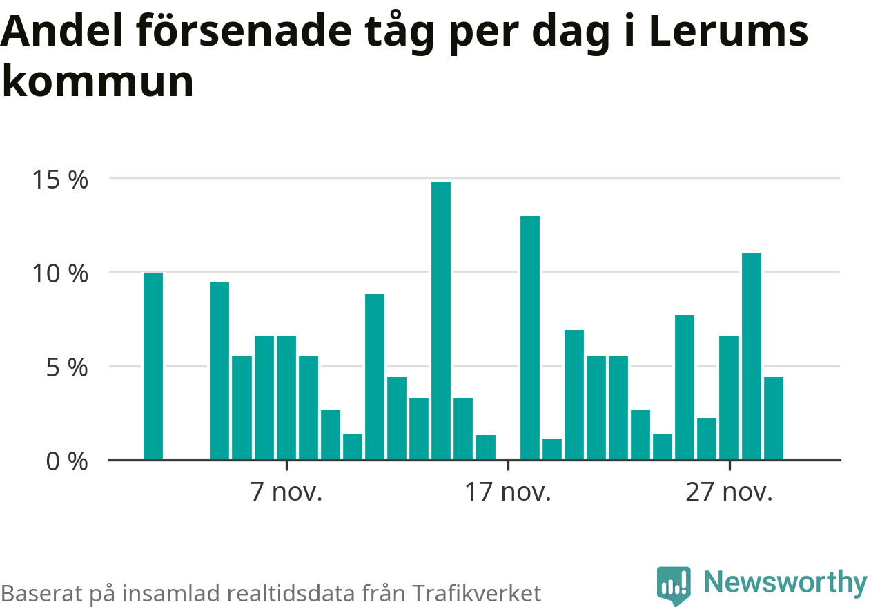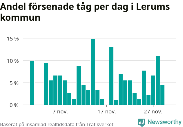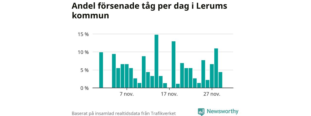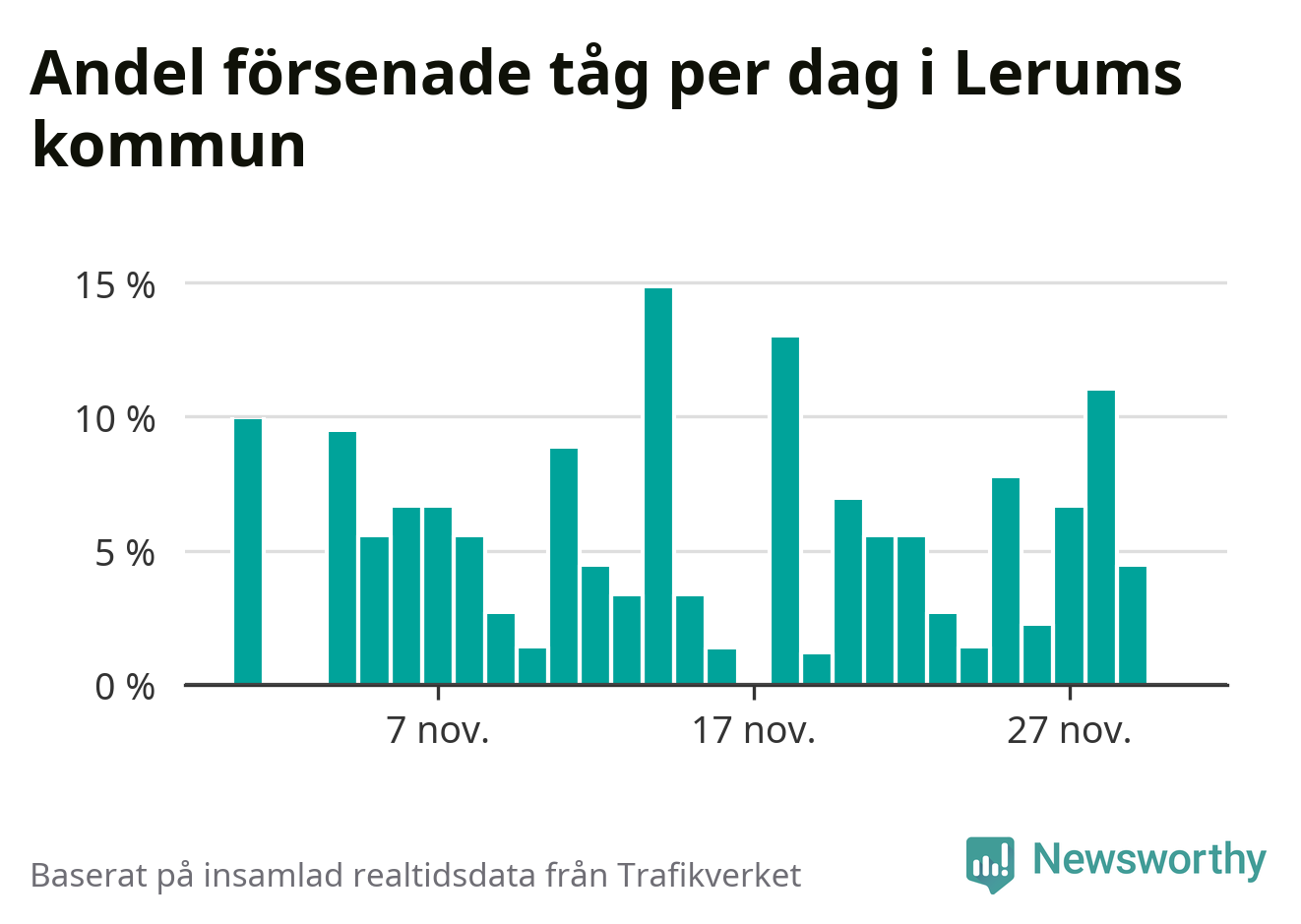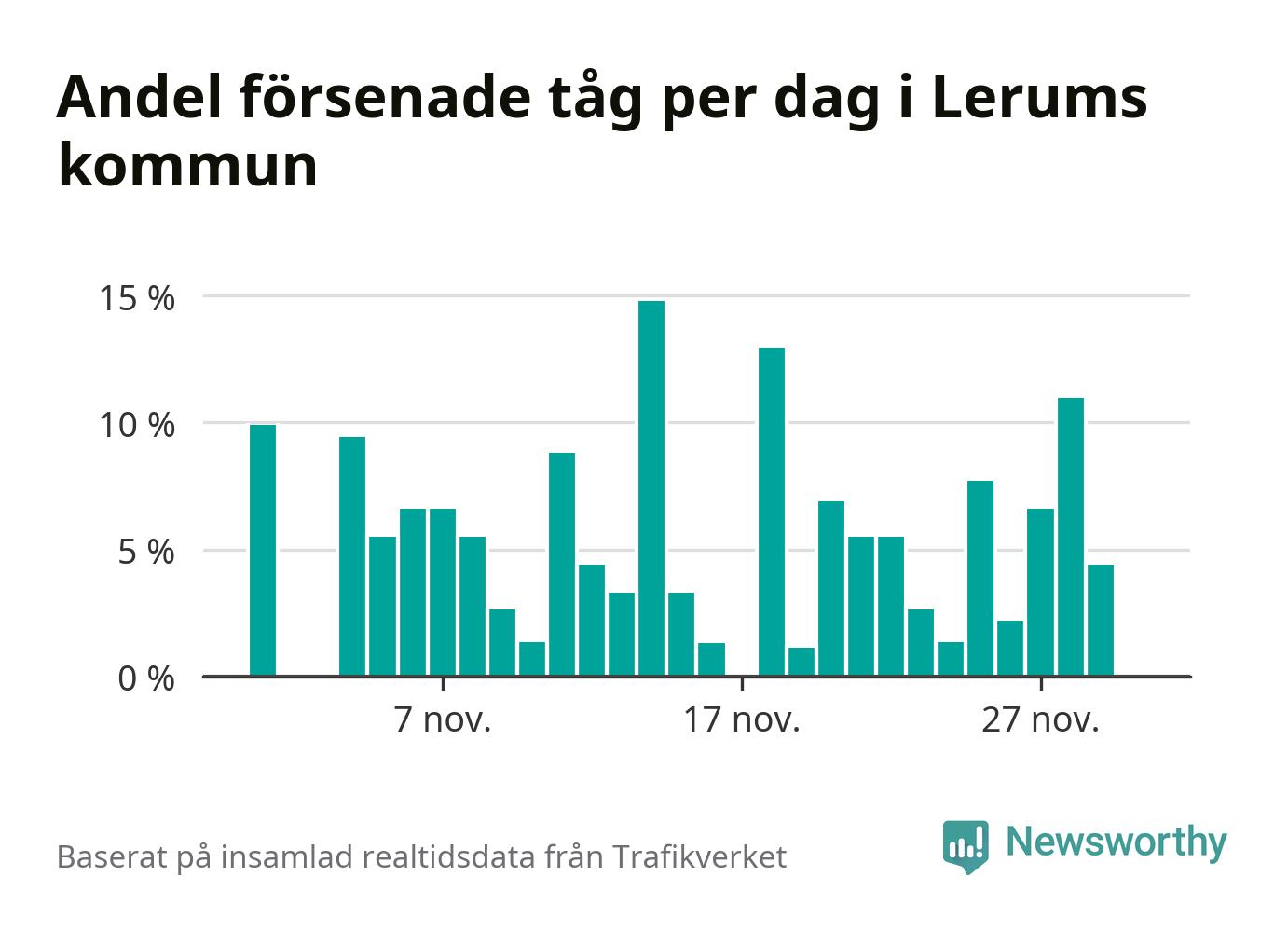 Totalt var fem procent av de ankommande tågen i Lerums kommun mer än fem minuter försenade under november bland de tåg som angjorde någon av stationerna i kommunen.
