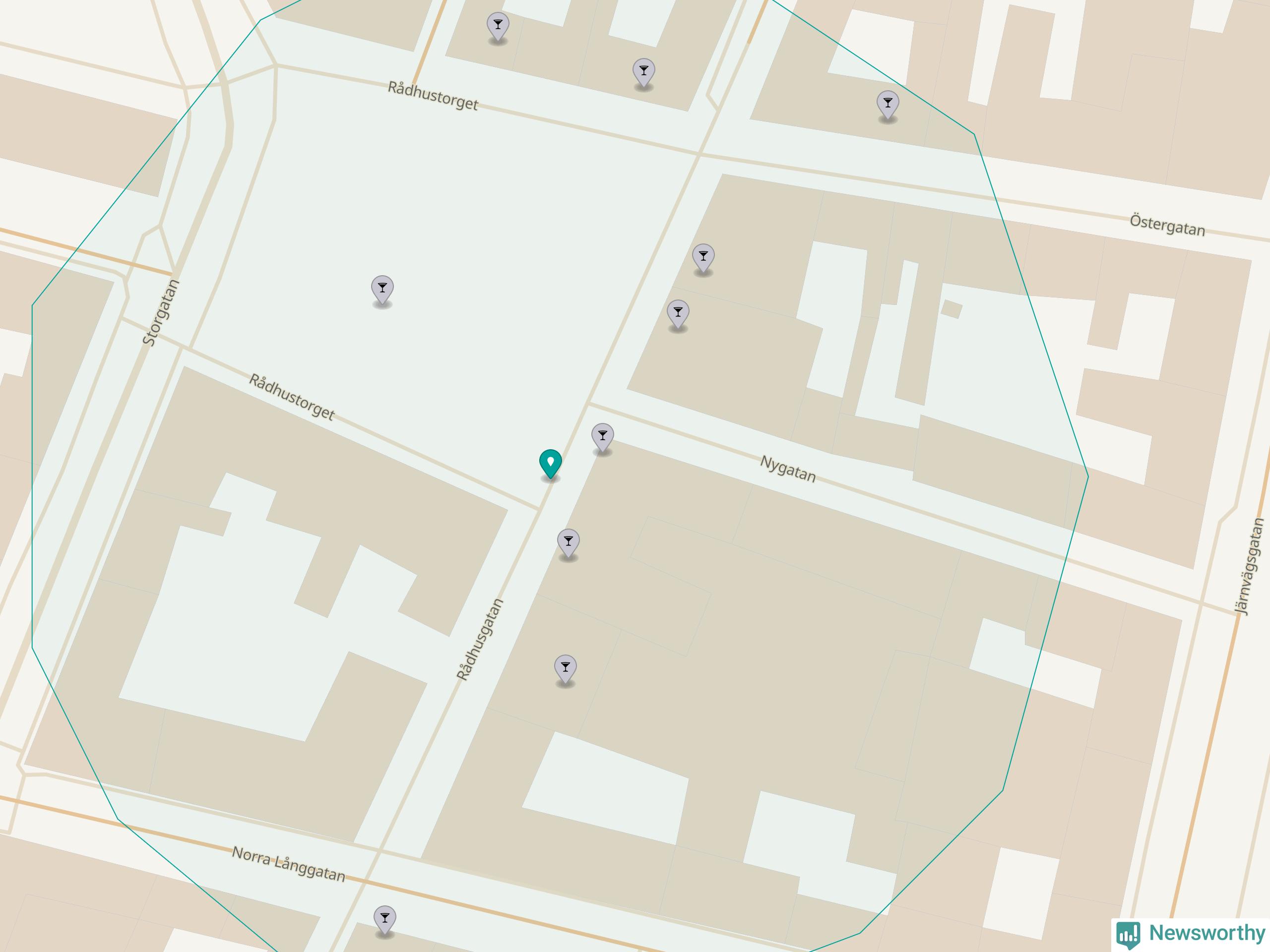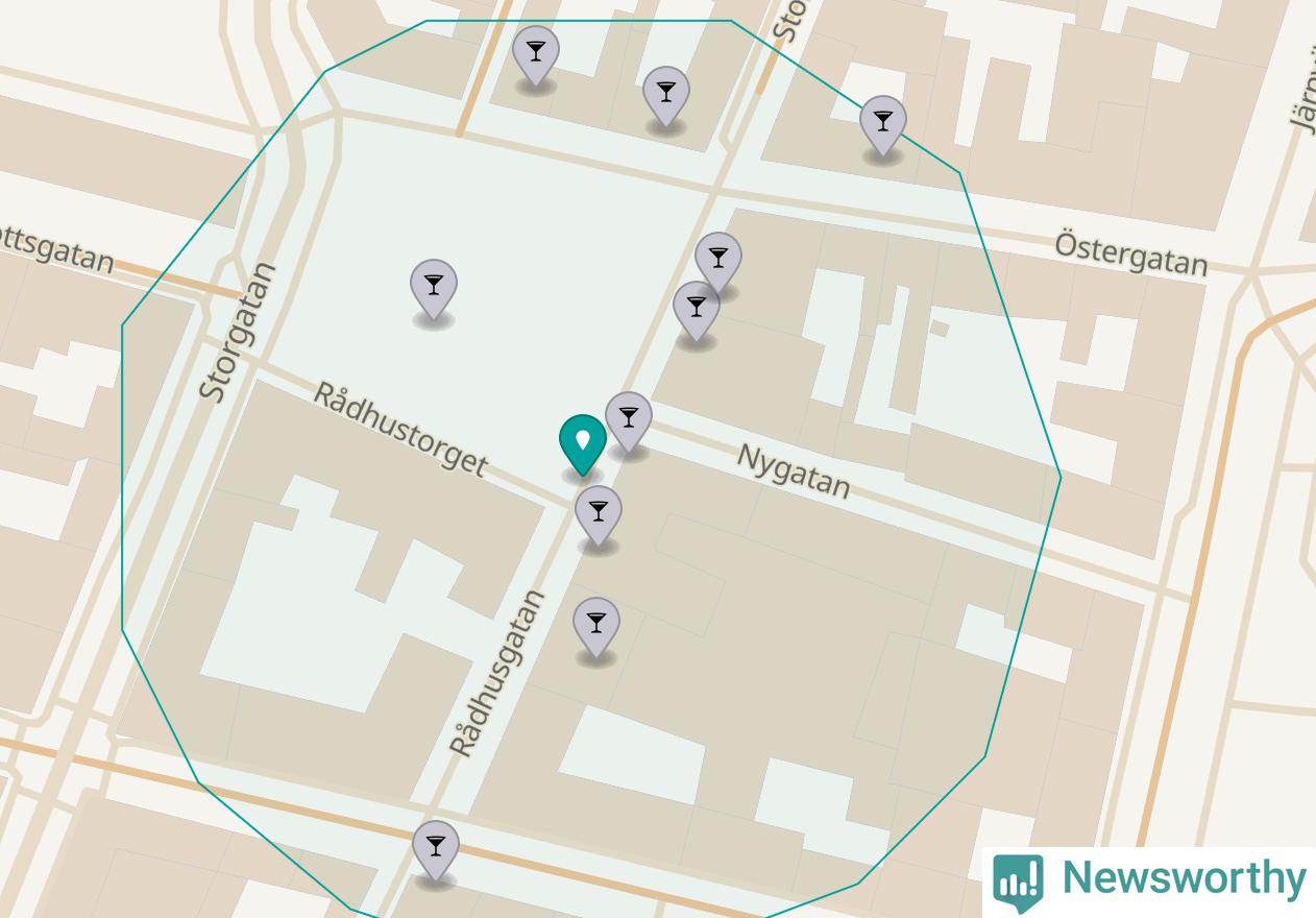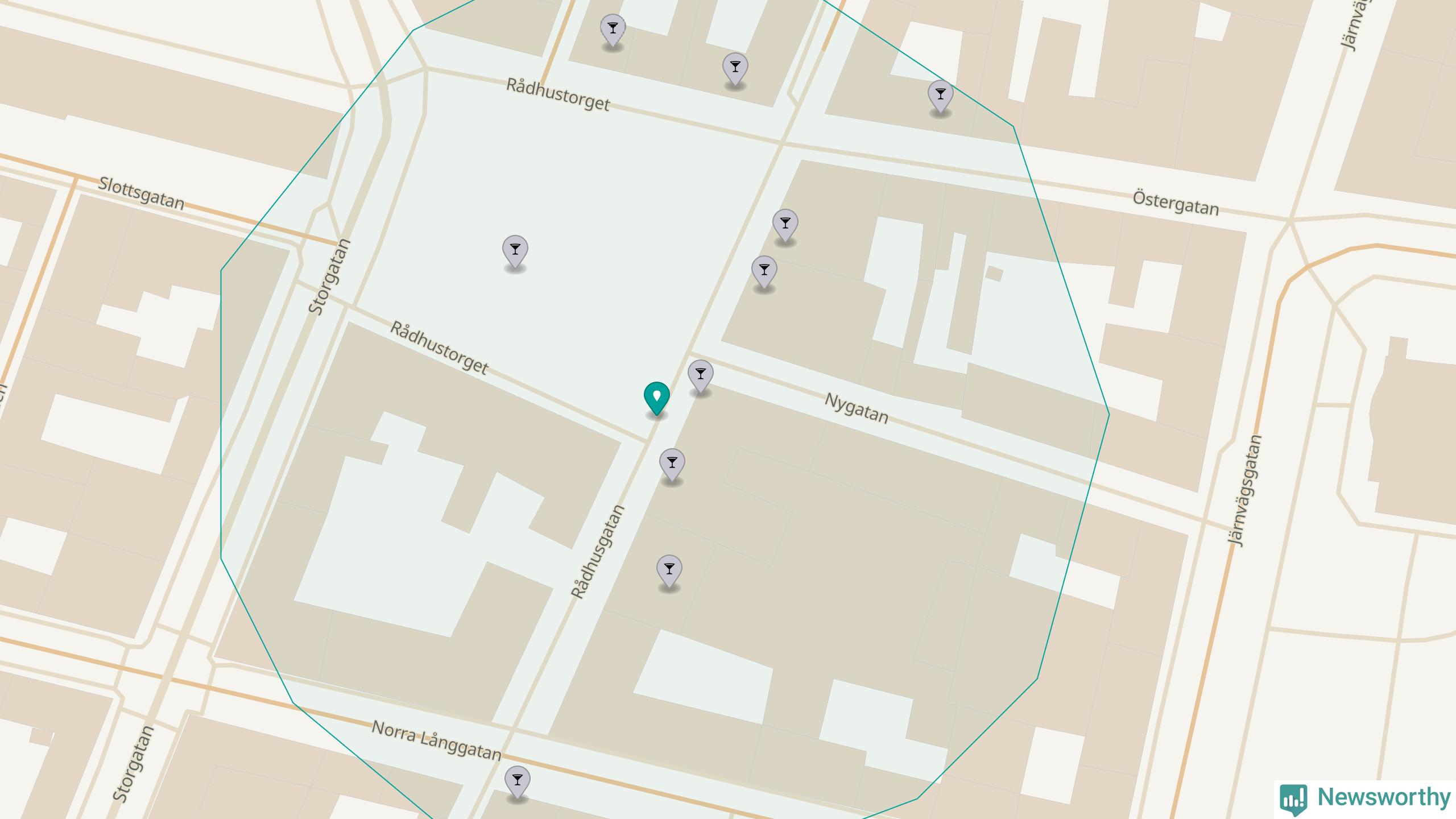 Om du står på Rådhustorget har du tio krogar, restauranger eller hotell med serveringstillstånd inom en radie på 100 meter. Det är den krogtätaste platsen i Landskrona kommun.