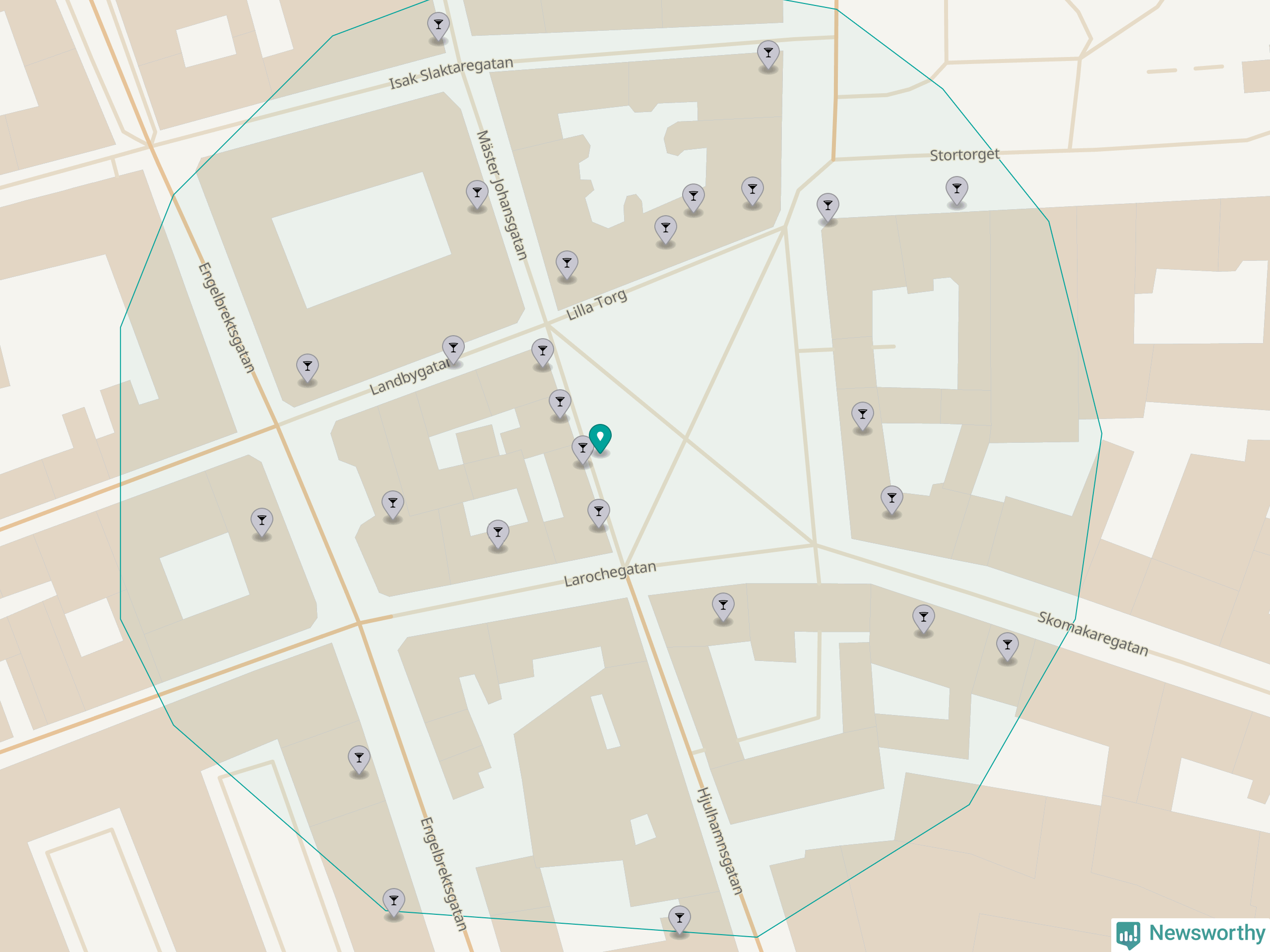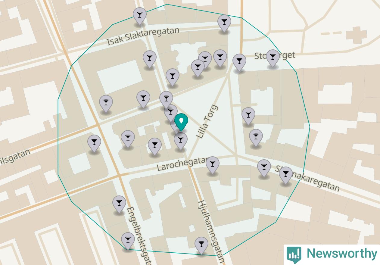 Tätast ligger förstås barerna ofta centralt i större städer. Den plats i Skåne där de ligger tätast ligger i Malmö kommun: om du står på Lilla torg har du 24 krogar, restauranger eller hotell med utskänkningstillstånd inom en radie på 100 meter.