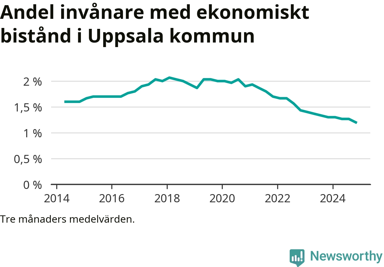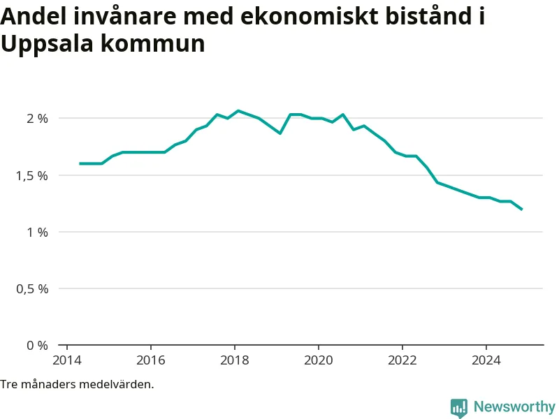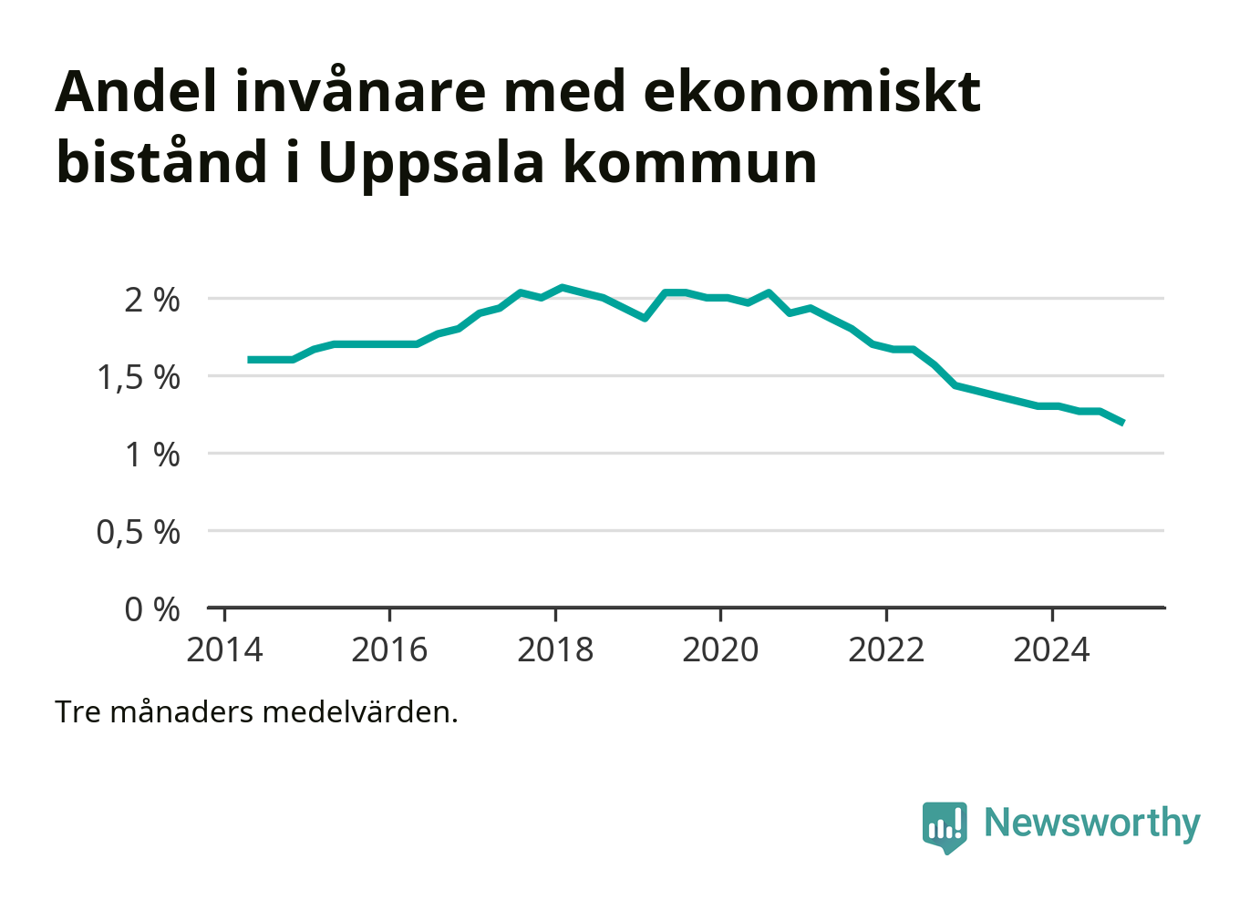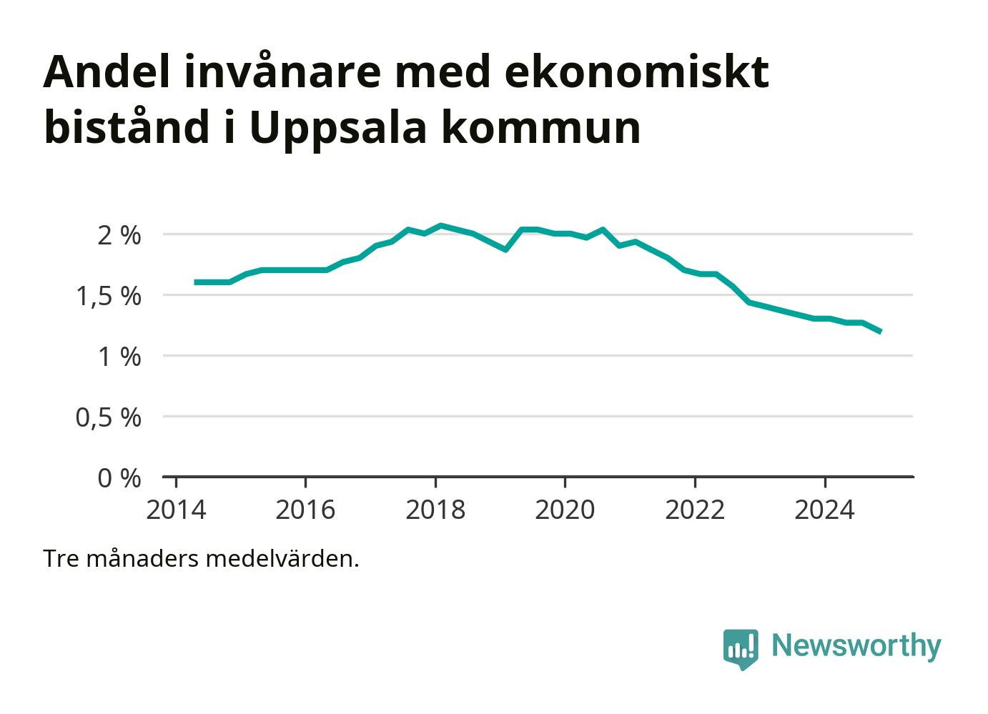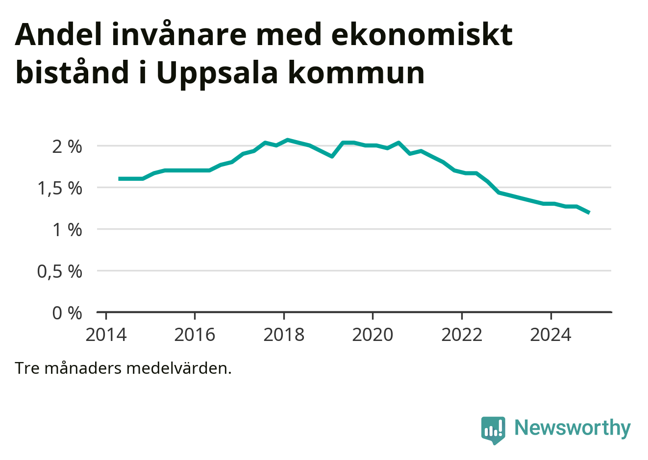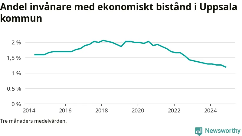 Andelen invånare med ekonomiskt bistånd i Uppsala kommun var under hösten den lägsta sedan åtminstone 2014. Det visar den senaste, preliminära statistiken från Socialstyrelsen.