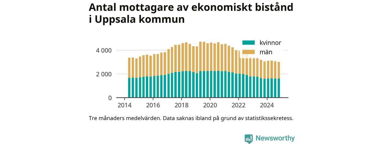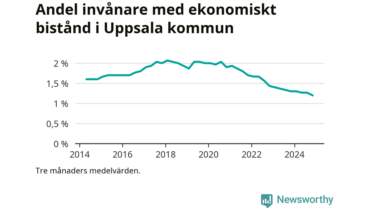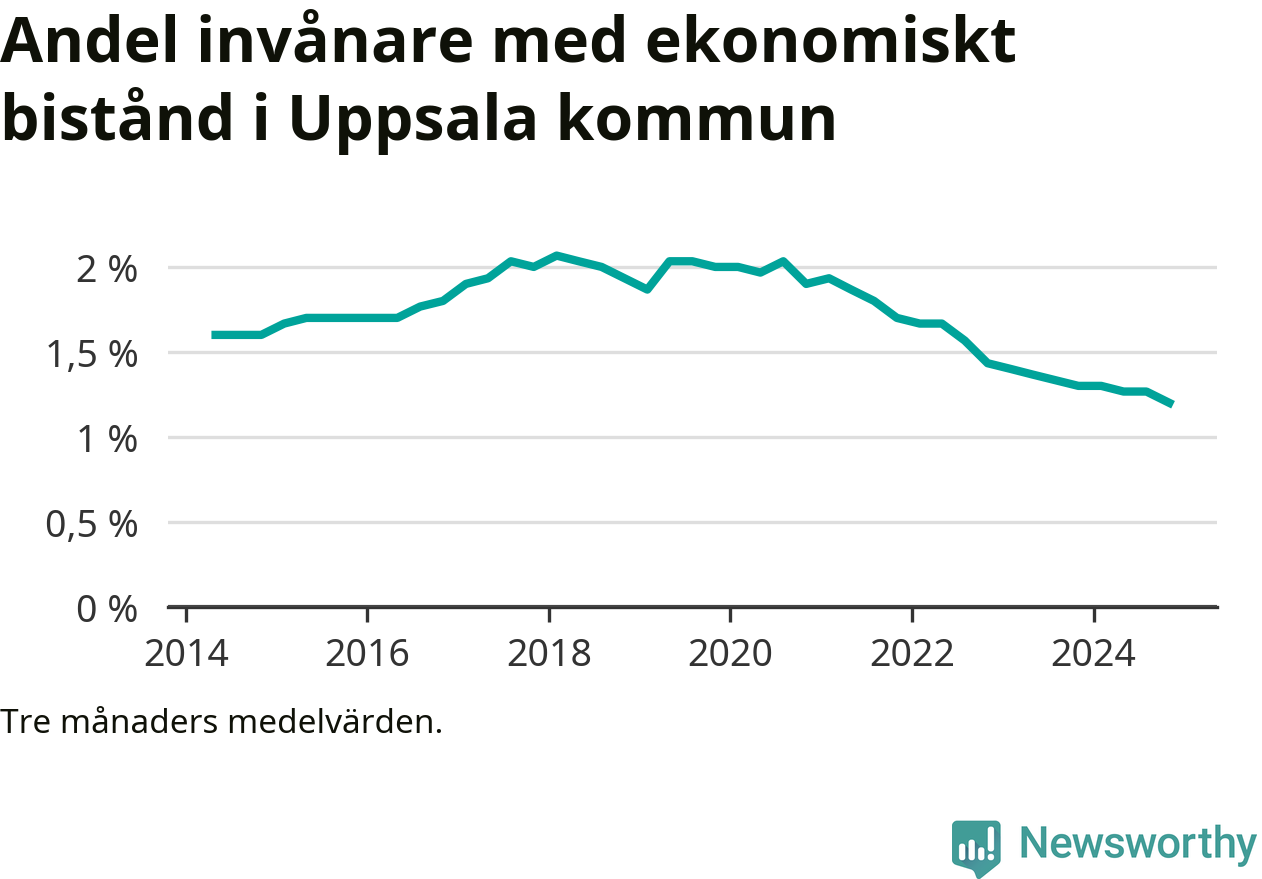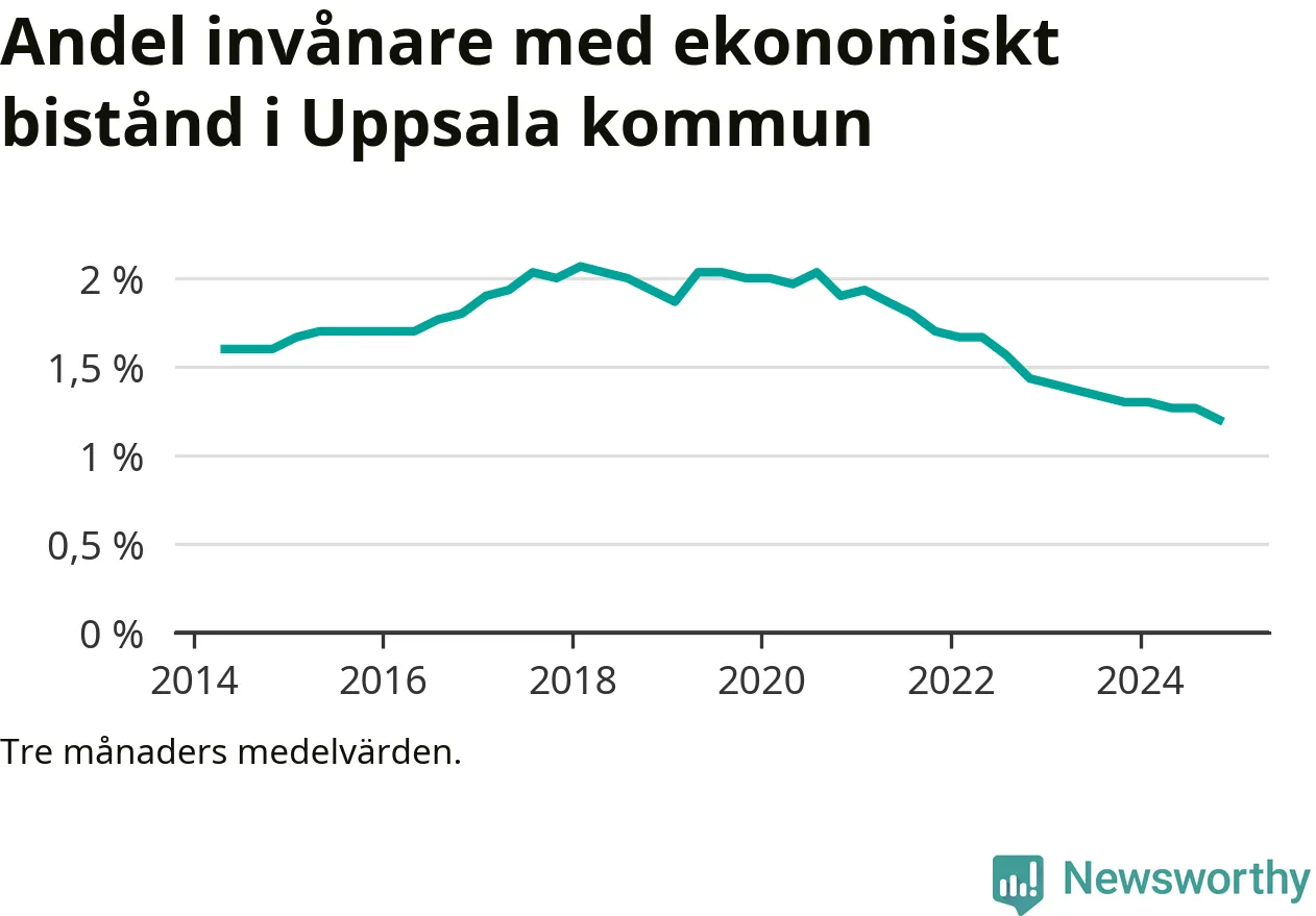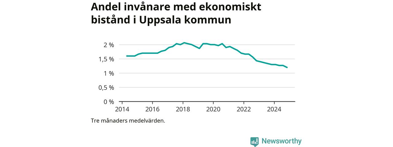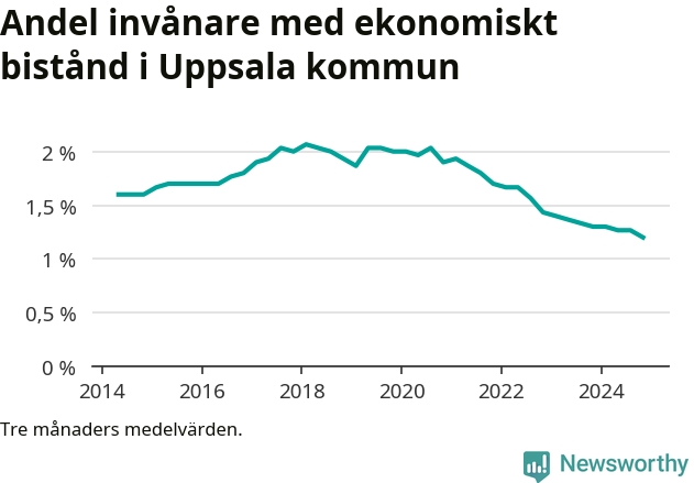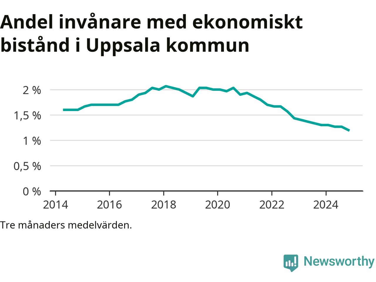 Andelen invånare med ekonomiskt bistånd i Uppsala kommun var under hösten den lägsta sedan åtminstone 2014. Det visar den senaste, preliminära statistiken från Socialstyrelsen.