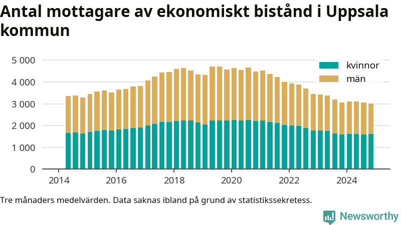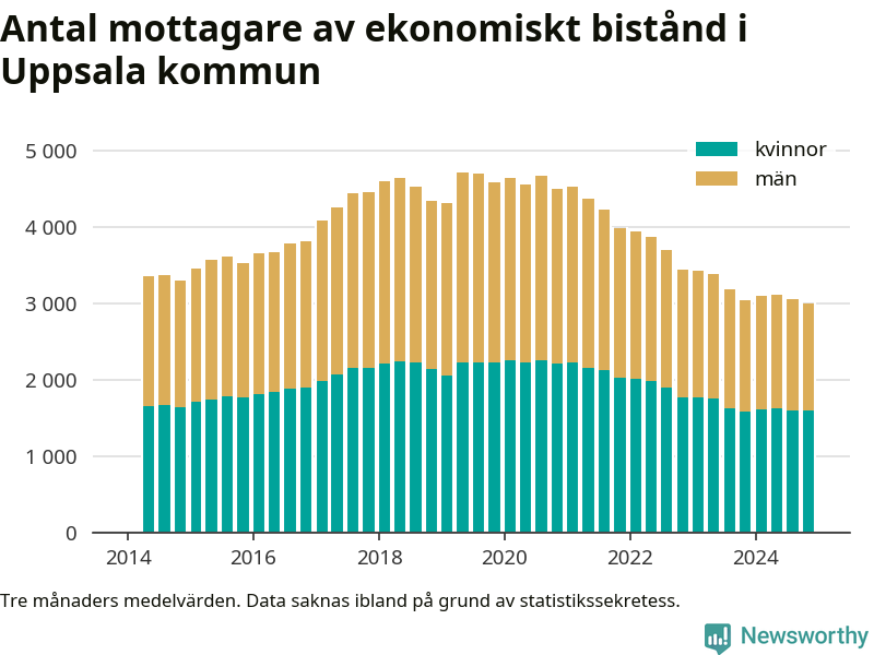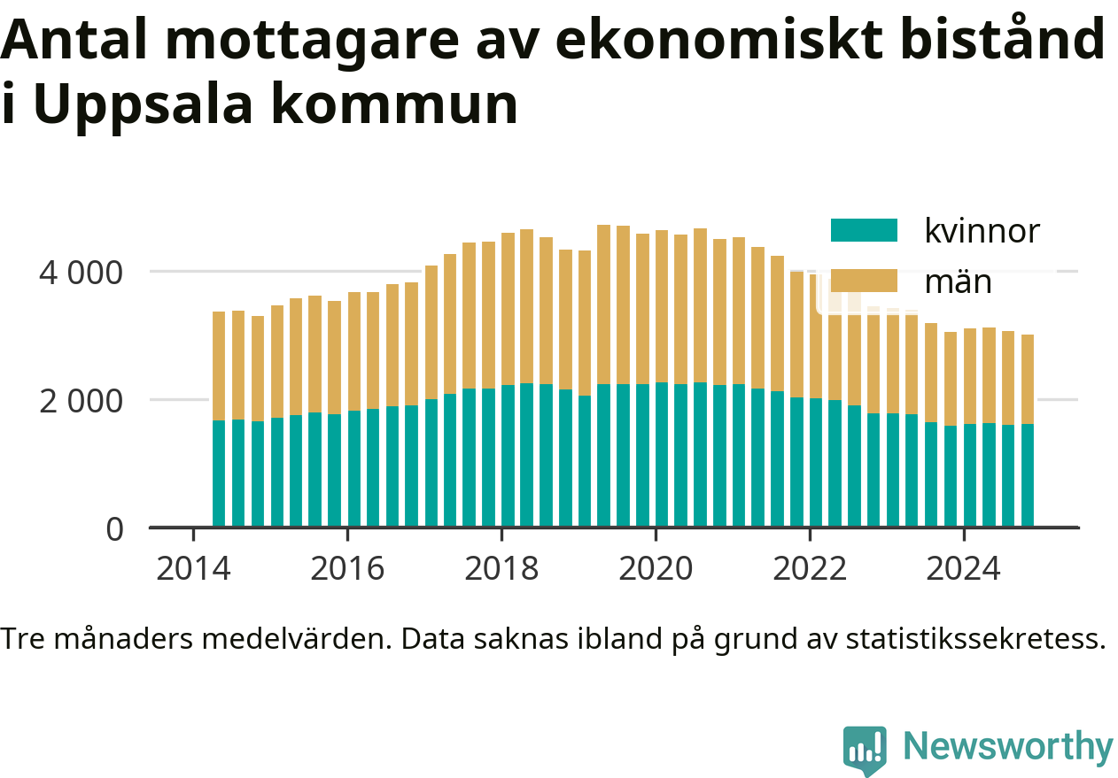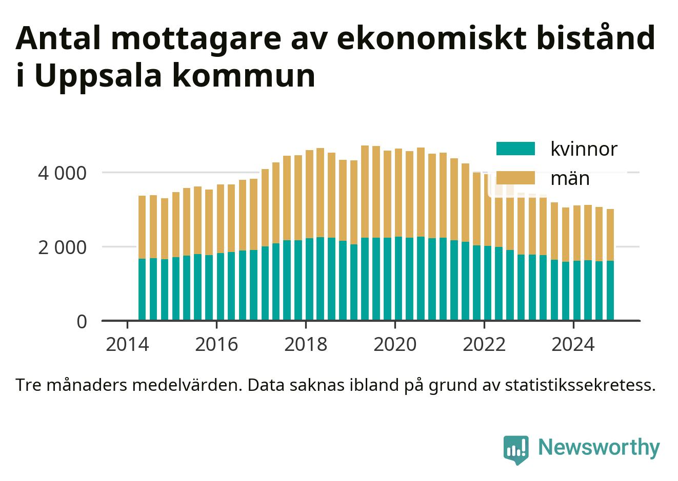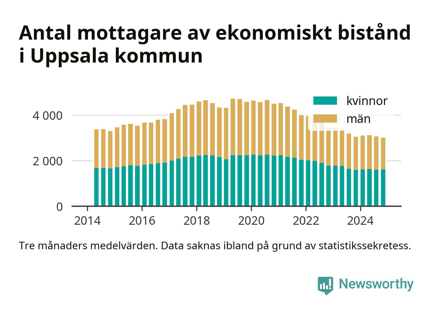 En majoritet av biståndstagarna var kvinnor: I genomsnitt 1 402 män och 1 603 kvinnor fick ekonomiskt bistånd varje månad under hösten.