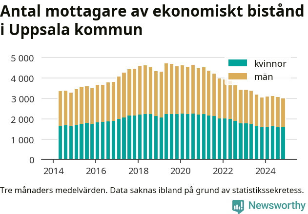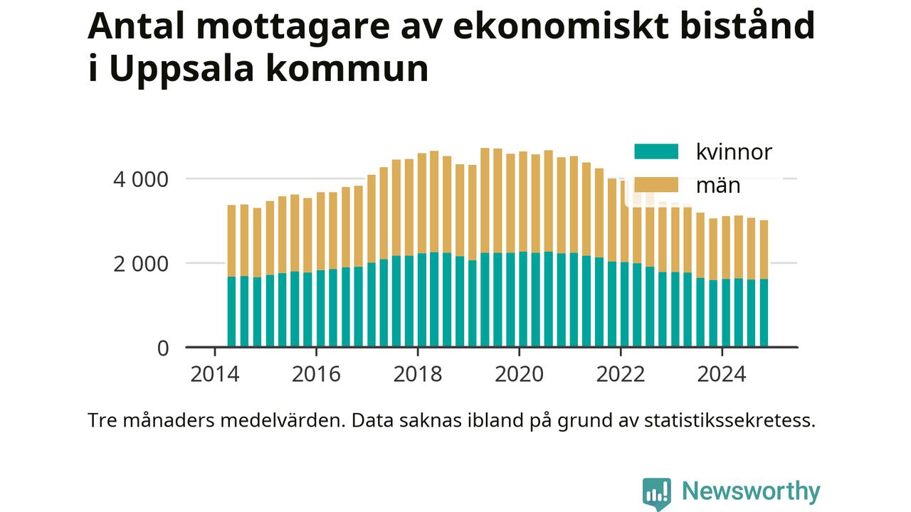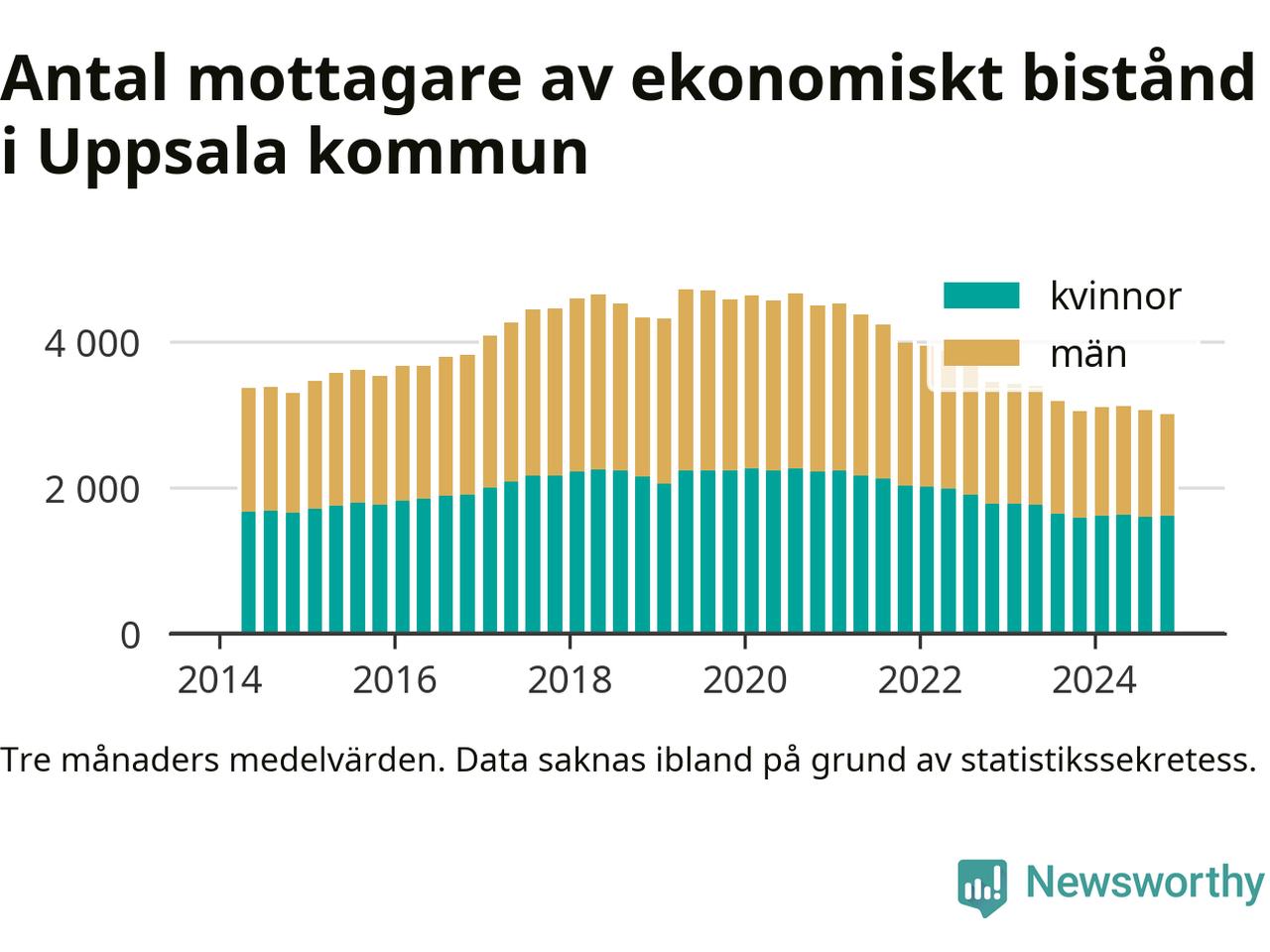 I genomsnitt 3 005 personer per månad fick ekonomiskt bistånd i Uppsala kommun under höstmånaderna (september till november), vilket motsvarar 1,2 procent av den vuxna befolkningen. Det är marginellt mindre än i somras, och något mindre andel än under hösten för ett år sedan.