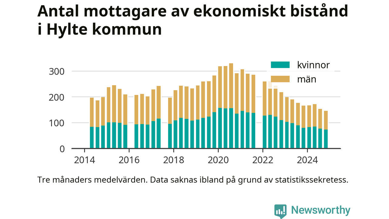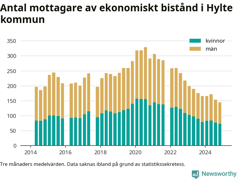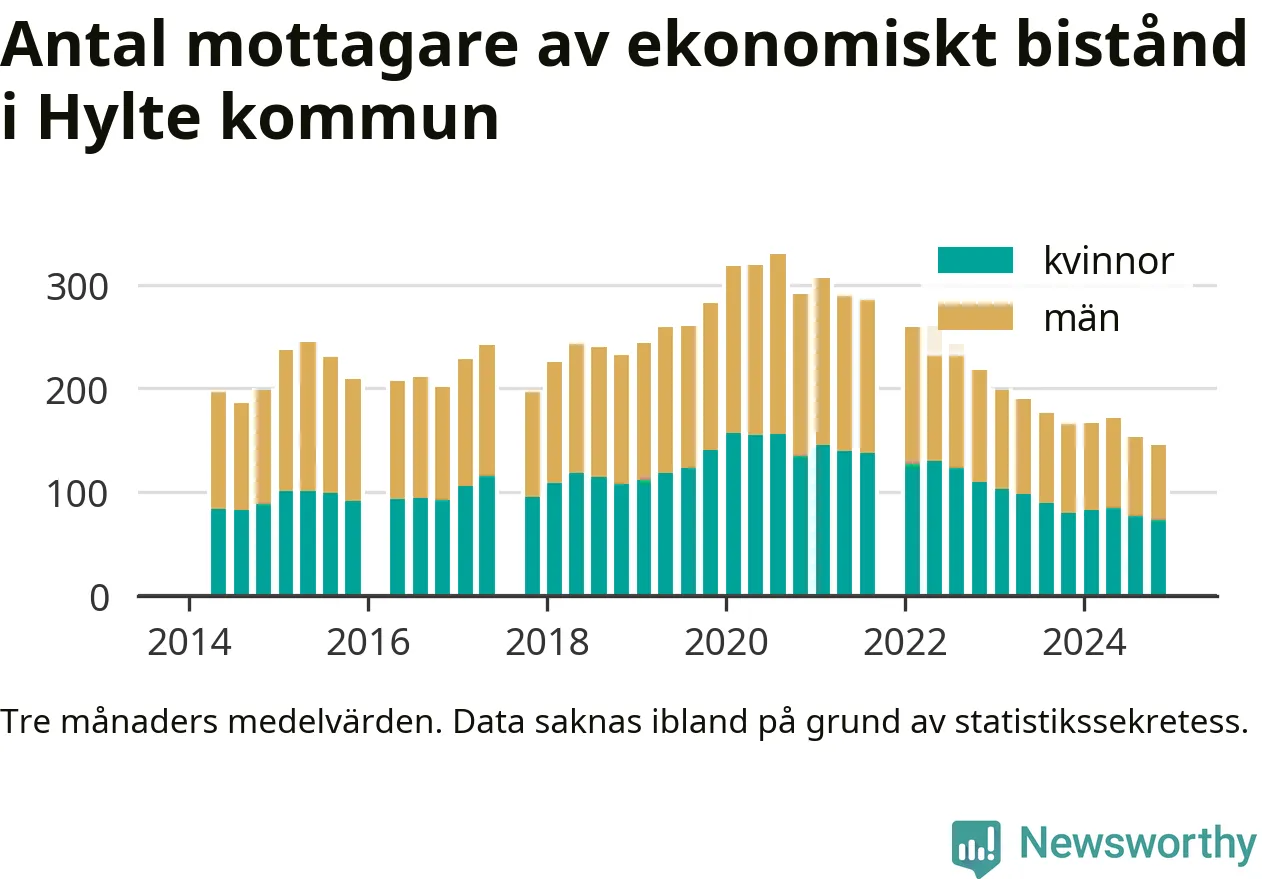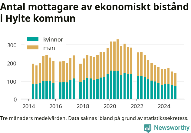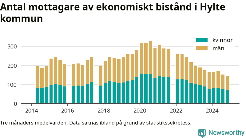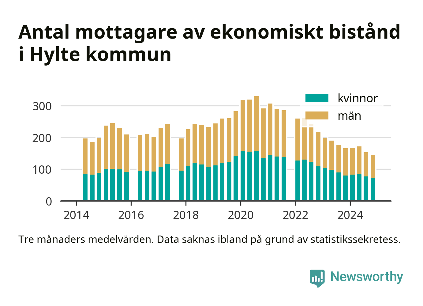I genomsnitt 145 personer per månad fick ekonomiskt bistånd i Hylte kommun under höstmånaderna (september till november), vilket motsvarar 1,4 procent av den vuxna befolkningen. Det är marginellt mindre än i somras, och något mindre andel än under hösten för ett år sedan.