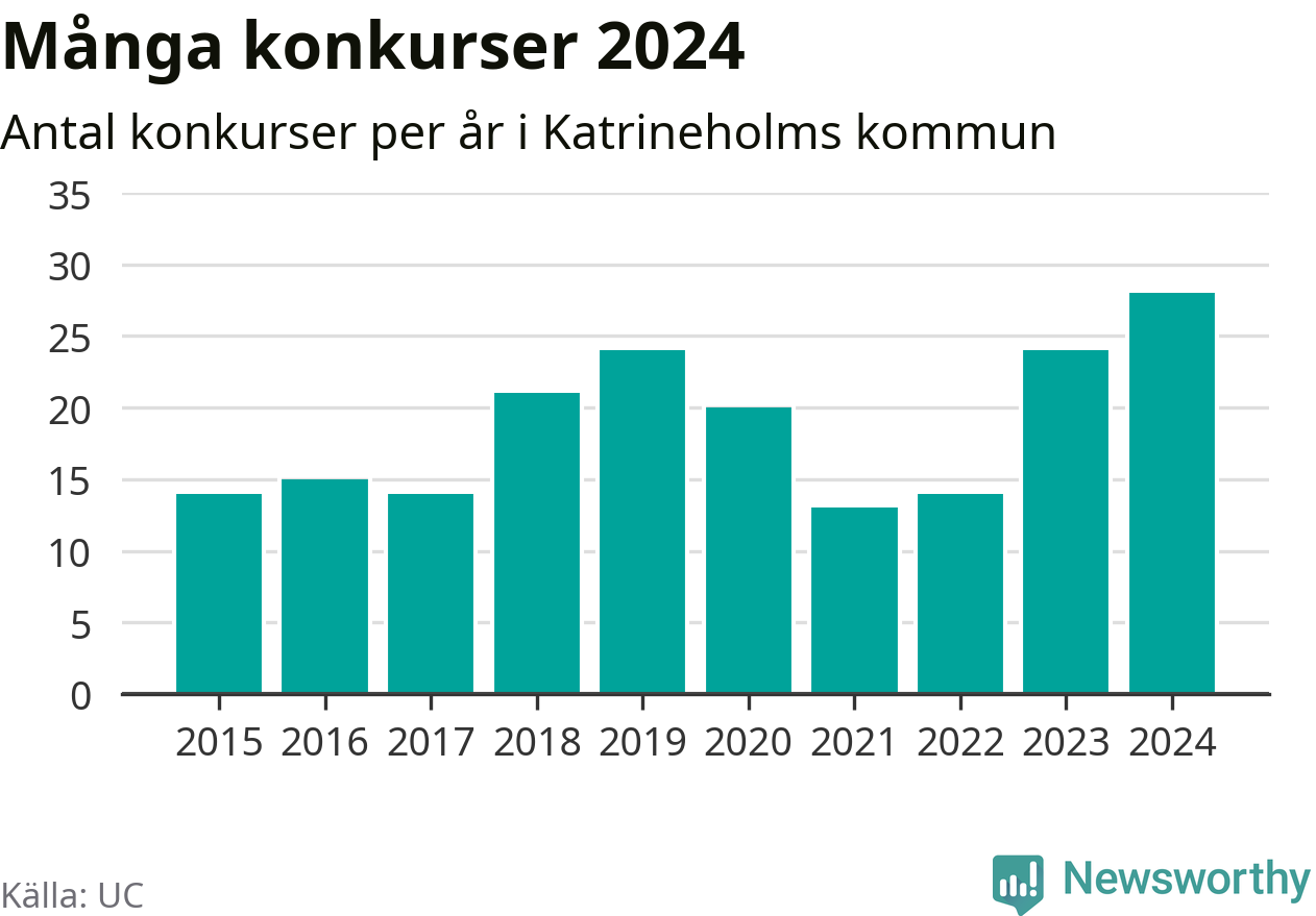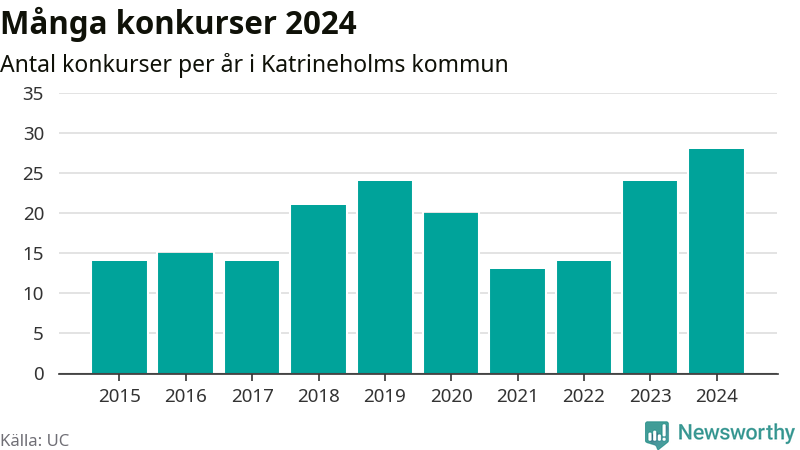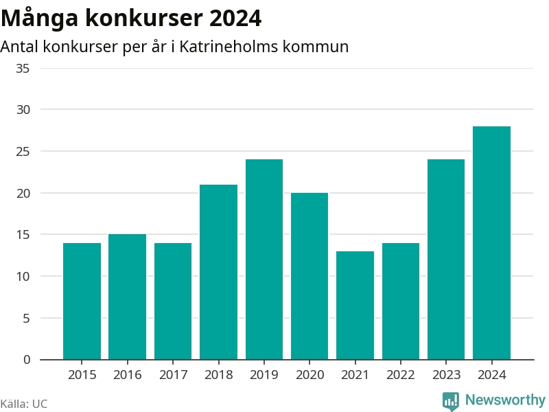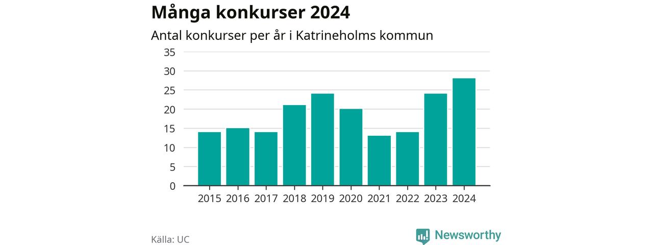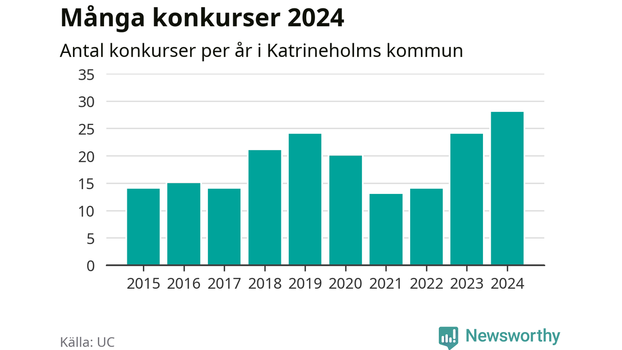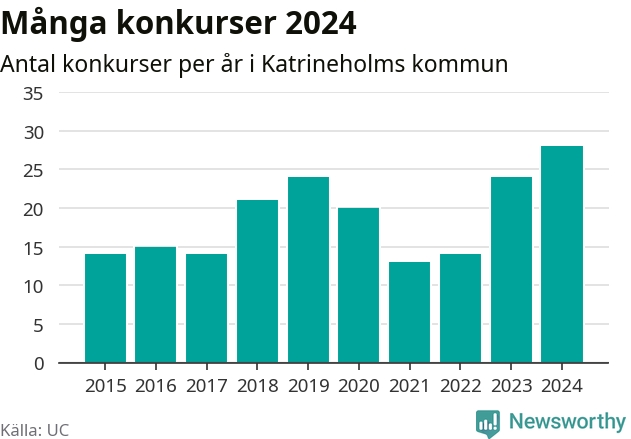 Under år 2024 gick sammanlagt 28 bolag med säte i Katrineholms kommun i konkurs. Det är det högsta antalet sedan åtminstone år 2015. Det visar ny statistik från UC.