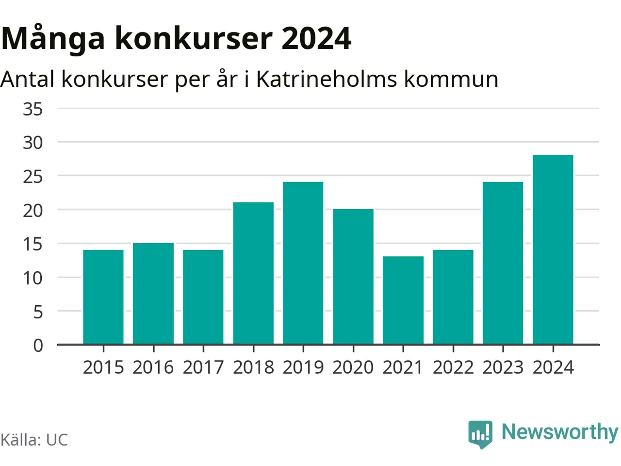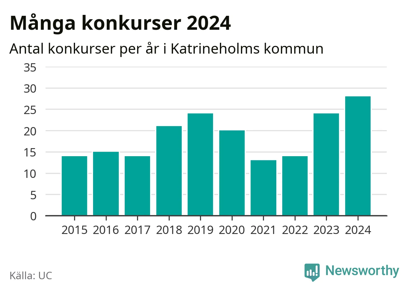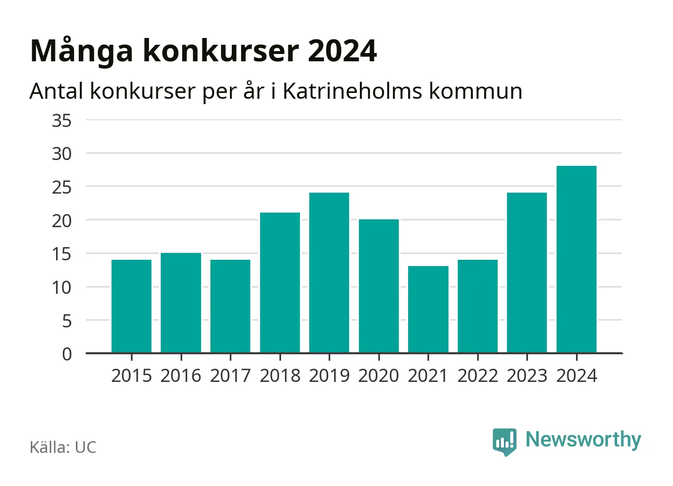 Under år 2024 gick sammanlagt 28 bolag med säte i Katrineholms kommun i konkurs. Det är det högsta antalet sedan åtminstone år 2015. Det visar ny statistik från UC.
