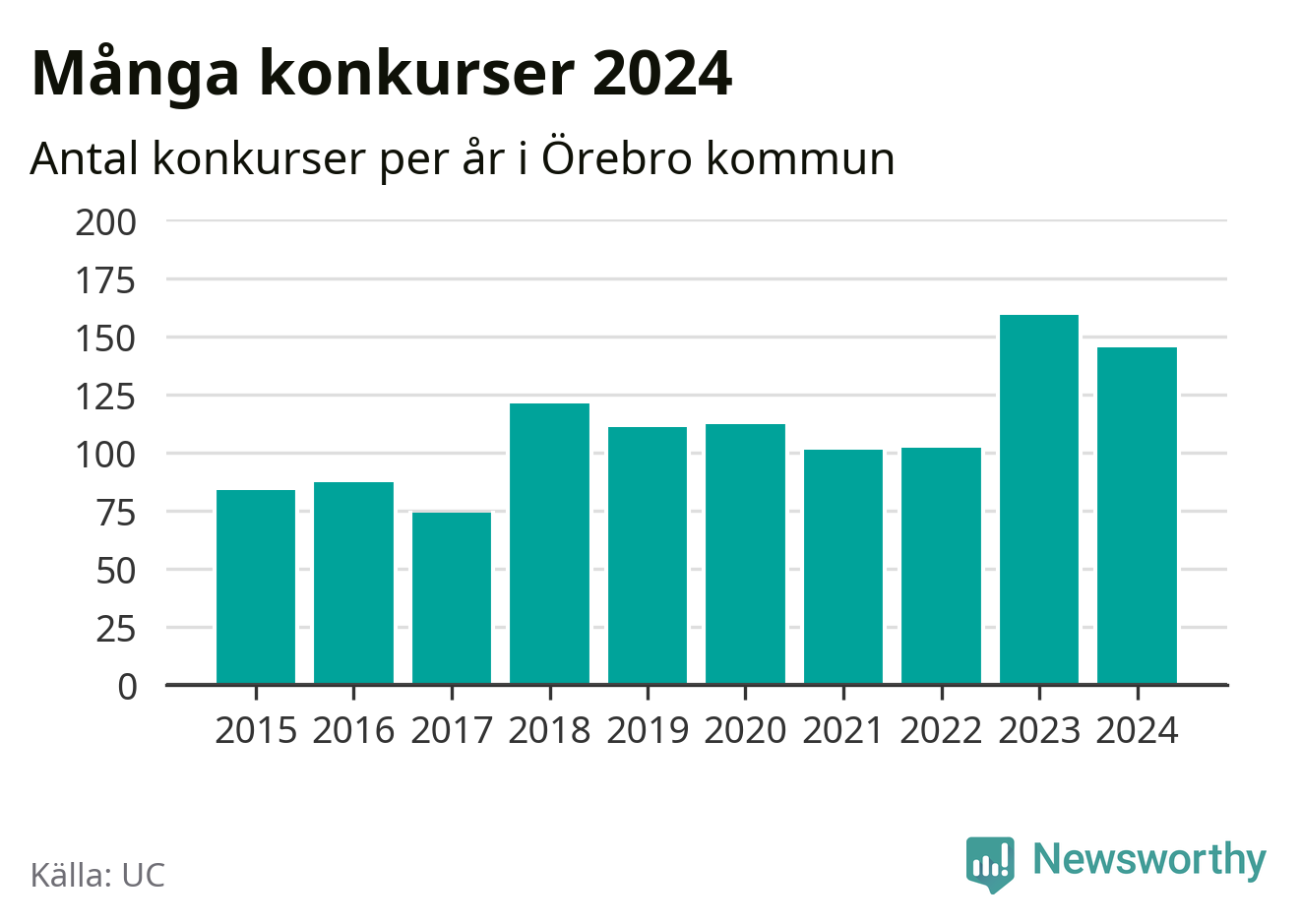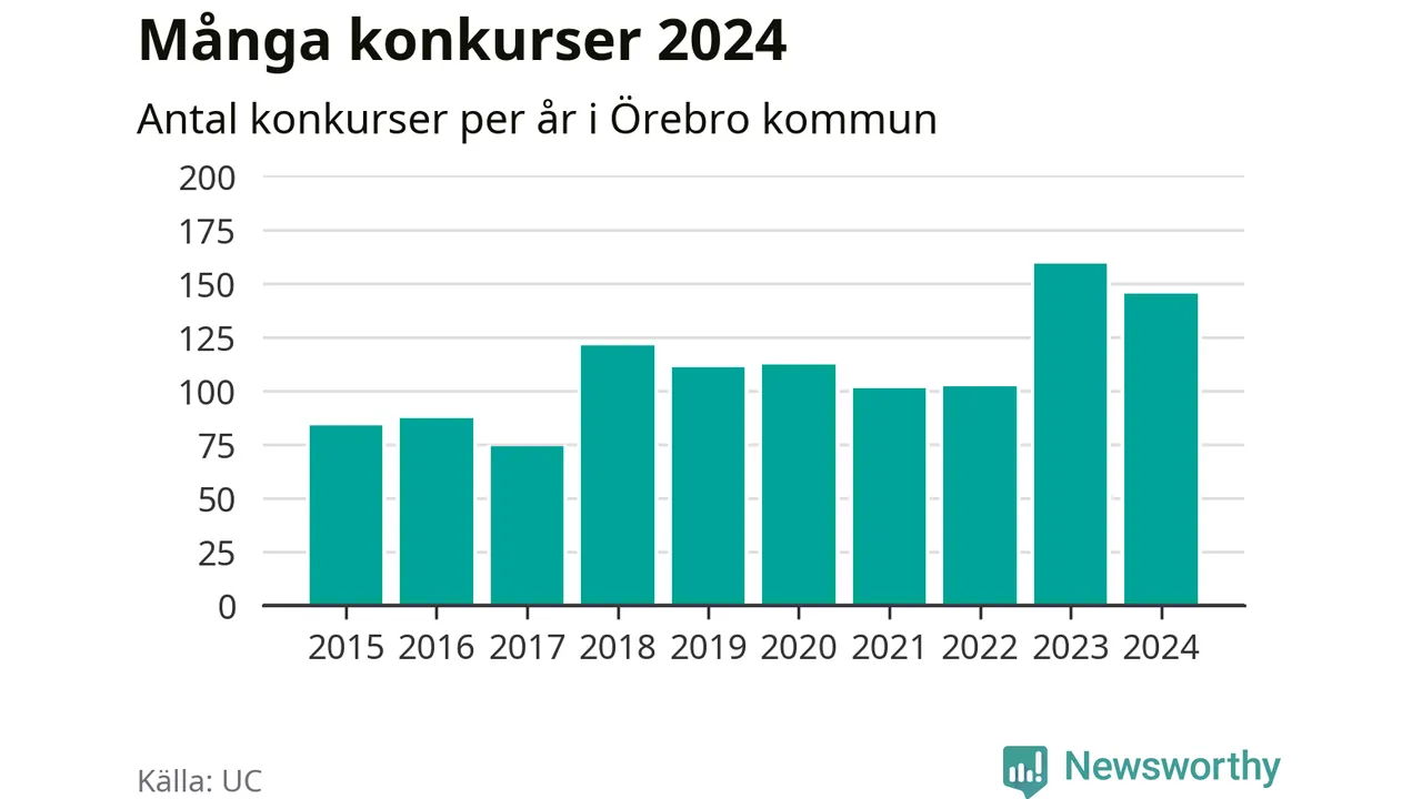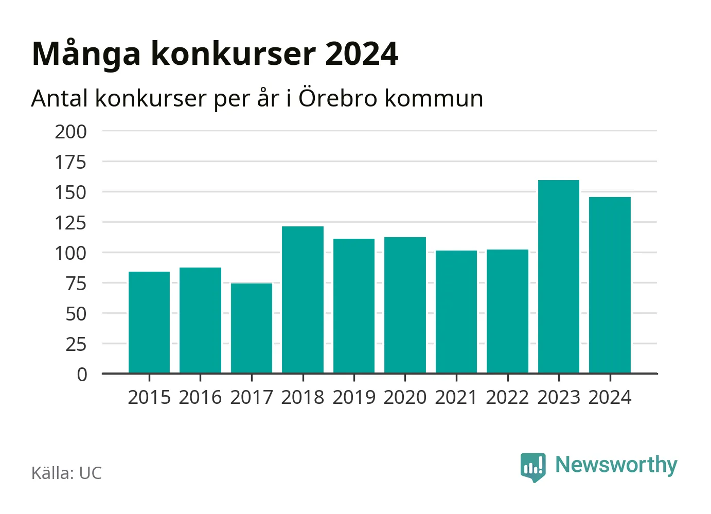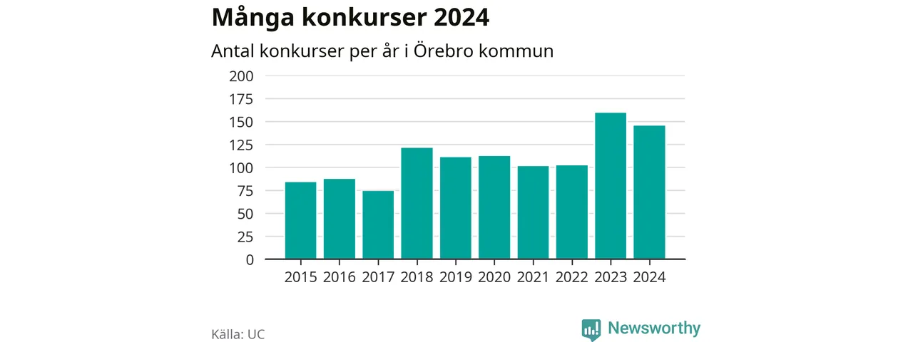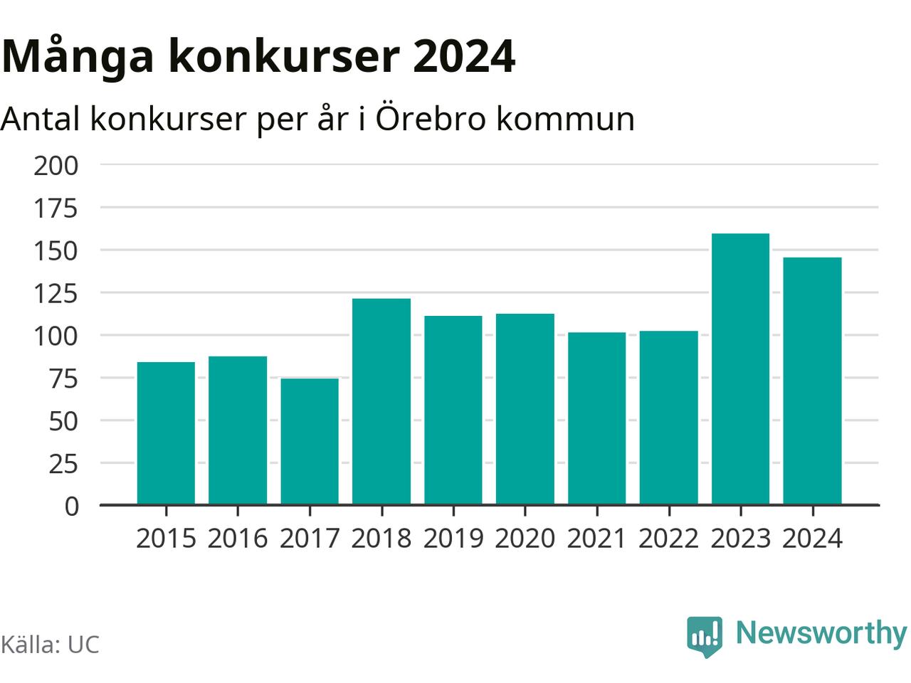 Under år 2024 gick sammanlagt 145 bolag med säte i Örebro kommun i konkurs. Det är 14 färre än året innan då 159 bolag gick i konkurs. Toppåret, sedan 2015, var just 2023 sett till antalet konkursföretag. Det visar ny statistik från UC.