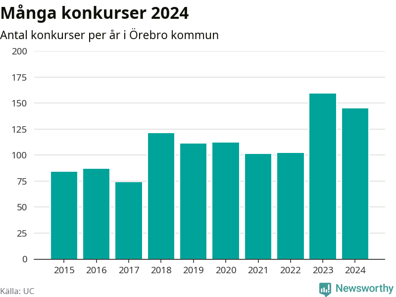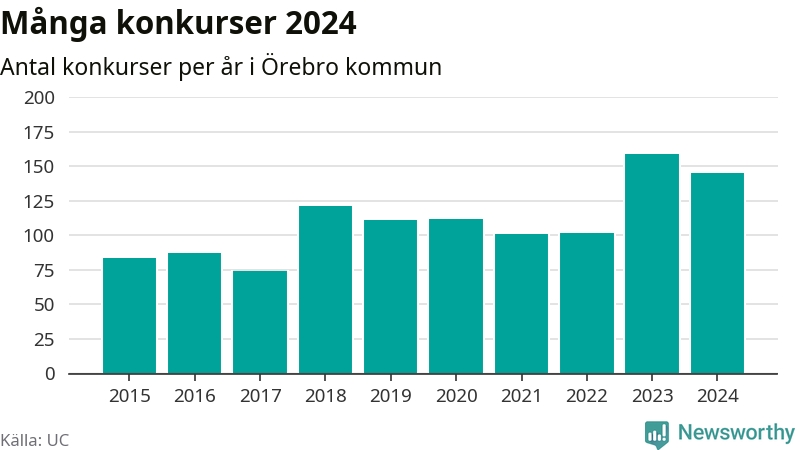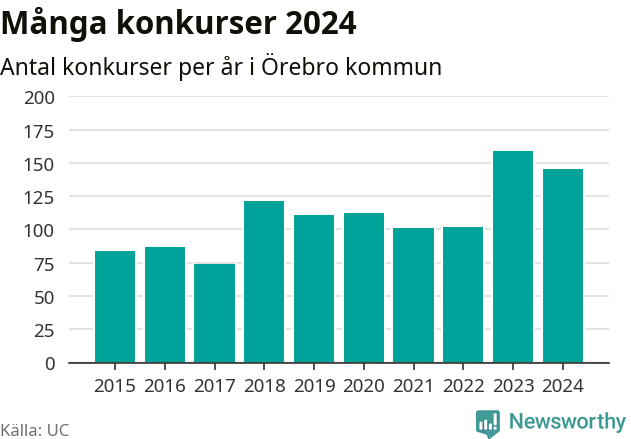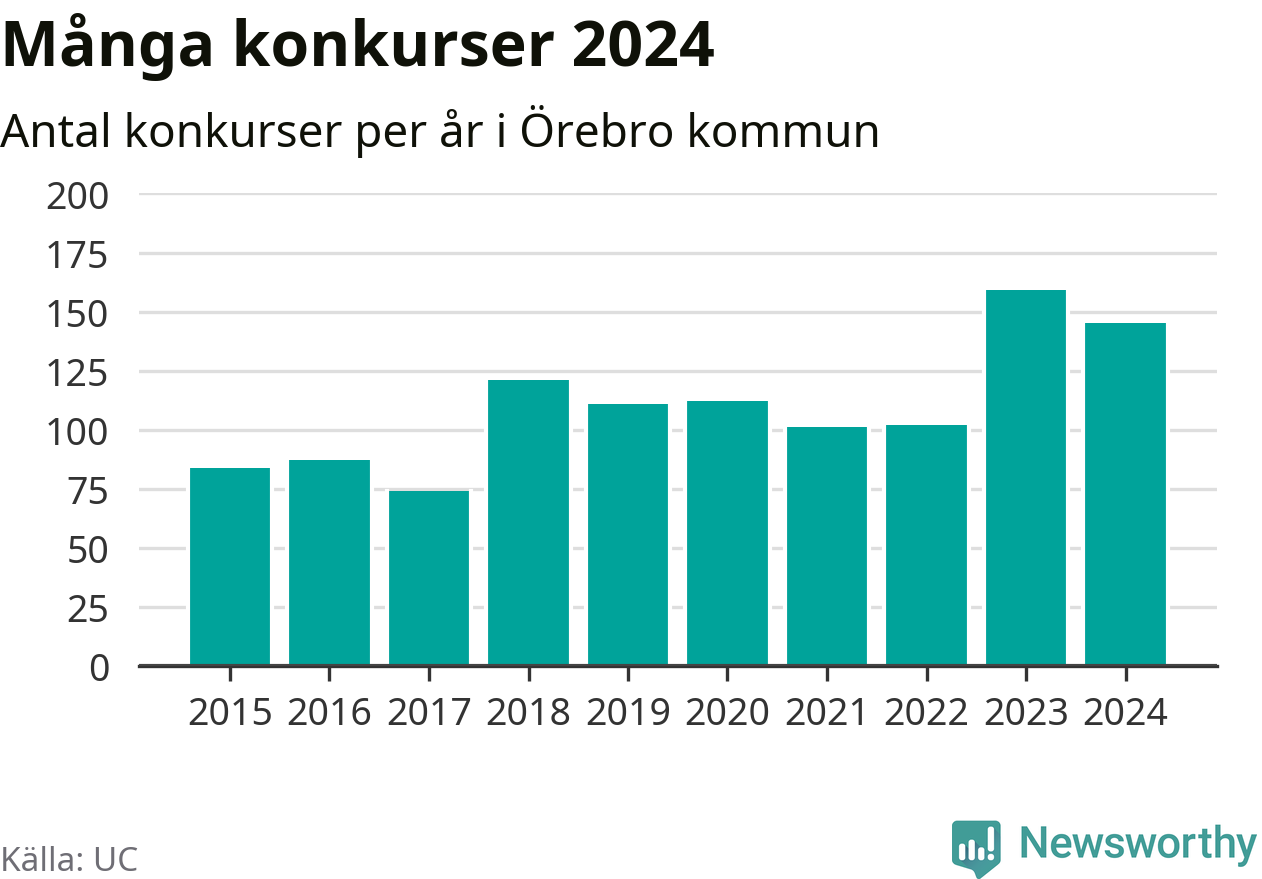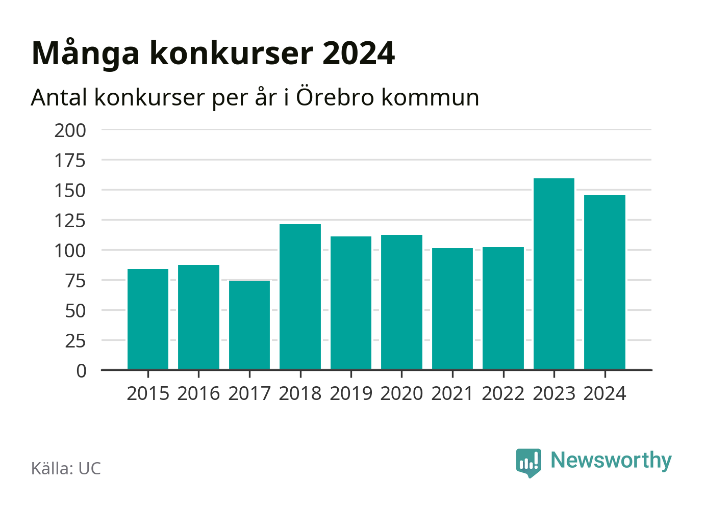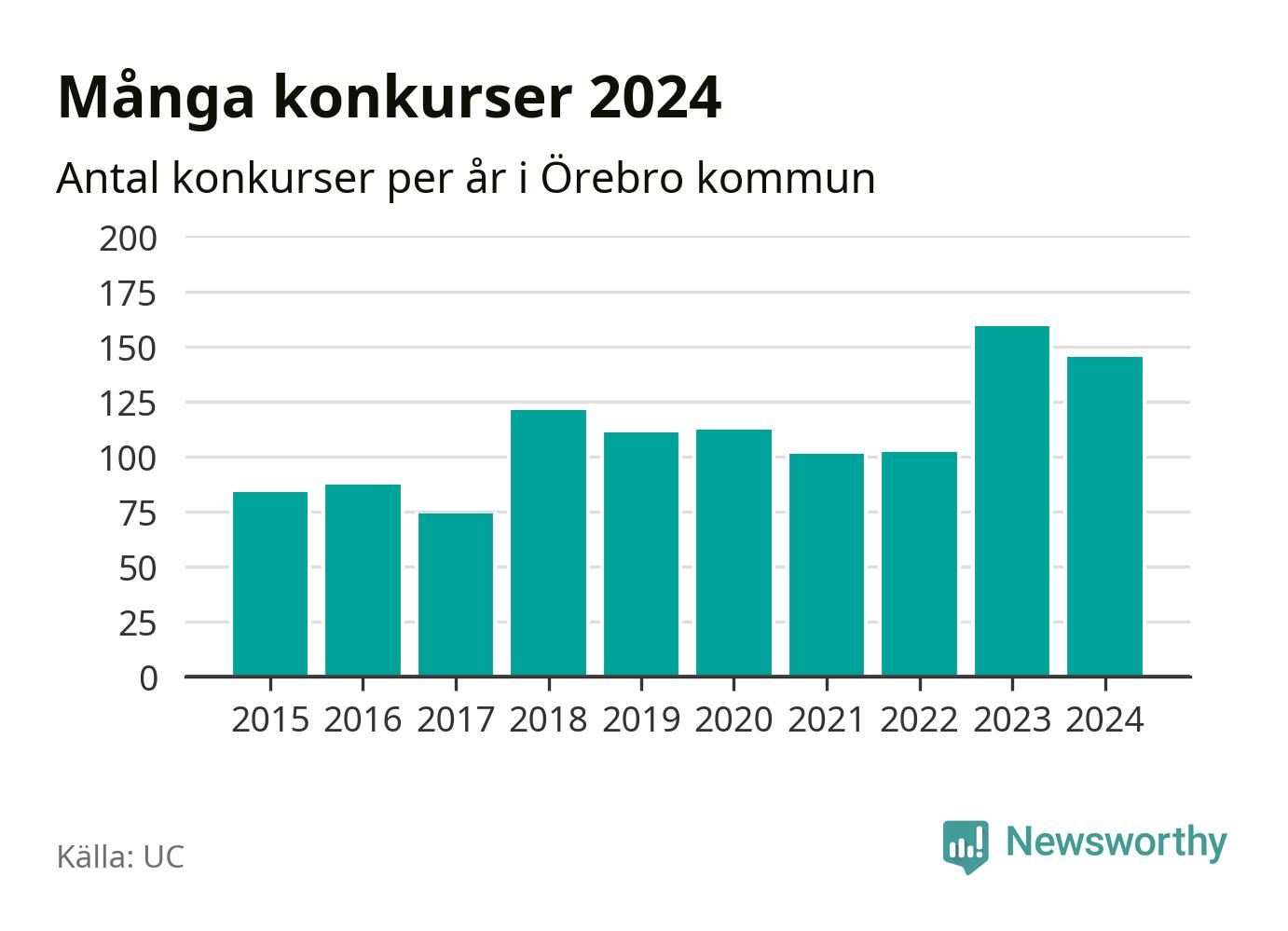 Under år 2024 gick sammanlagt 145 bolag med säte i Örebro kommun i konkurs. Det är 14 färre än året innan då 159 bolag gick i konkurs. Toppåret, sedan 2015, var just 2023 sett till antalet konkursföretag. Det visar ny statistik från UC.