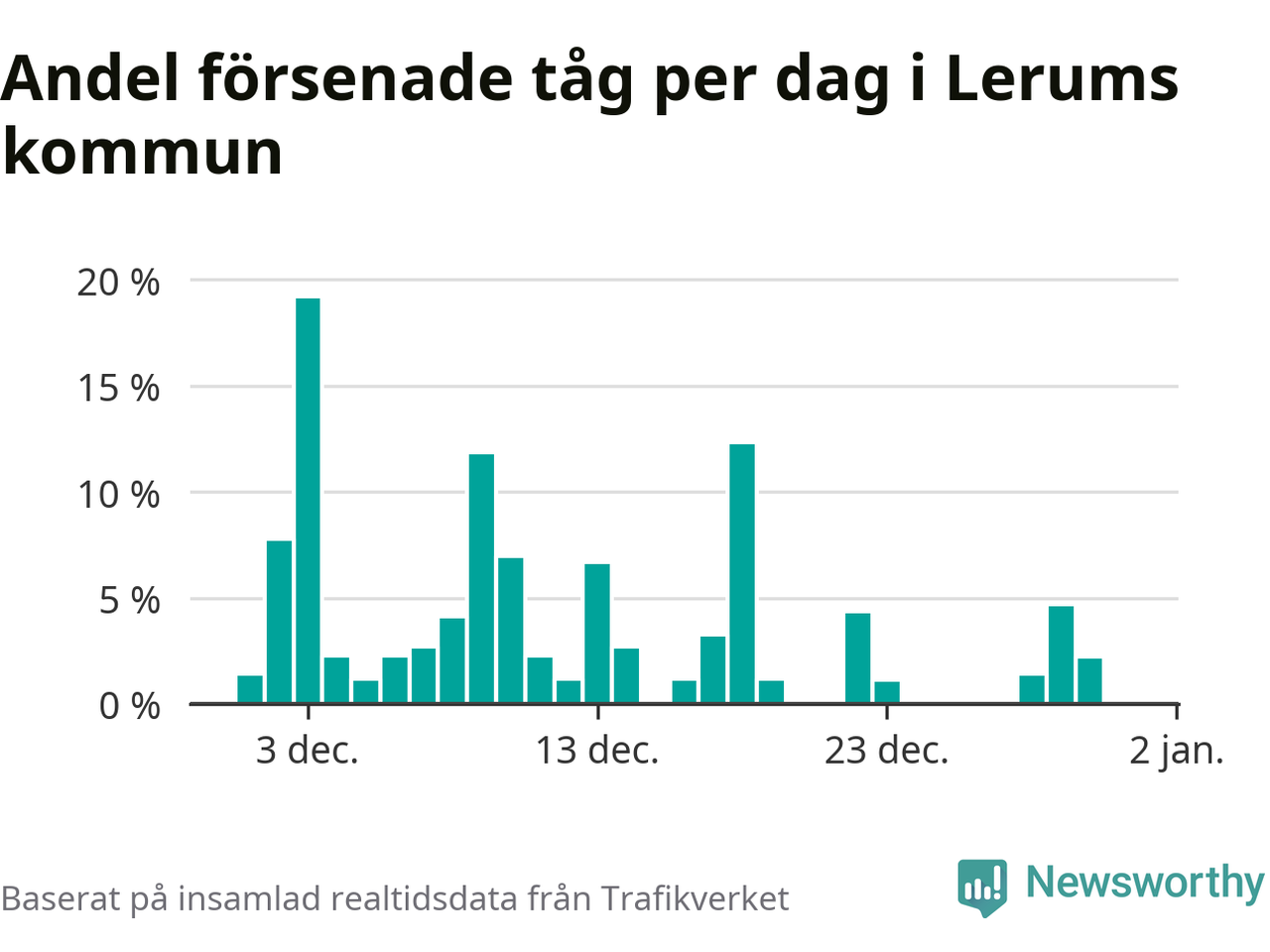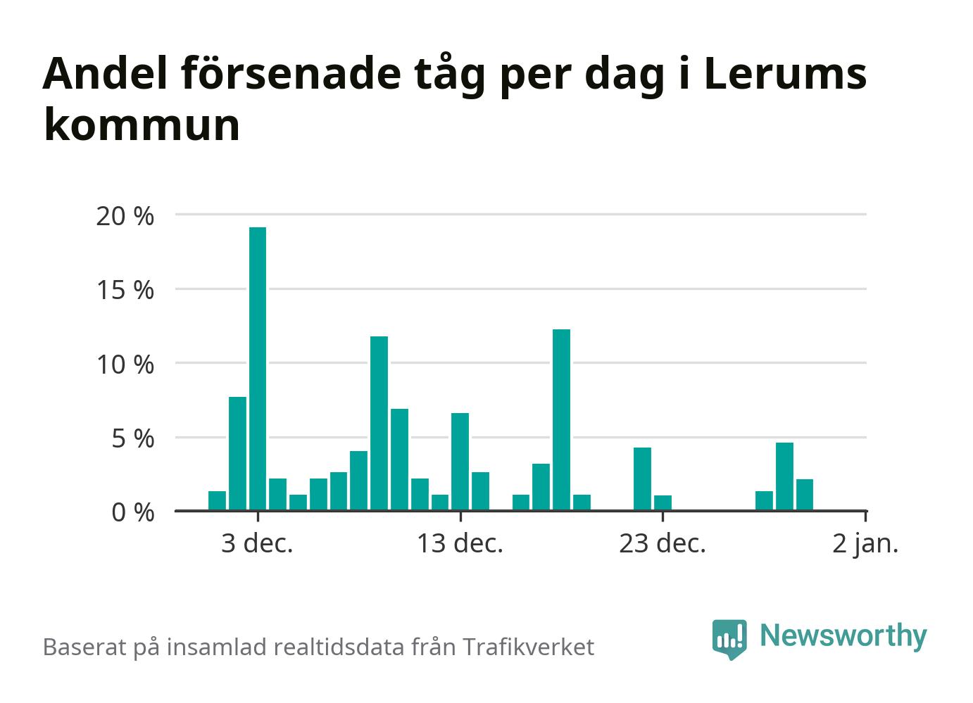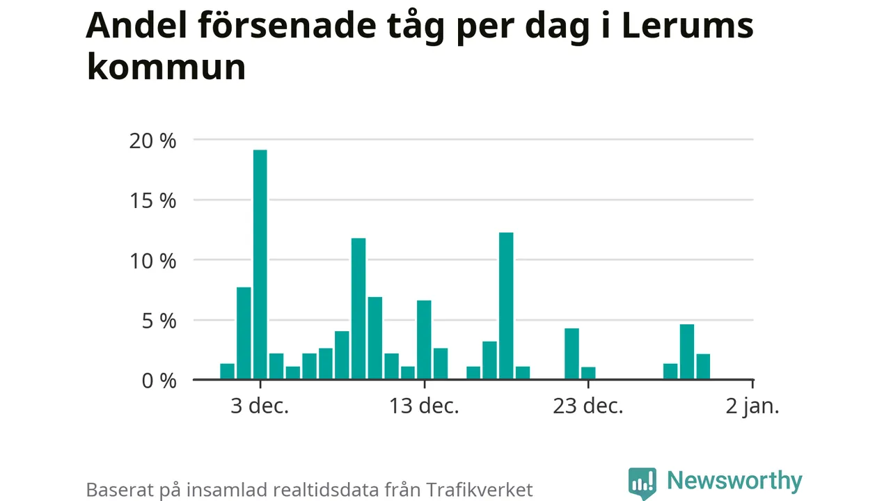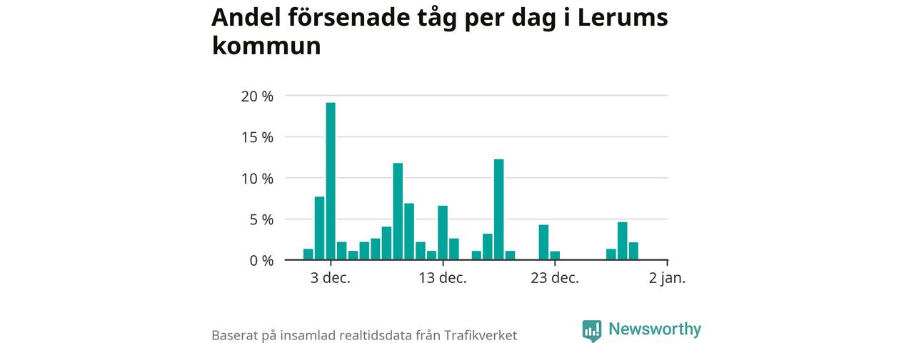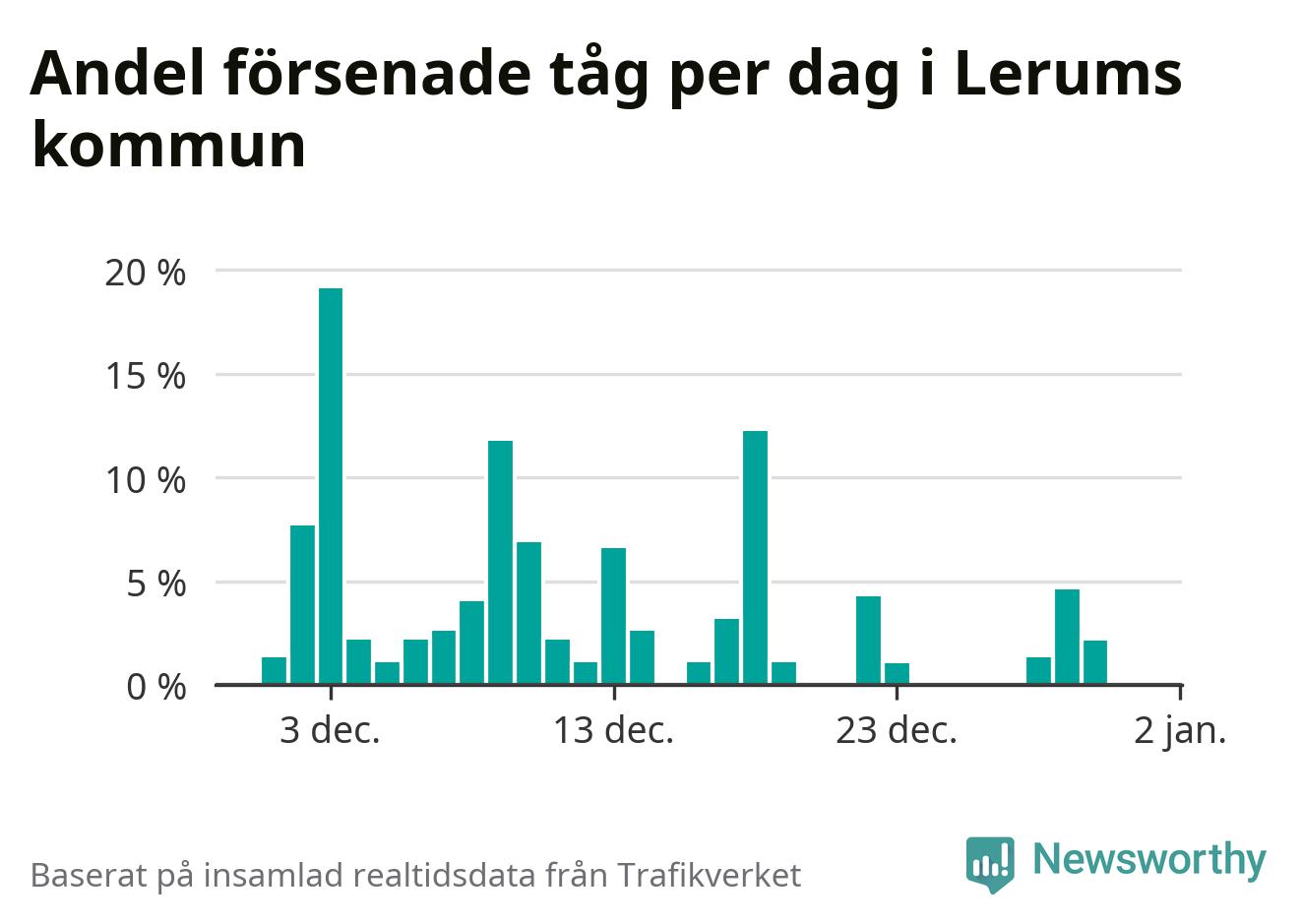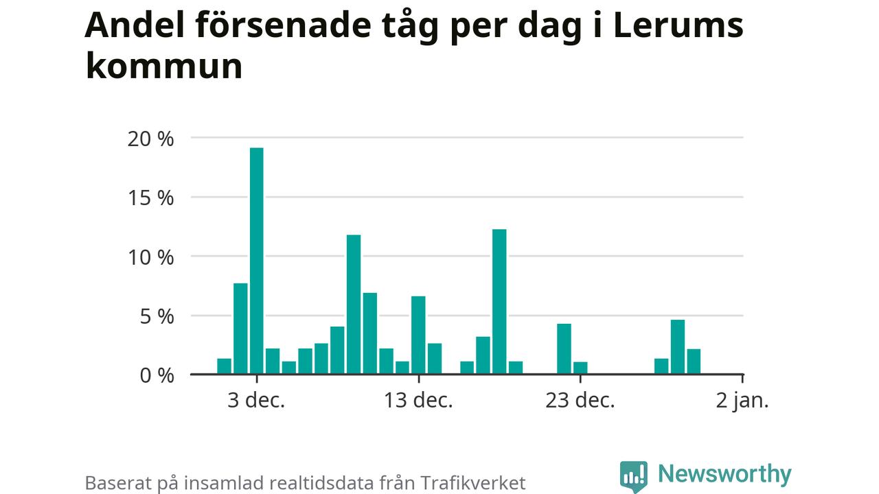 Den svenska tågtrafiken är långt från det branchgemensamma målet att 95 procent av tågen ska komma fram i tid. Newsworthy har samlat in tågens ankomsttider under december, för att se hur stor andel av tågen till Lerums kommun som var i tid under den senaste månaden.