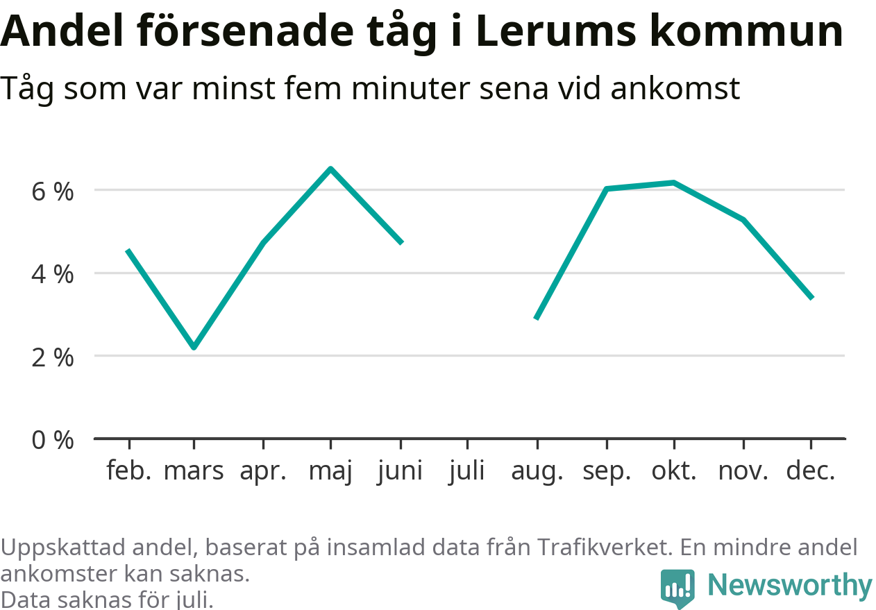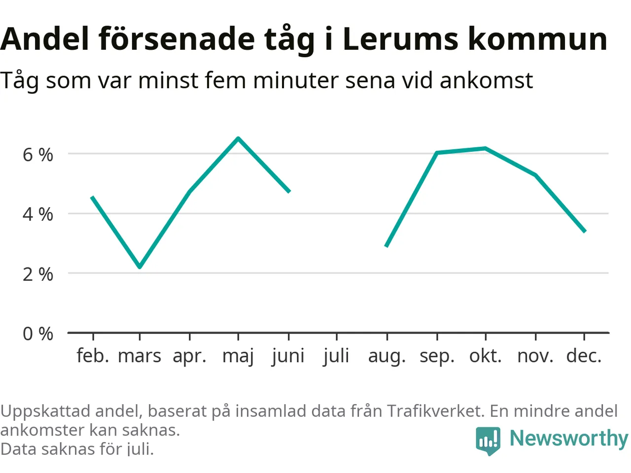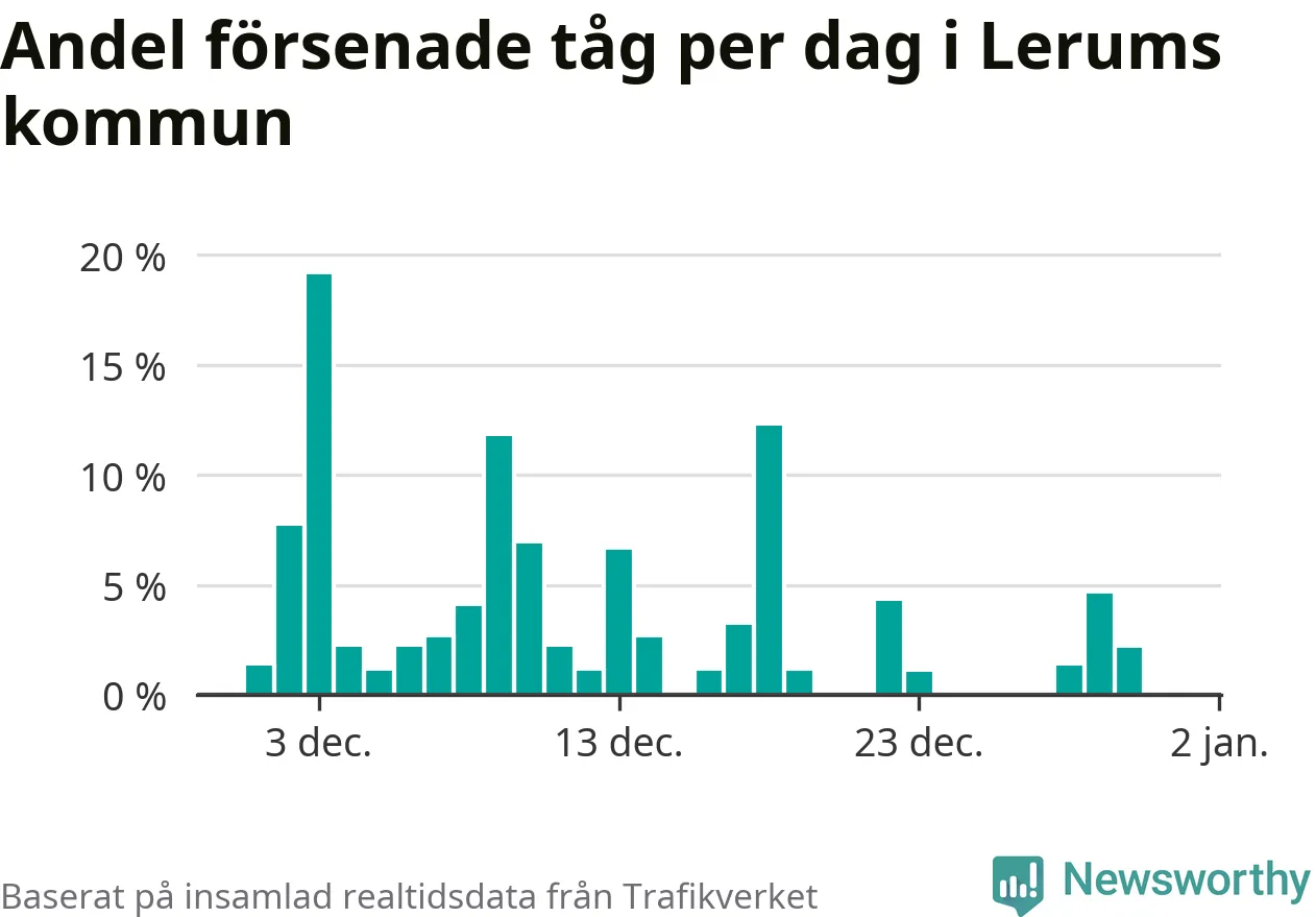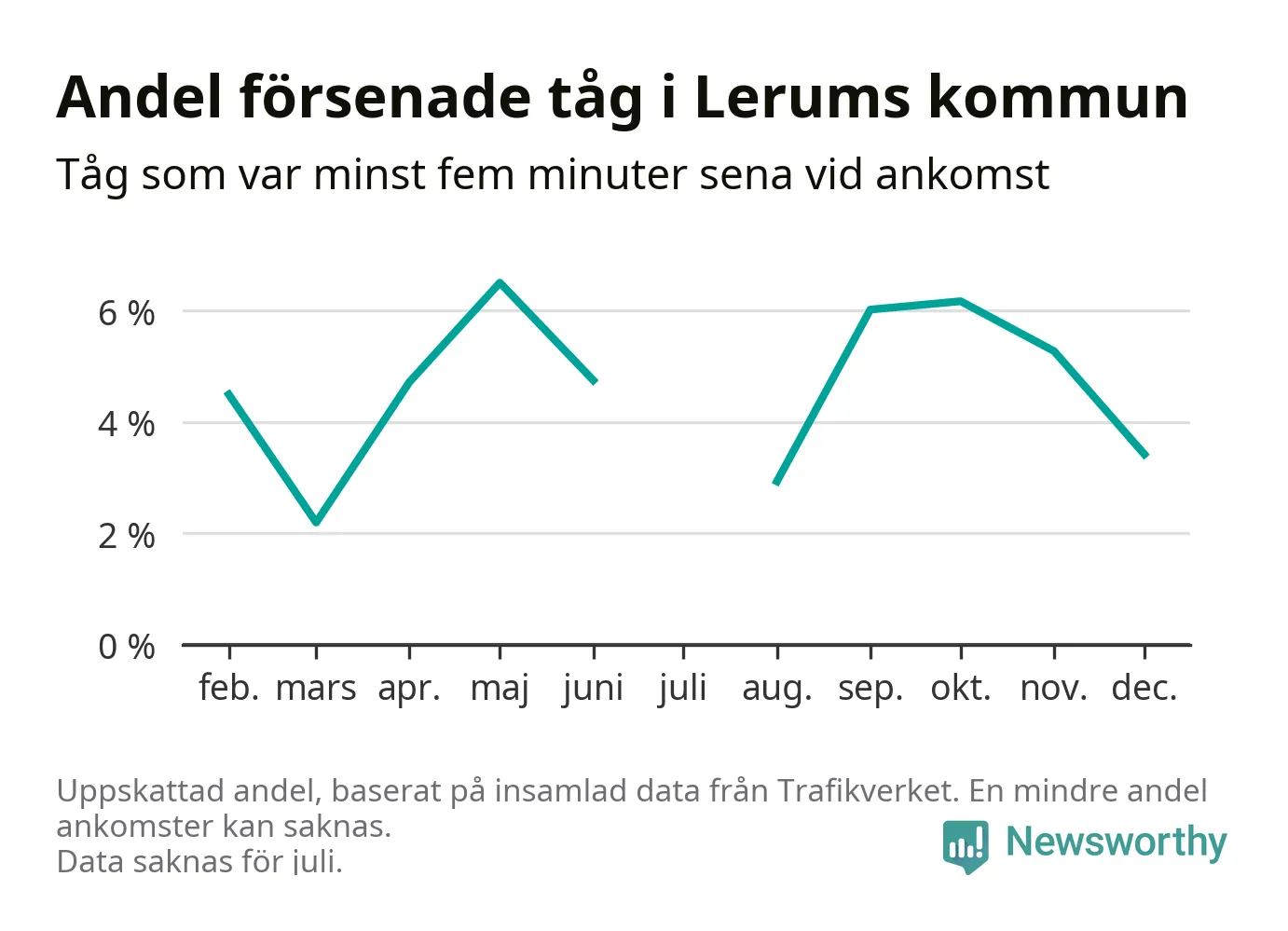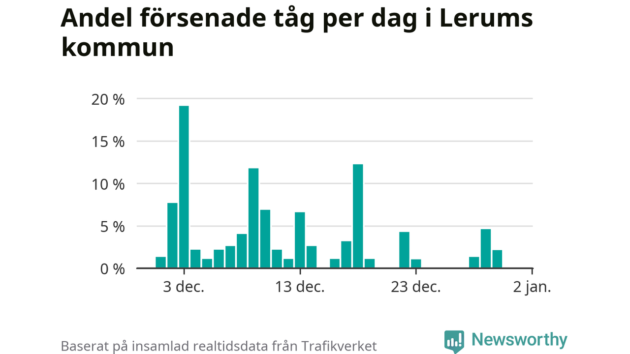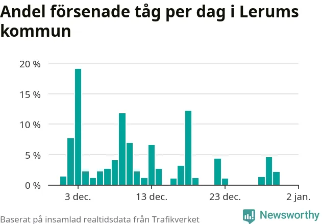 Den svenska tågtrafiken är långt från det branchgemensamma målet att 95 procent av tågen ska komma fram i tid. Newsworthy har samlat in tågens ankomsttider under december, för att se hur stor andel av tågen till Lerums kommun som var i tid under den senaste månaden.