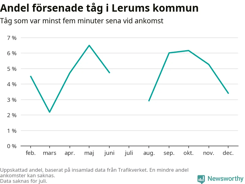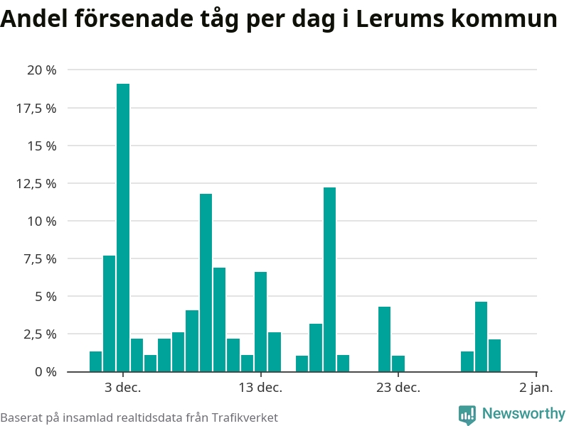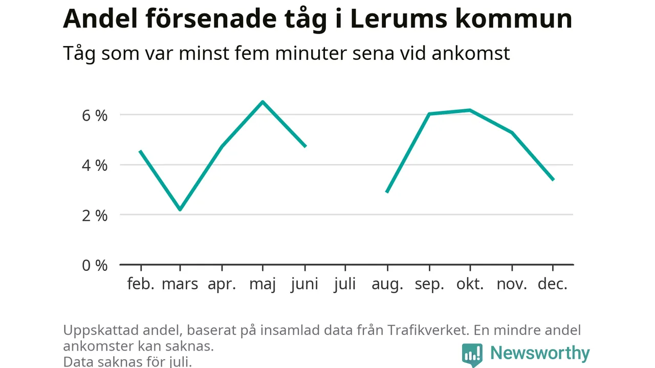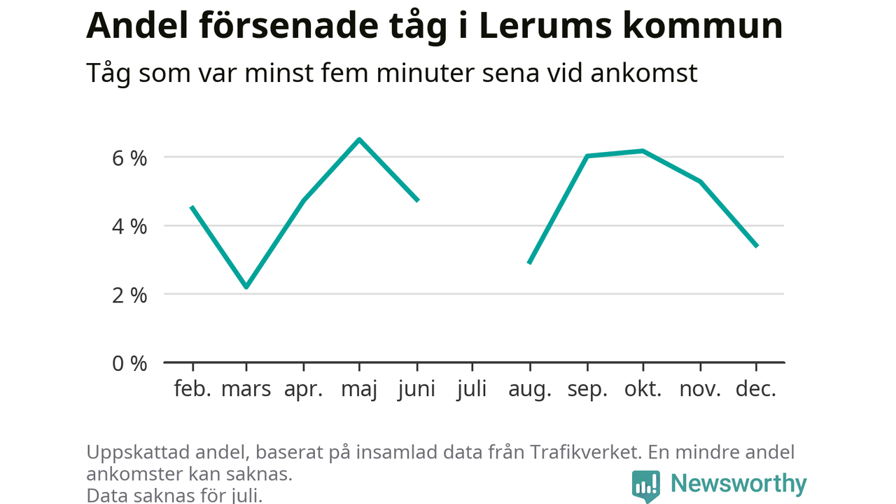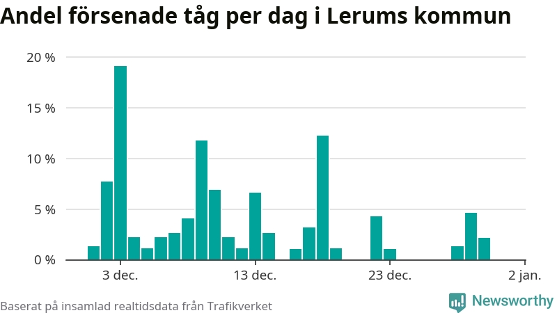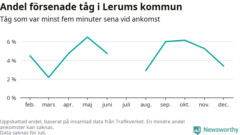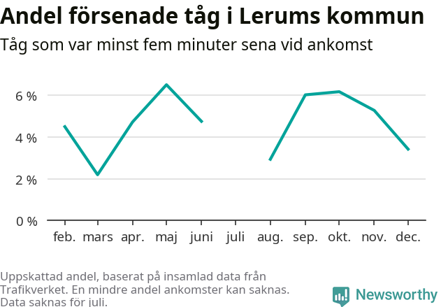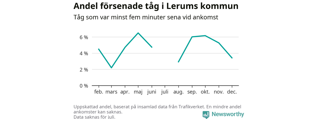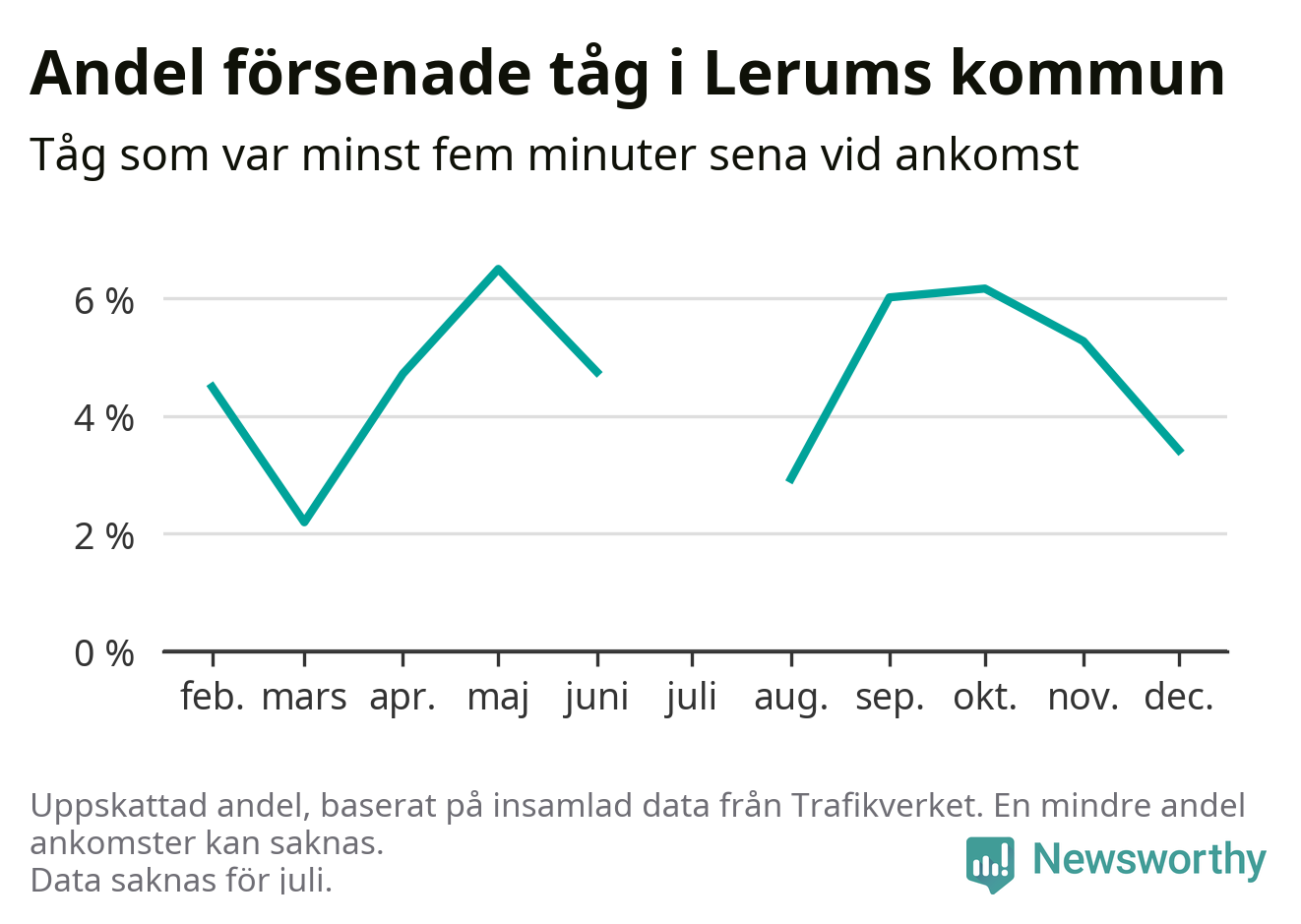 Den svenska tågtrafiken är långt från det branchgemensamma målet att 95 procent av tågen ska komma fram i tid. Newsworthy har samlat in tågens ankomsttider under december, för att se hur stor andel av tågen till Lerums kommun som var i tid under den senaste månaden.