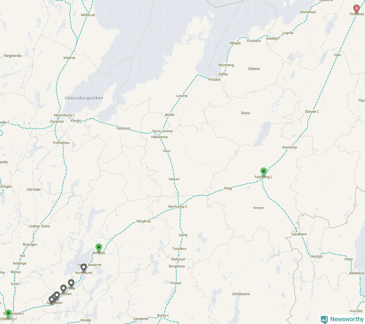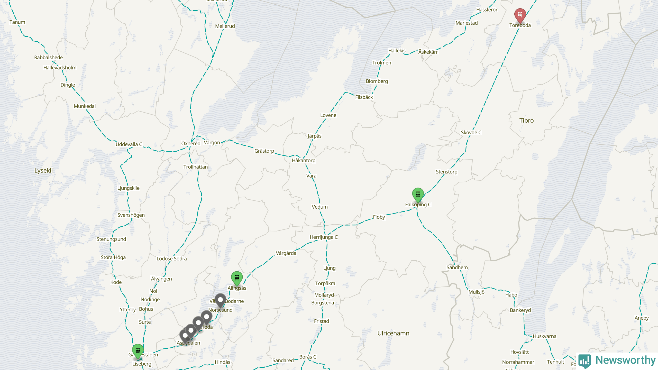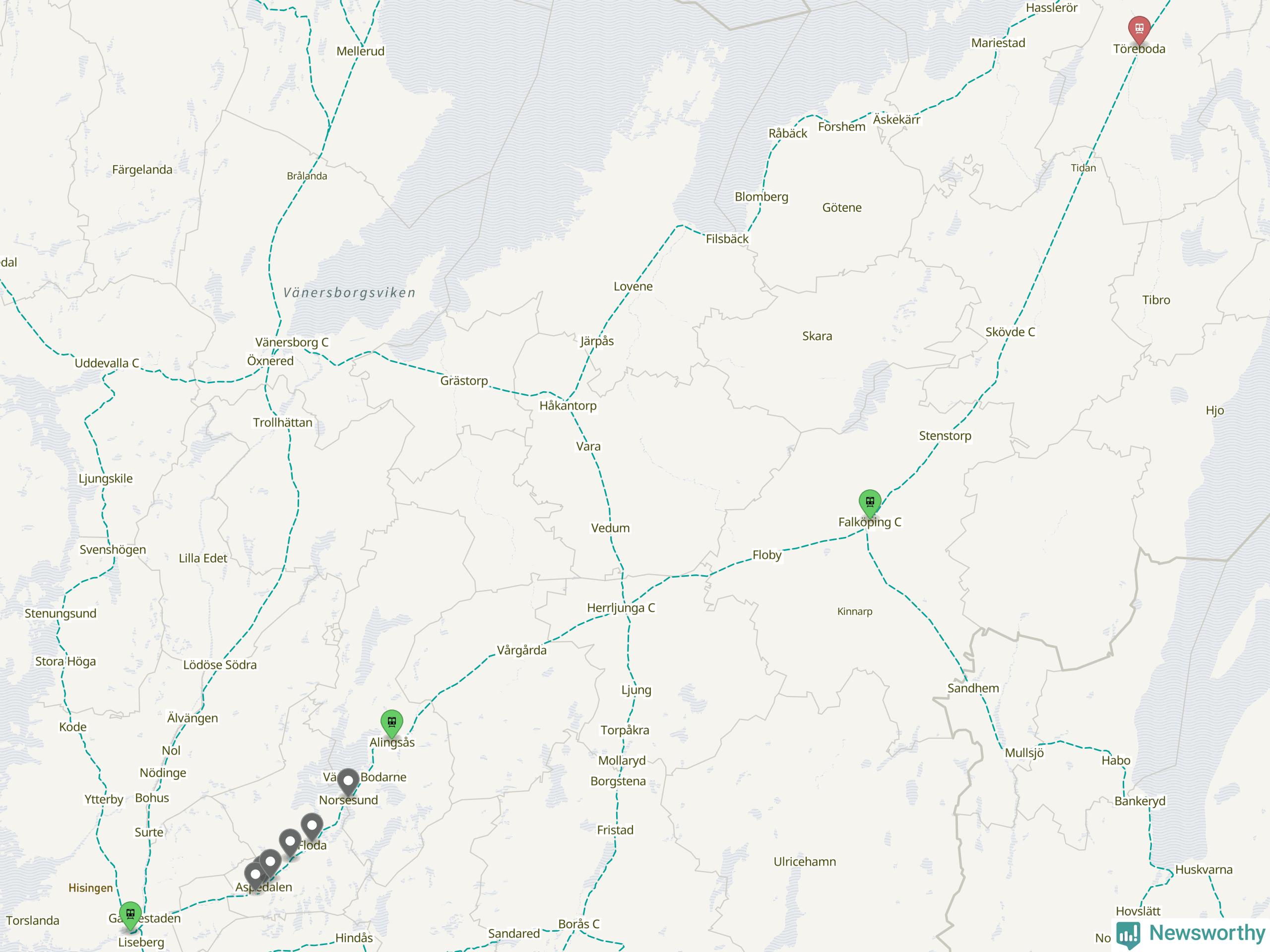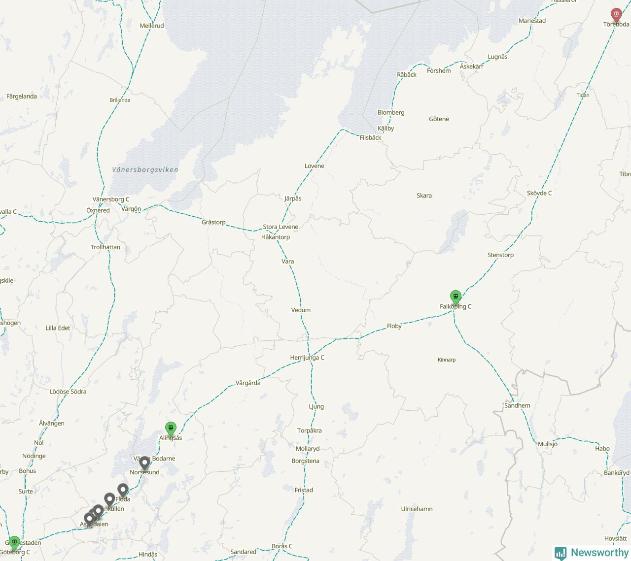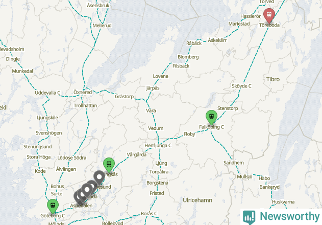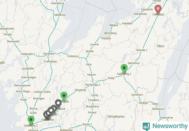 9 december 13.33–22.30olyckaStopp i tågtrafiken mellan Alingsås och Norsesund sedan kl 13:30 på grund av olycka