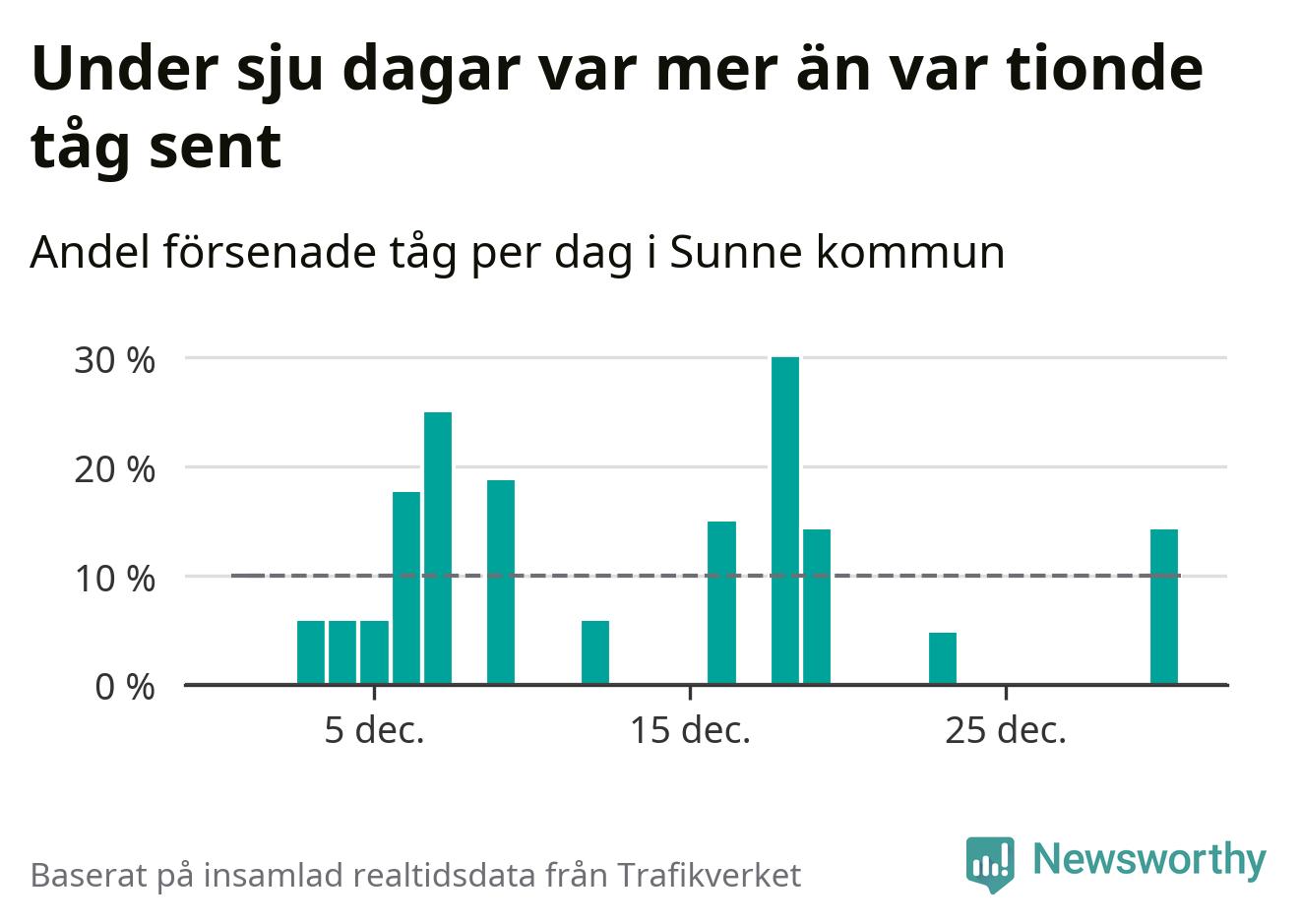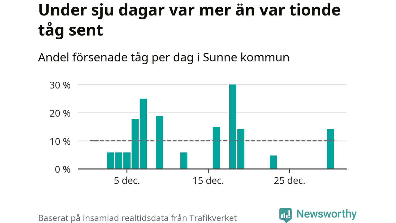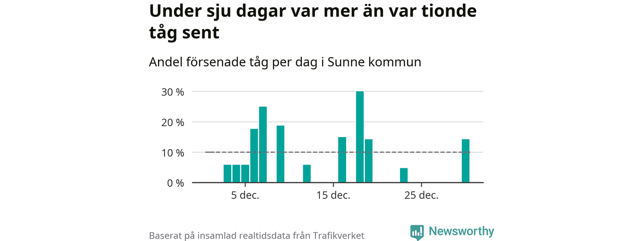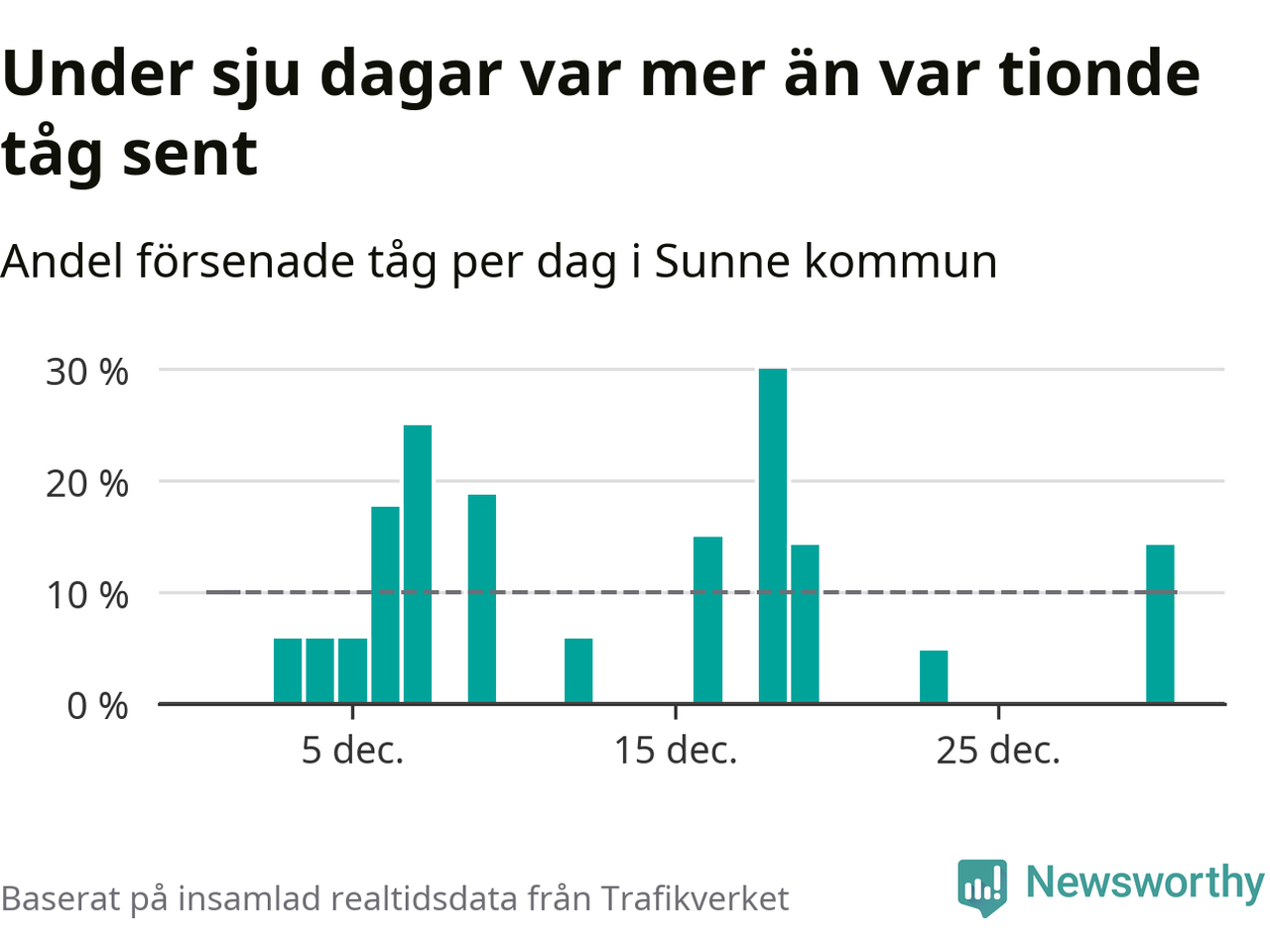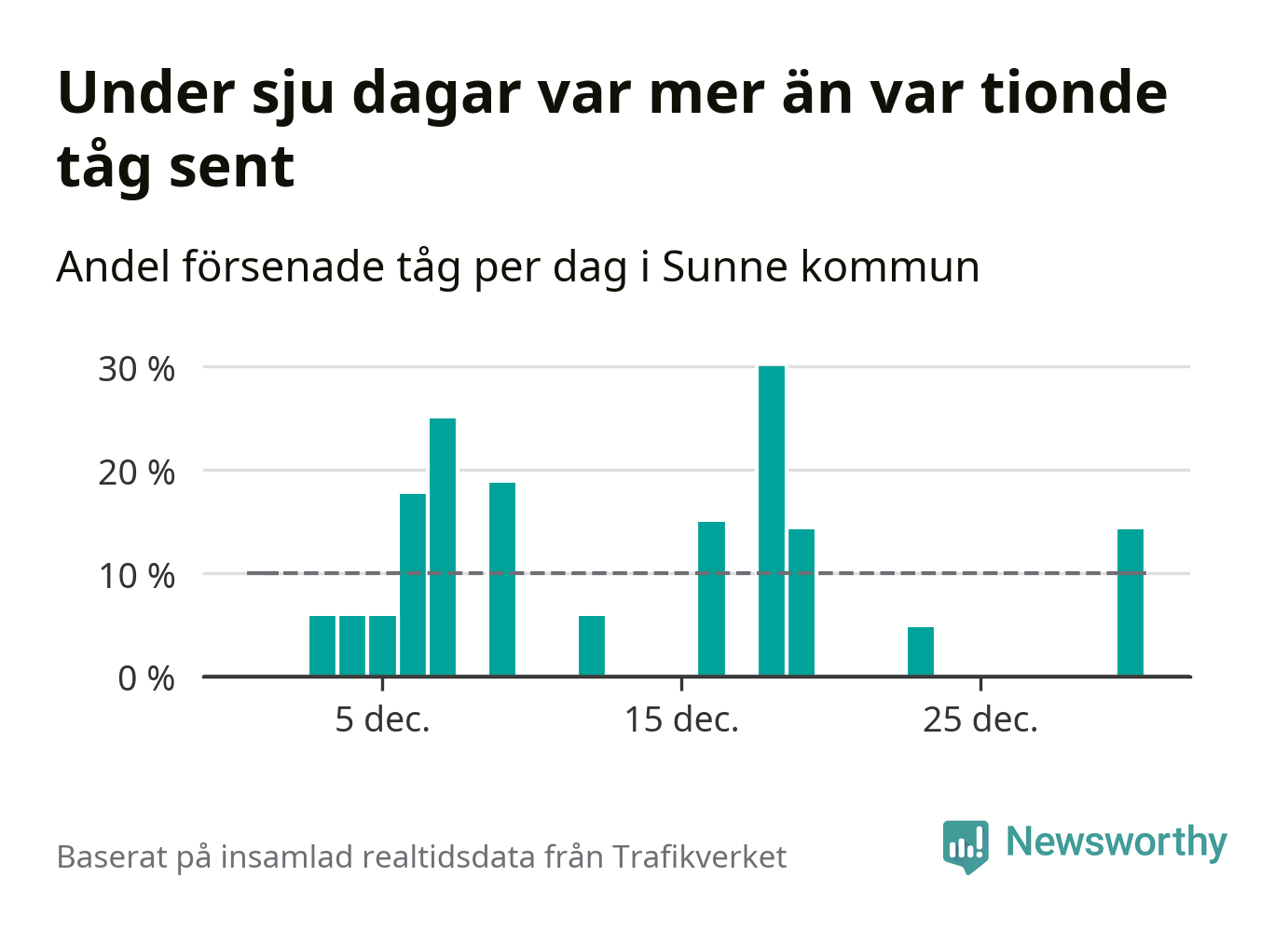 Den svenska tågtrafiken är långt från det branchgemensamma målet att 95 procent av tågen ska komma fram i tid. Newsworthy har samlat in tågens ankomsttider under december, för att se hur stor andel av tågen till Sunne kommun som var i tid under den senaste månaden.